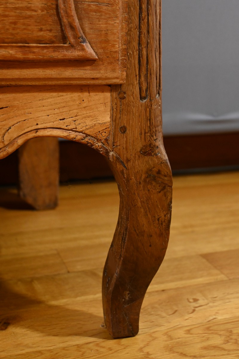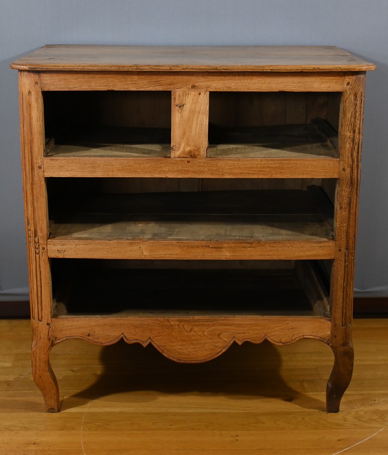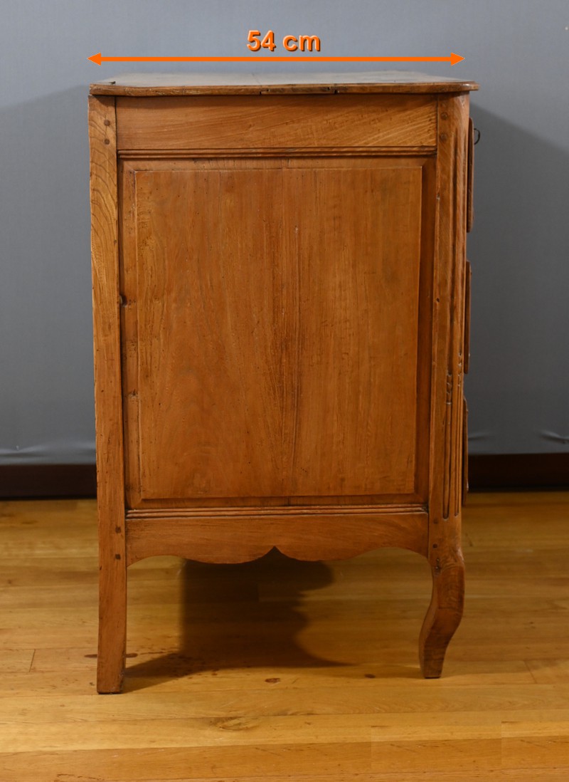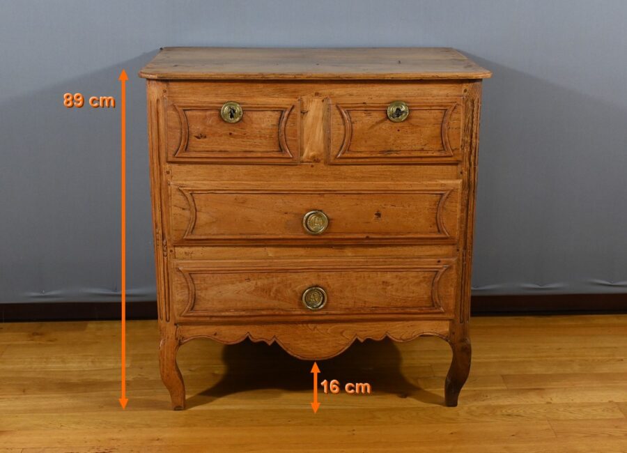 La traverse chantournée et les pieds avant galbés en chêne complètent l’ensemble, conférant à la commode une allure élégante et raffinée.
