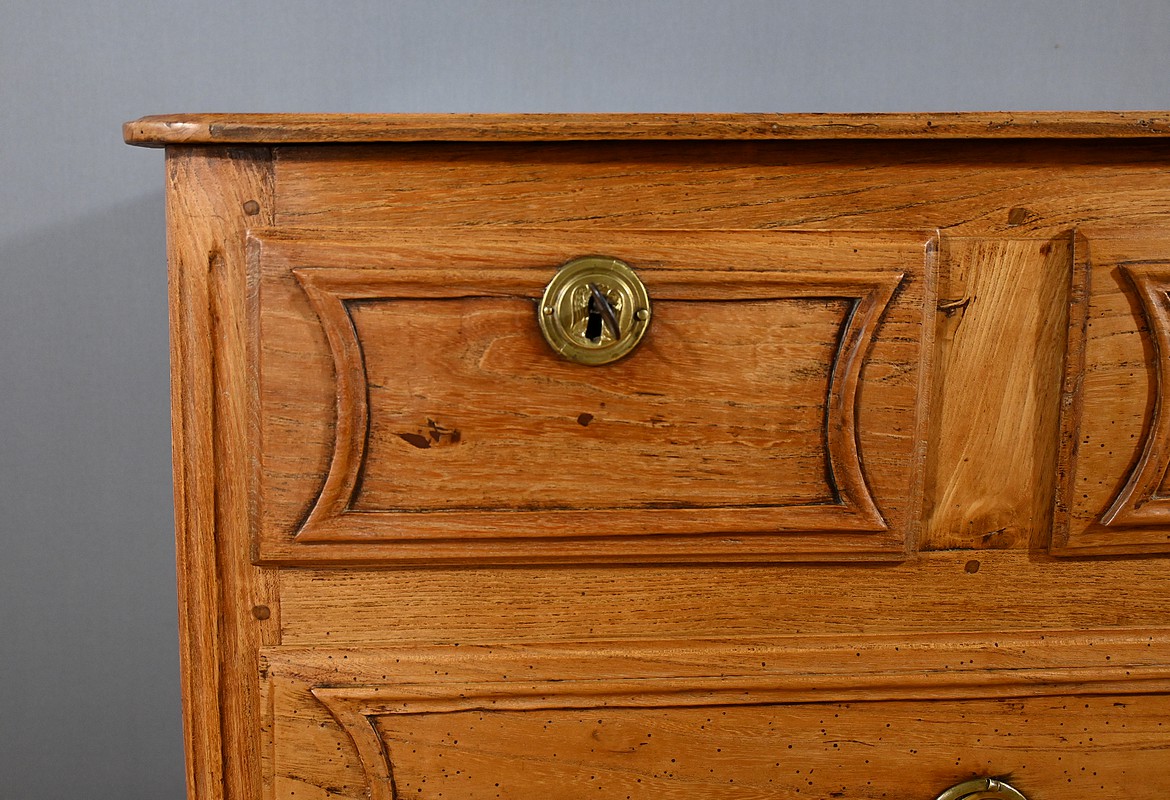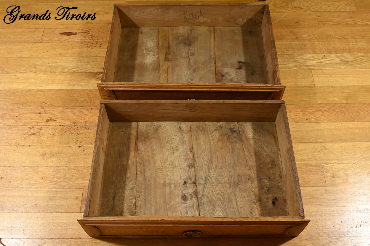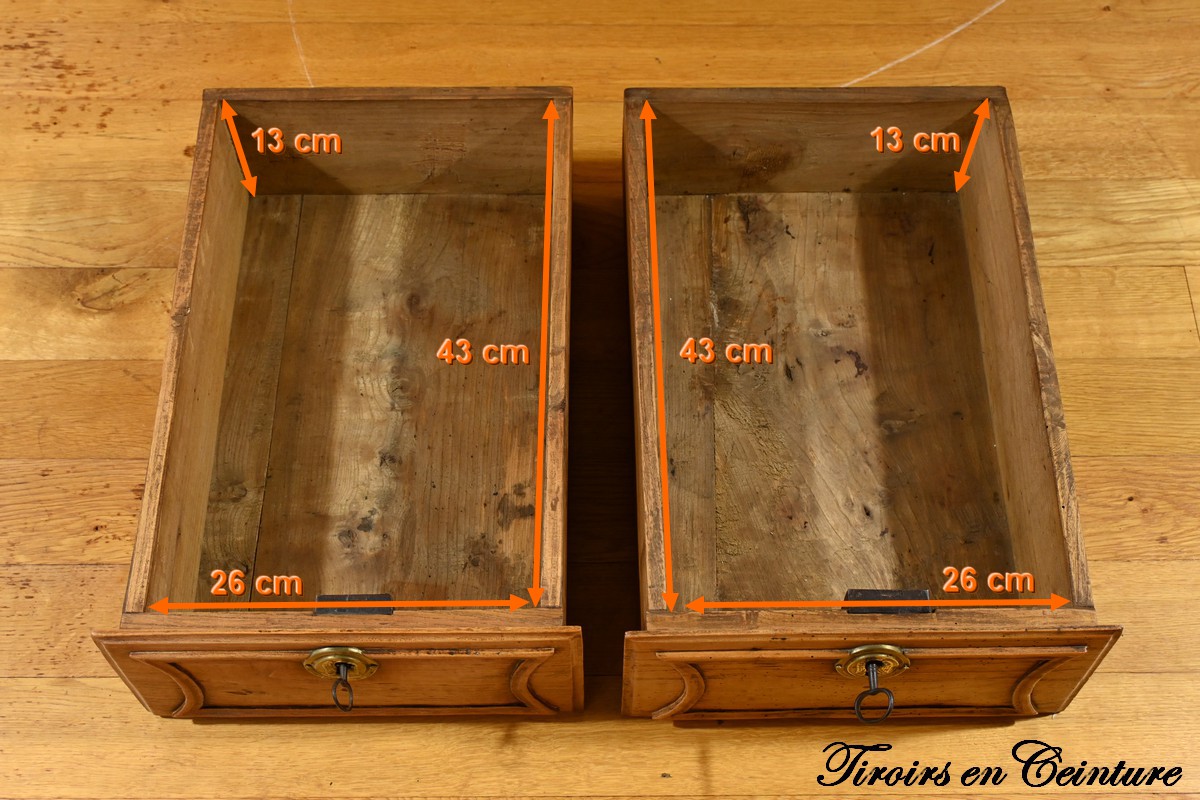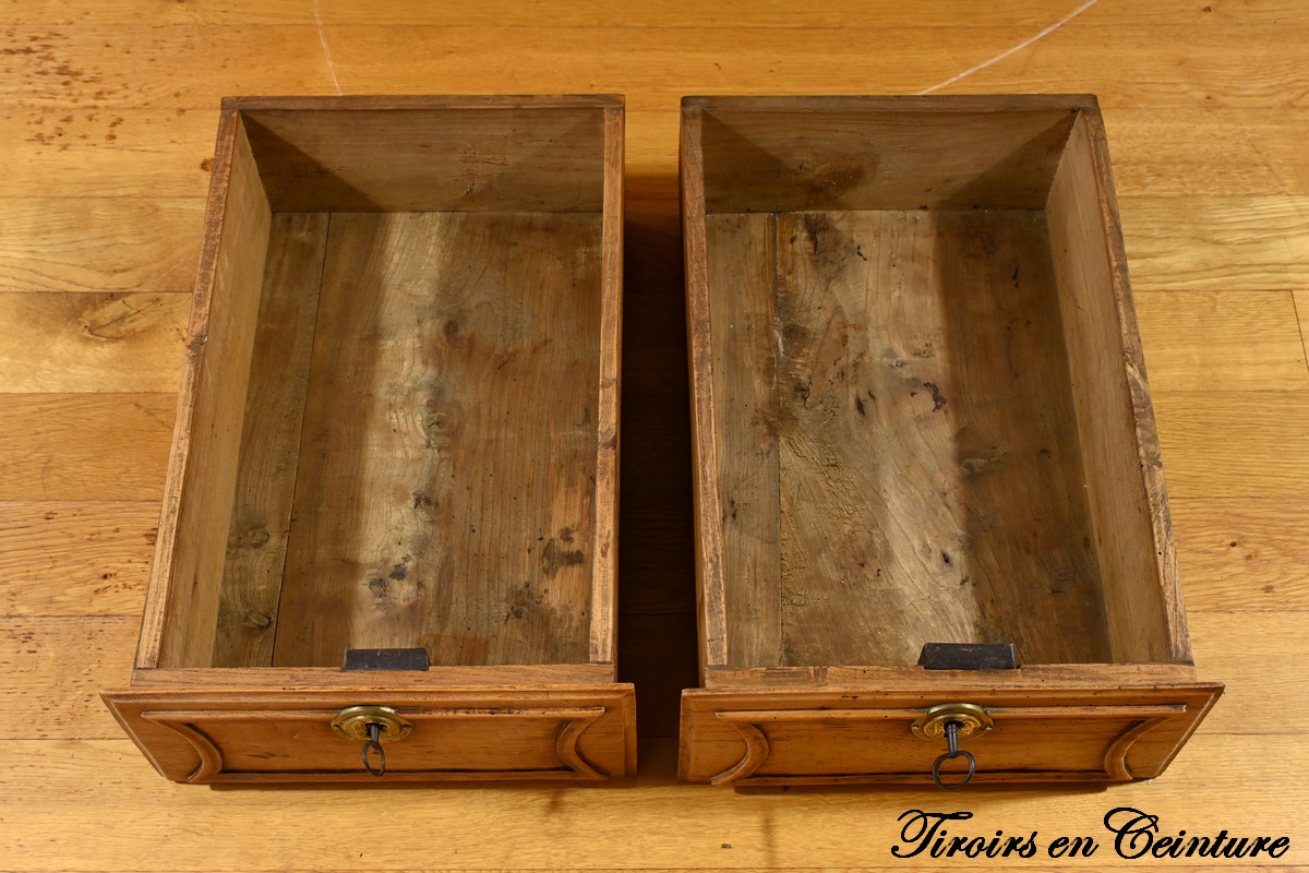 La commode s’ouvre par deux tiroirs en ceinture, chacun équipé d’une serrure authentique, témoignant de l’attention portée aux détails et à la sécurité à l’époque.