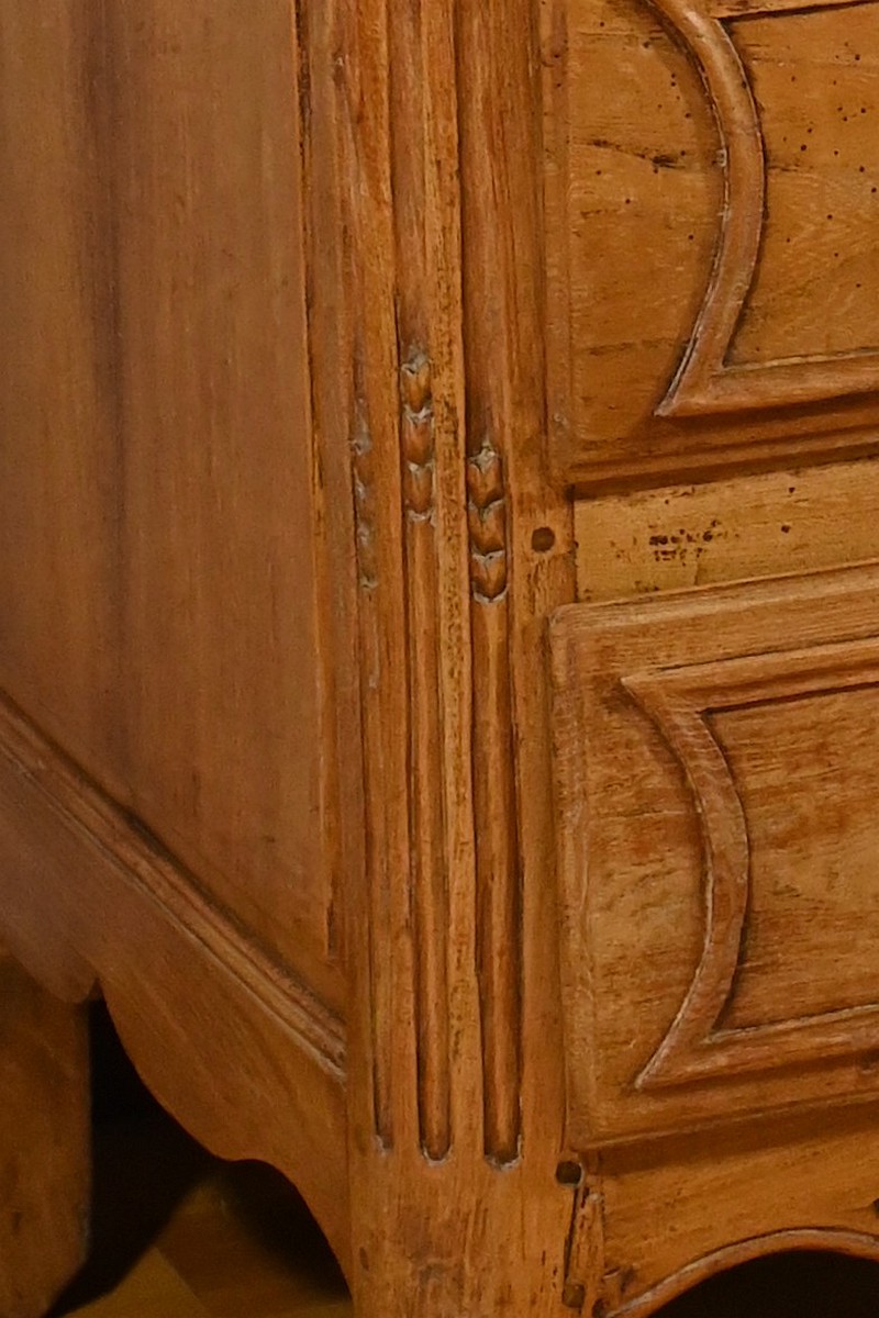 Les montants de la commode sont cannelés, une caractéristique typique du style Louis XIV, qui met en valeur la verticalité et la structure du meuble.
