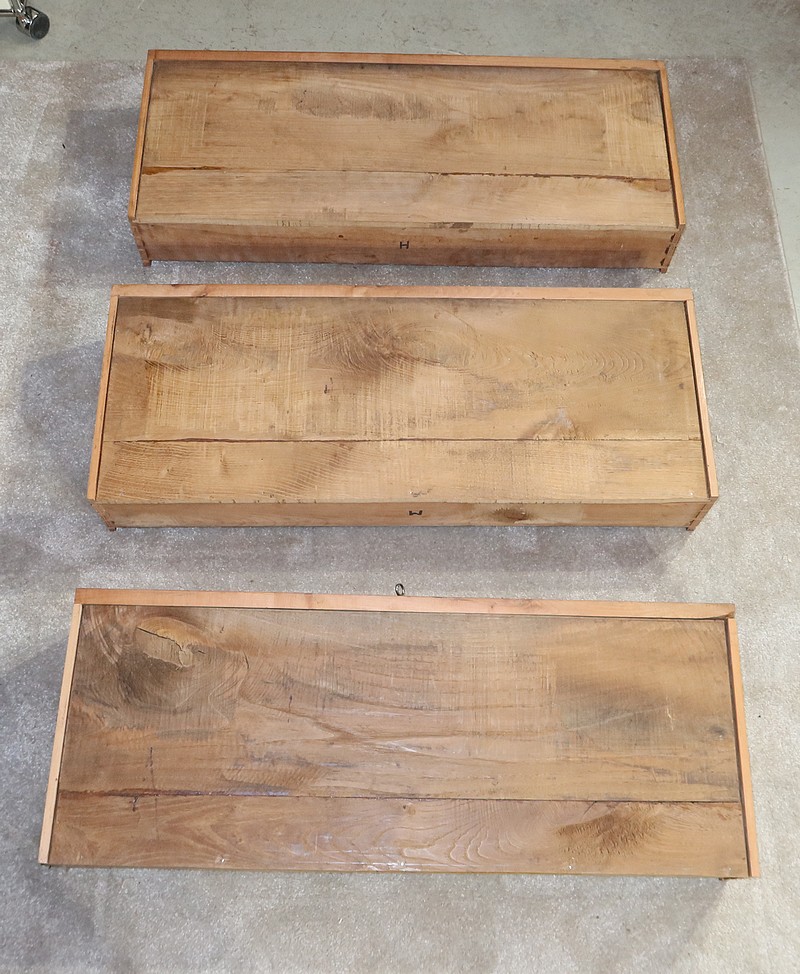 Ce mobilier comporte un tiroir en ceinture et en débord, se tirant par une gorge au dessous. En retrait, trois tiroirs identiques avec deux boutons en bronze ciselé de forme cuvette permettent l’ouverture. Au milieu de chaque tiroir, une entrée en bronze accompagne une serrure d’origine en état de fonctionnement avec trois clés rapportées et ajustées.