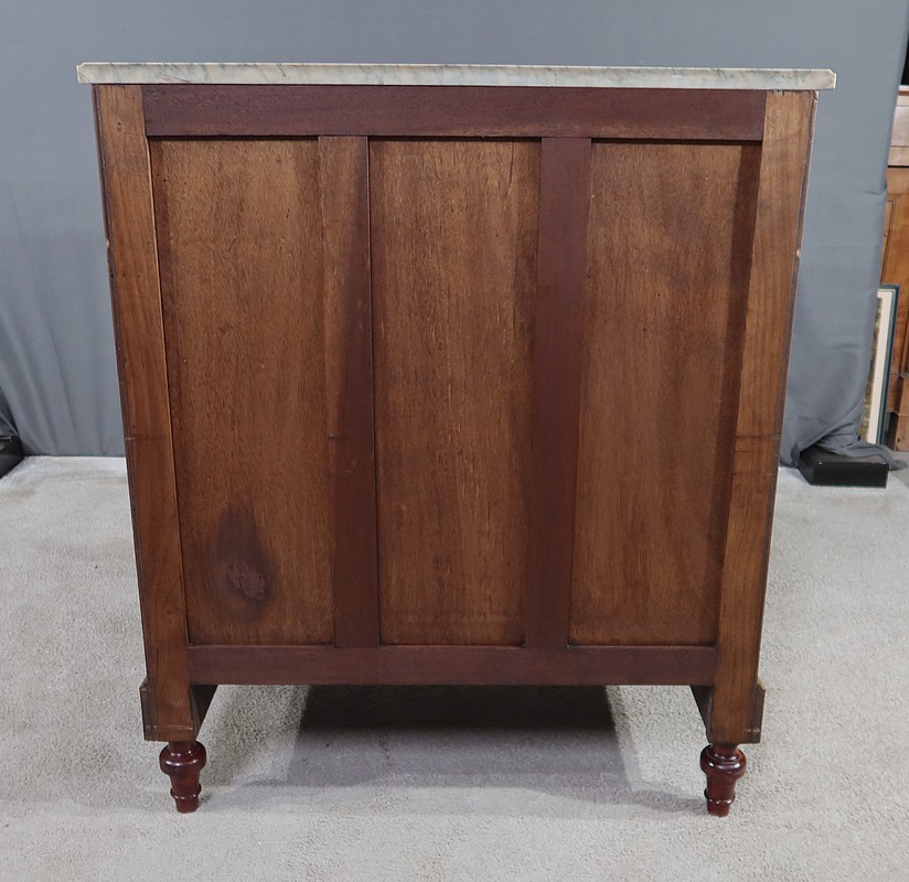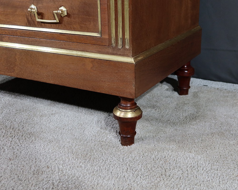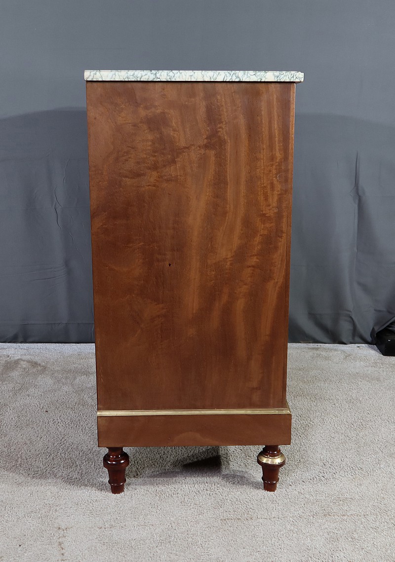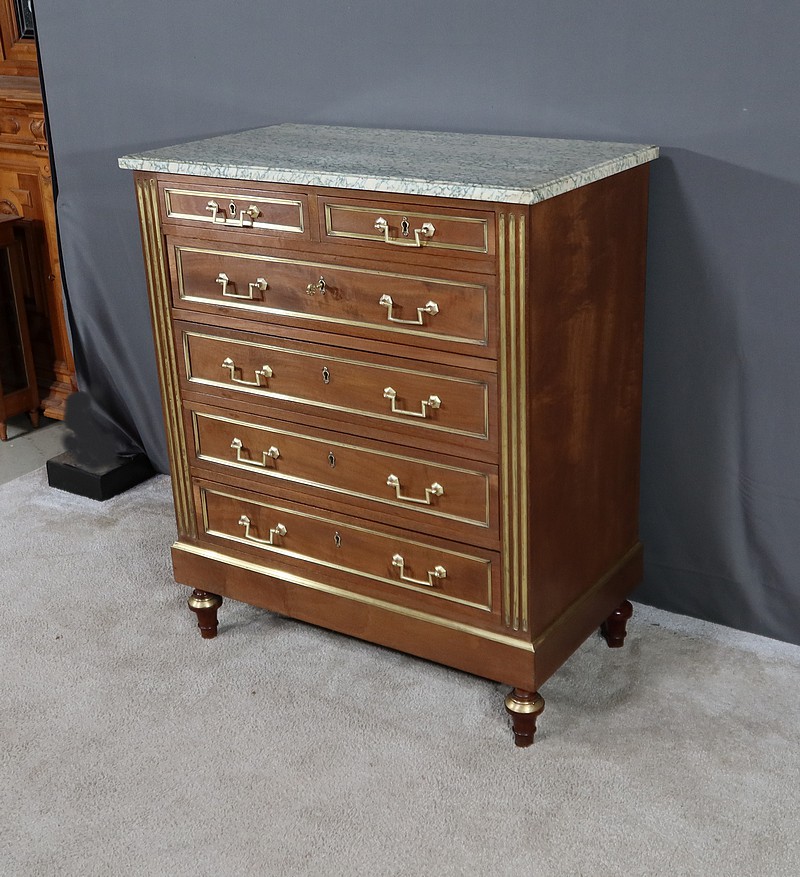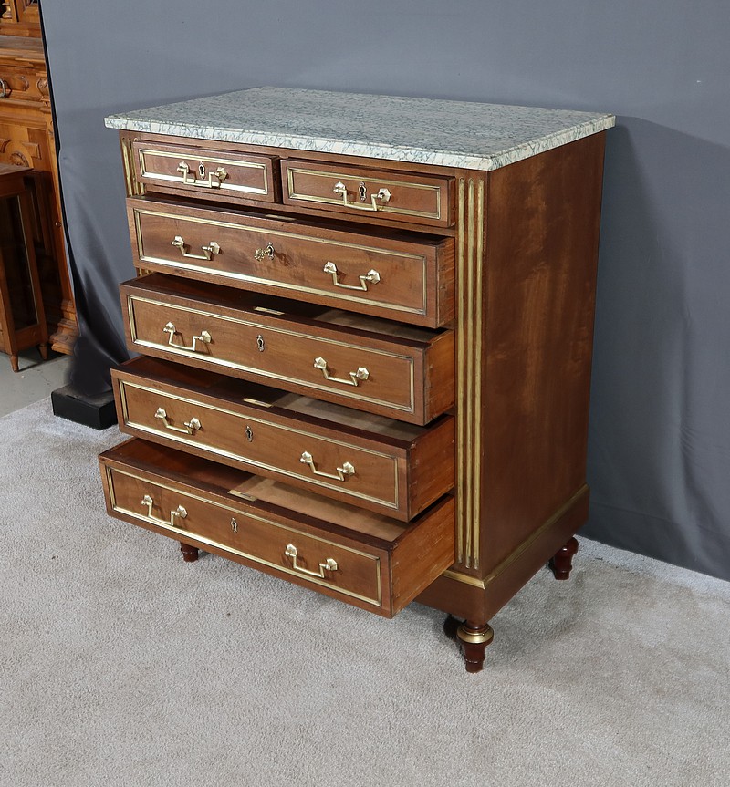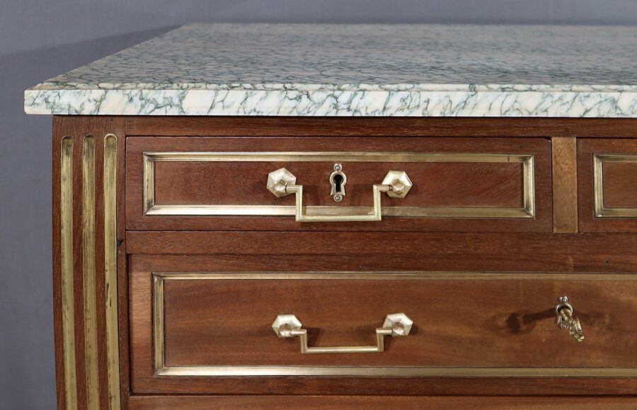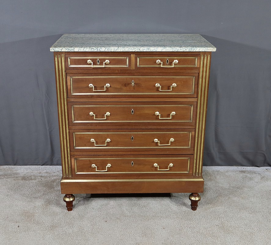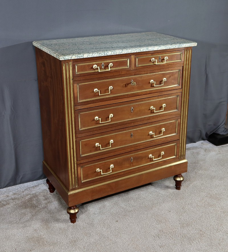 Petite commode en acajou de style Louis XVI sommée d’un marbre vert d’Estours muni d’une gorge et ouvrant par six tiroirs. Ces derniers possèdent une façade à défoncement incrustée de baguettes moulurées en laiton. Elles forment un cadre entourant les poignées de tirage tombantes de style louis XVI équipant chacun de ces tiroirs. Ils possèdent également une serrure en état de fonctionnement avec entrée filet. De chaque côté les montants sont incrustés de trois larges cannelures garnies de laiton. Ce meuble possède une traverse basse avec moulure supérieure en laiton et repose sur deux pieds avant toupie dotés d’une collerette laiton en partie haute.