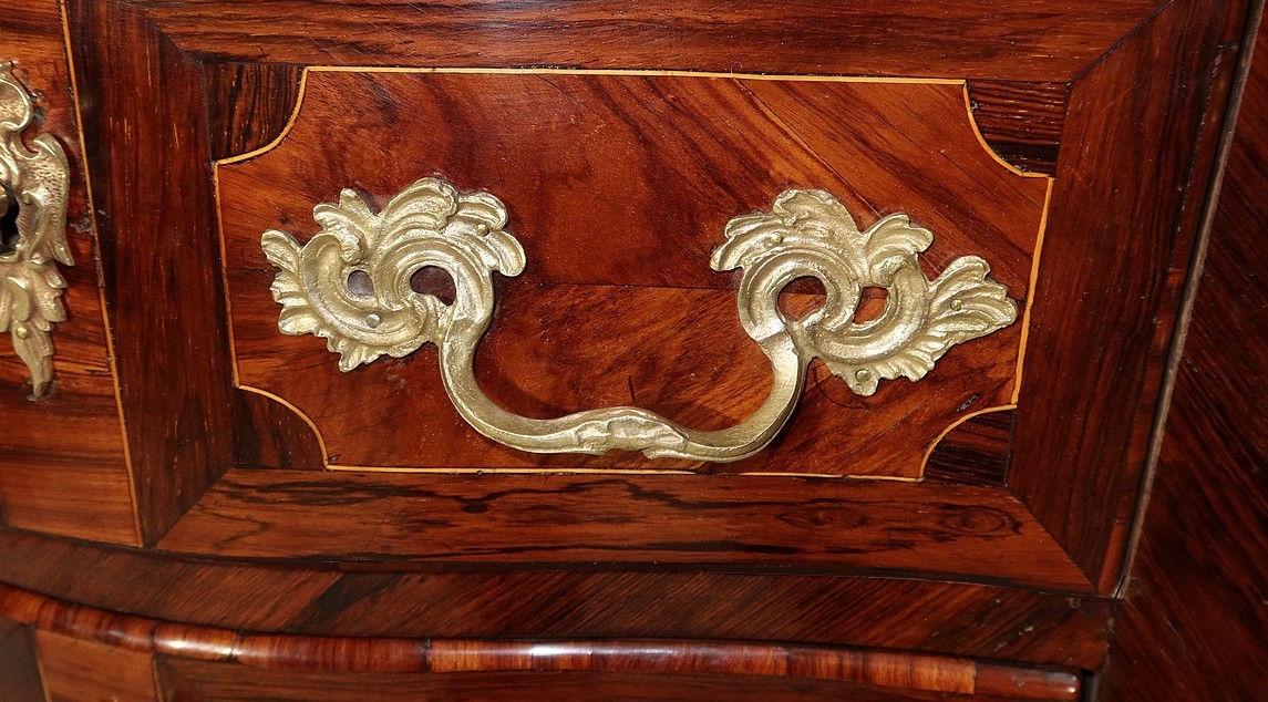 Cette commode à mouvements, comporte deux hauts tiroirs dont la façade galbée est marquetée, à ses deux extrémités, de bois de rose disposé en frise, entouré d’un filet de citronnier aux angles concaves, et encadré d’un pourtour en amarante. De chaque côté, d’importantes poignées de tirages d’origine en bronze sculpté, sont accompagnées d’une entrée de serrure feuillagée en bronze d’origine également. La clé, postérieure au XVIIIe siècle, est en état de fonctionnement.