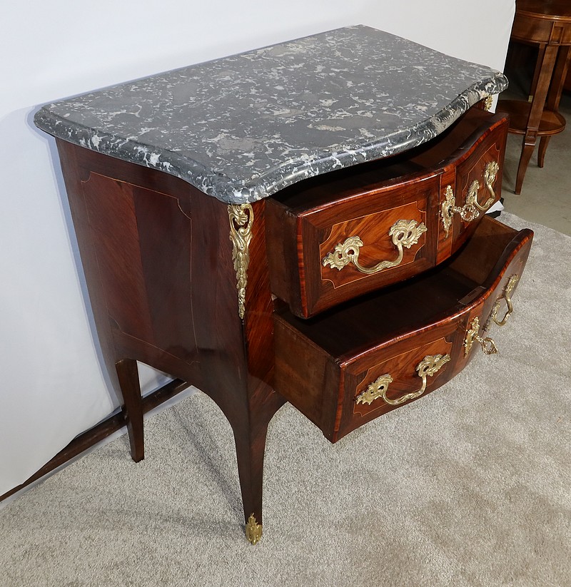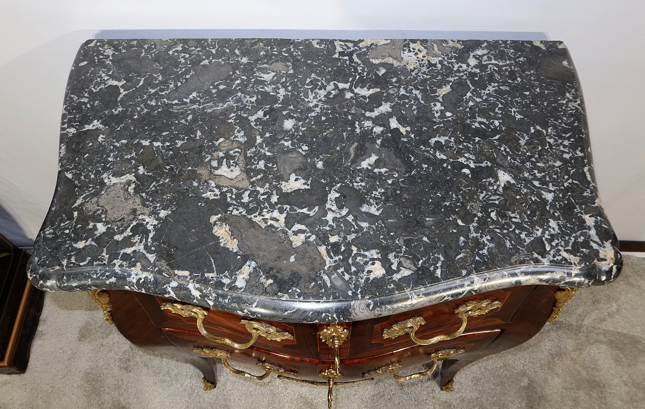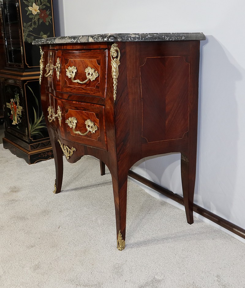 Magnifique commode « Tombeau » réalisée par un maître ébéniste parisien, en bois de rose, amarante, acajou et citronnier, agrémentée d’ornementations en bronze et sommée d’un épais Marbre gris Sainte Anne Belge. Ce marbre d’origine, entouré d’un bec de corbin, épouse parfaitement les formes du meuble.