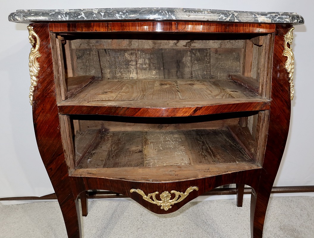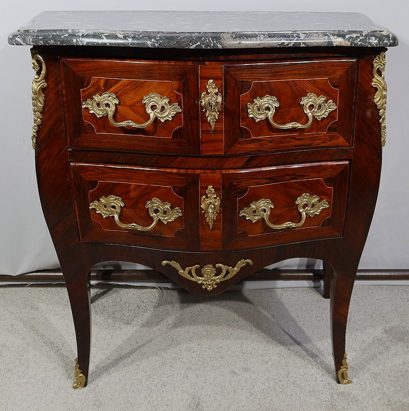 Raffinée et élégante, cette commode de qualité parisienne, vous ravira par ses ornementations de bronze doré à décor feuillagé, ses formes sinueuses et son petit dimensionnel.