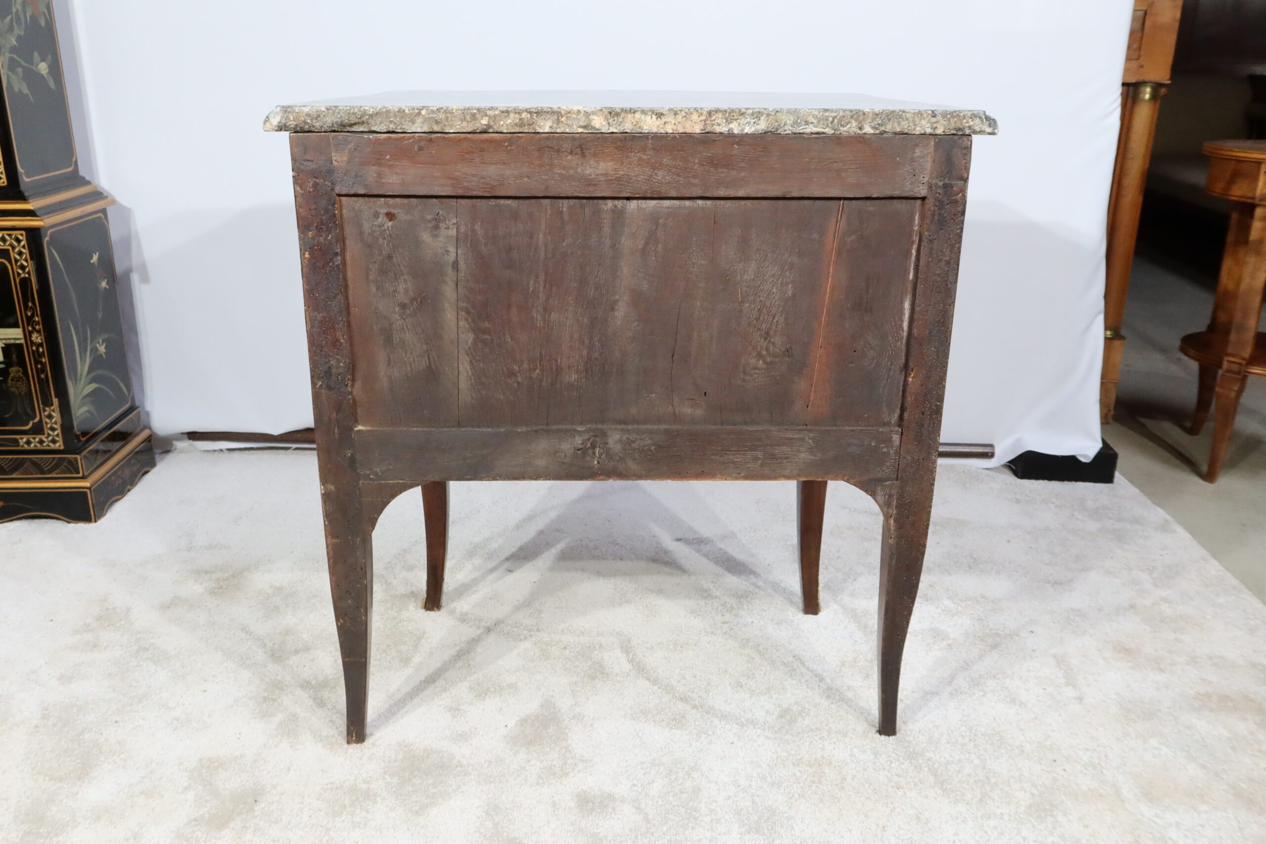 Les fonds et côtés de tiroirs ainsi que l’arrière de la commode sont en chêne. Nous retrouvons un cache-poussière entre les tiroirs.