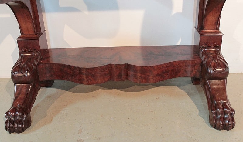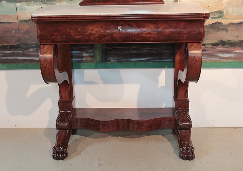 Console-Coiffeuse Restauration en acajou massif pour les pieds et placage d’acajou. Dessus de marbre blanc surmonté d’un miroir octogonal inclinable.