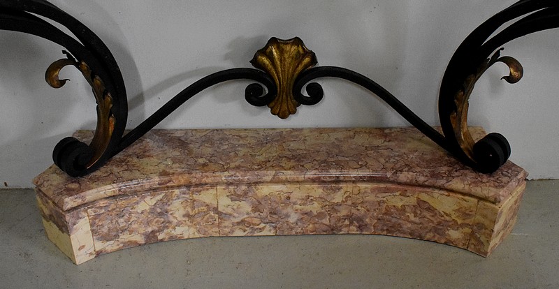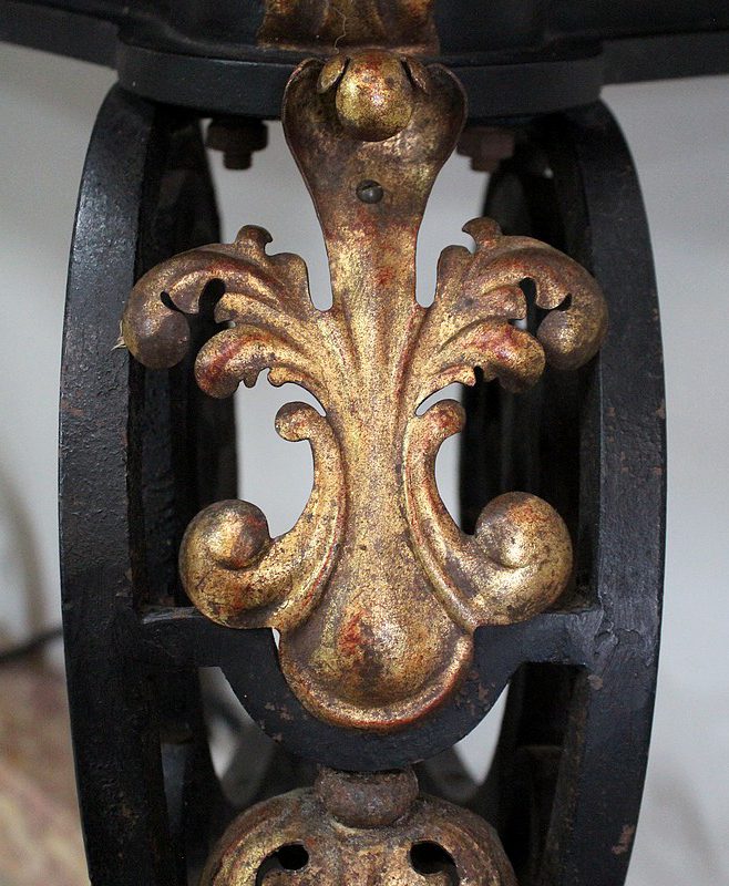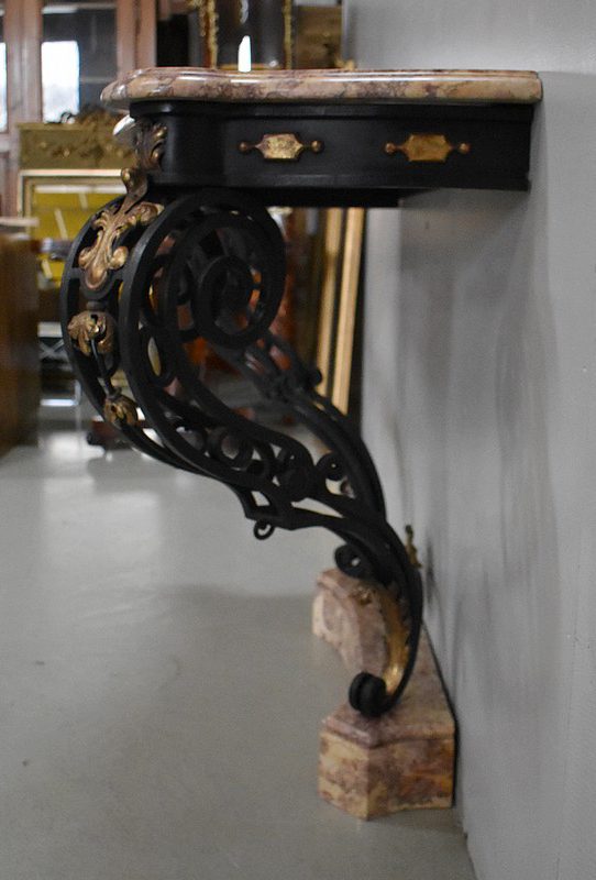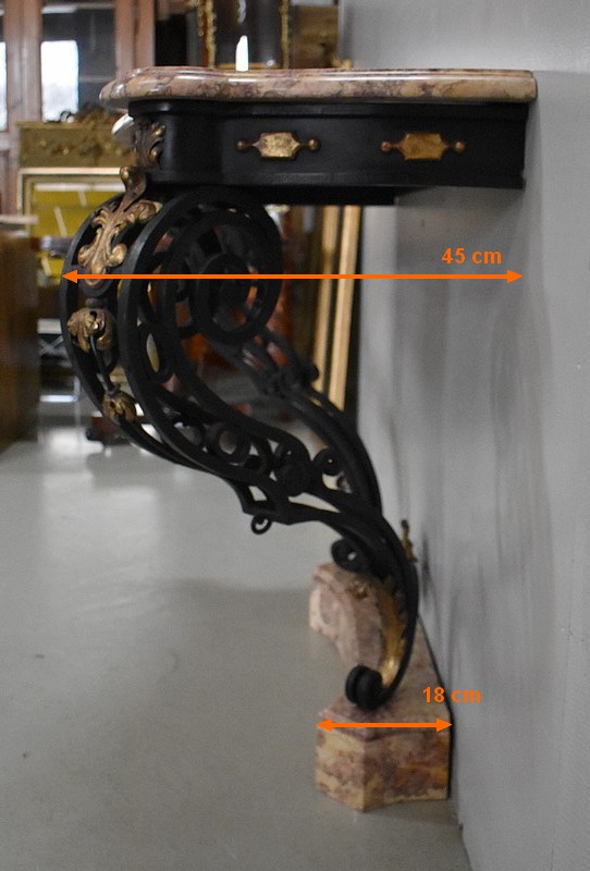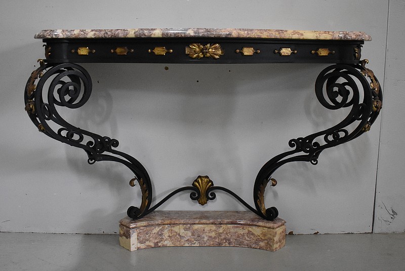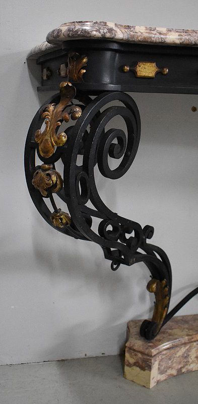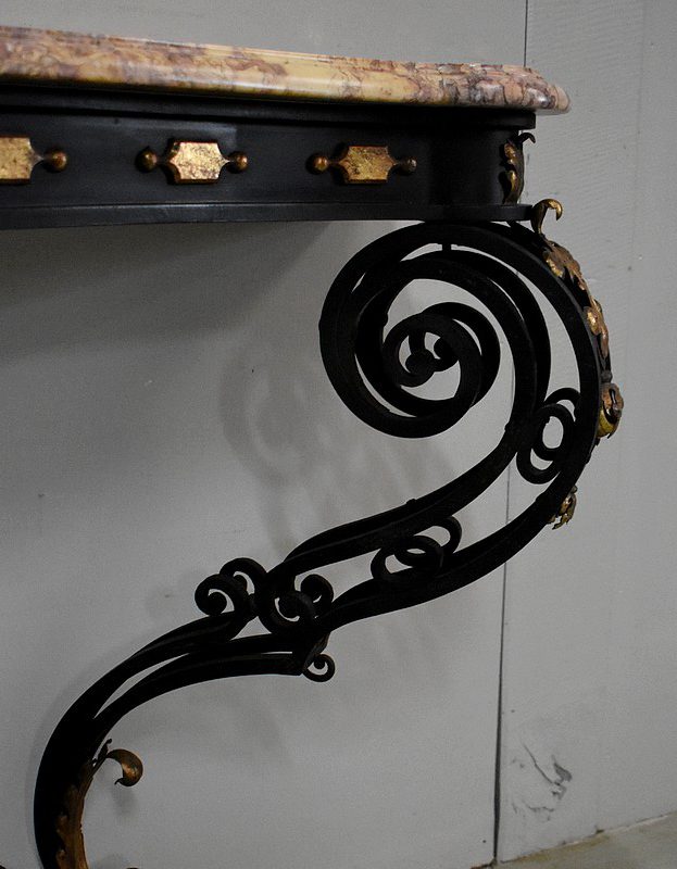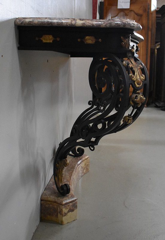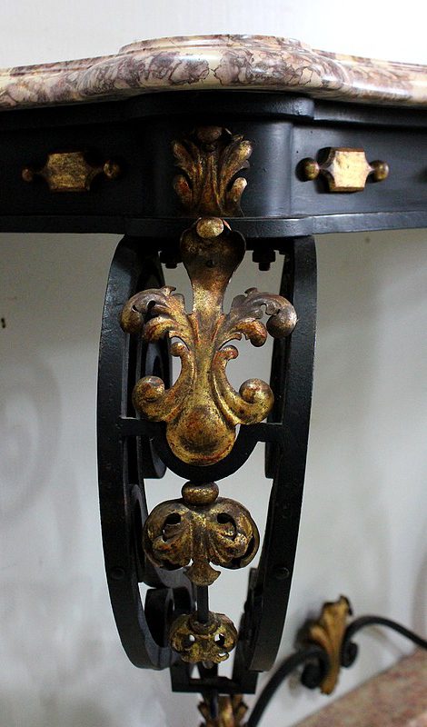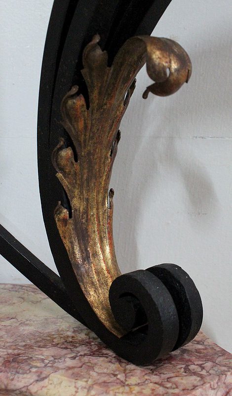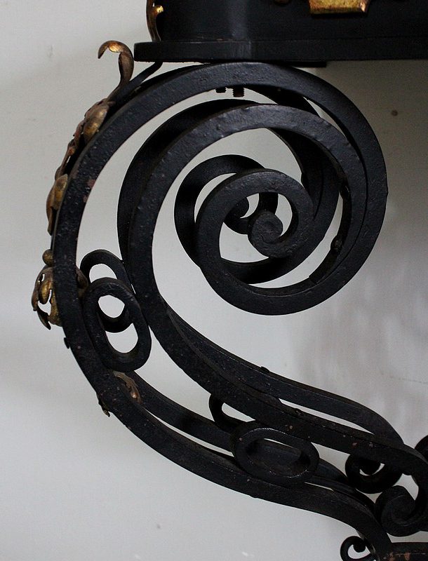 La structure de ce Meuble est en Fer Forgé Patiné de couleur Noire, faisant ressortir les Décors Dorés qui l’enjolivent. Ainsi le bandeau est agrémenté de plaques géométriques sur ses trois faces, et d’un motif avec Fleur au centre. Cette Console est également composée de deux pieds à grandes Volutes en parties hautes, et terminés par des enroulements plus Sobres en partie basse. Ces deux jambes Élégantes, ornées de Feuilles d’Acanthe et autres végétaux Dorés, sont reliées entre elles par un dernier élément de Fer, enrichi au centre d’une Jolie Coquille.