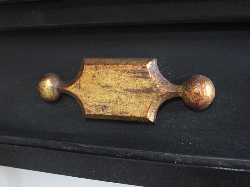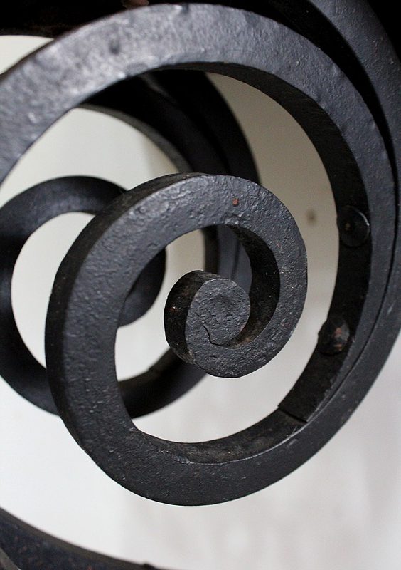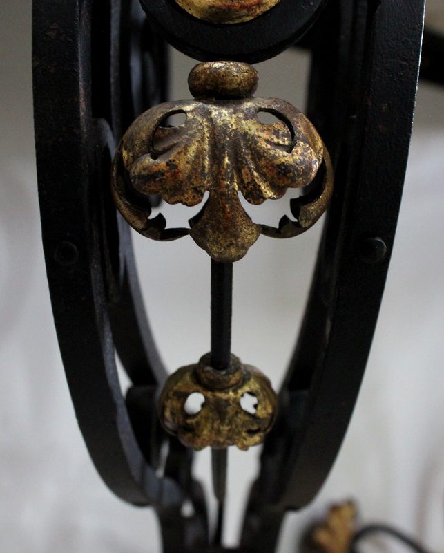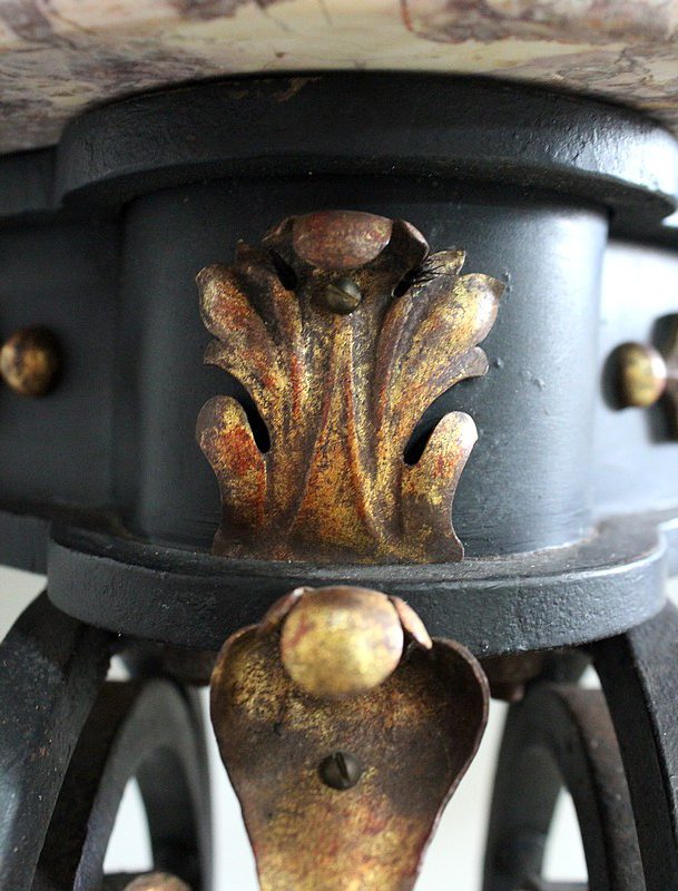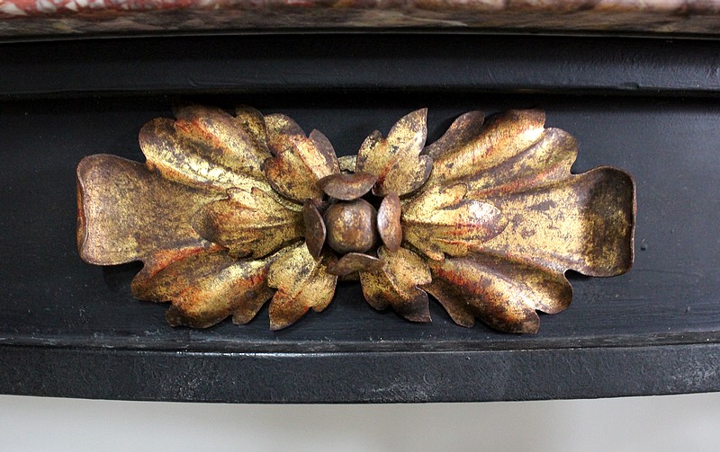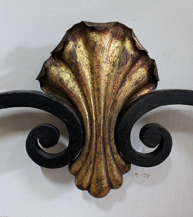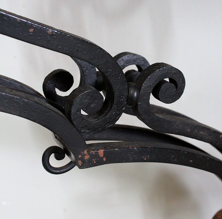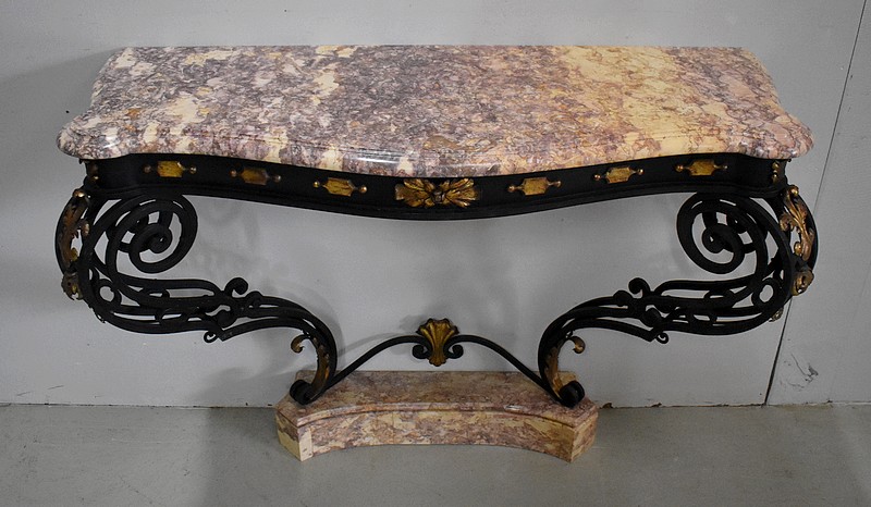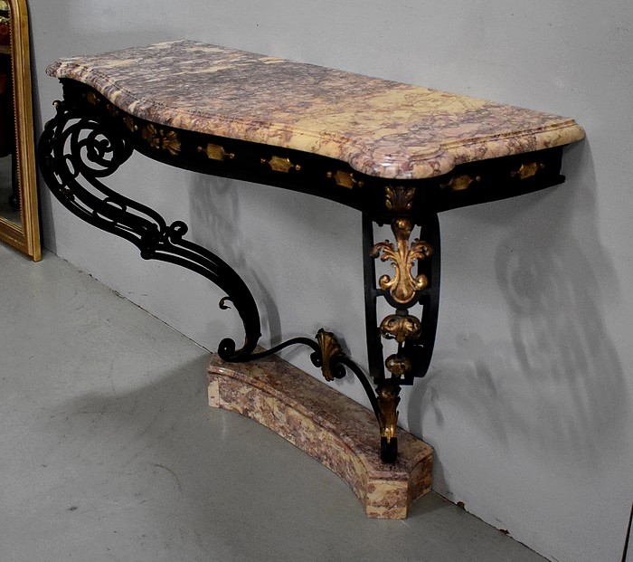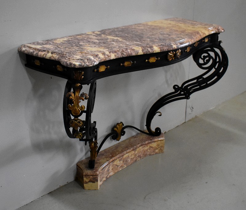 La structure de ce Meuble est en Fer Forgé Patiné de couleur Noire, faisant ressortir les Décors Dorés qui l’enjolivent. Ainsi le bandeau est agrémenté de plaques géométriques sur ses trois faces, et d’un motif avec Fleur au centre. Cette Console est également composée de deux pieds à grandes Volutes en parties hautes, et terminés par des enroulements plus Sobres en partie basse. Ces deux jambes Élégantes, ornées de Feuilles d’Acanthe et autres végétaux Dorés, sont reliées entre elles par un dernier élément de Fer, enrichi au centre d’une Jolie Coquille.