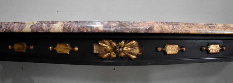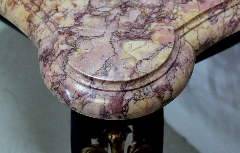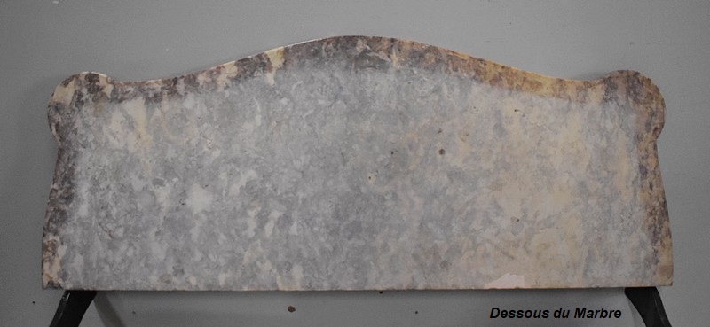 Ce dernier est Mouluré en Gorge et Bec de Corbin sur son pourtour, et ses angles avant sont taillés à ressauts arrondis. La forme de ce Marbre épouse Harmonieusement celle de la Console et de la ceinture Mouvementée sur laquelle il repose.