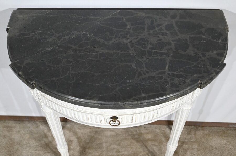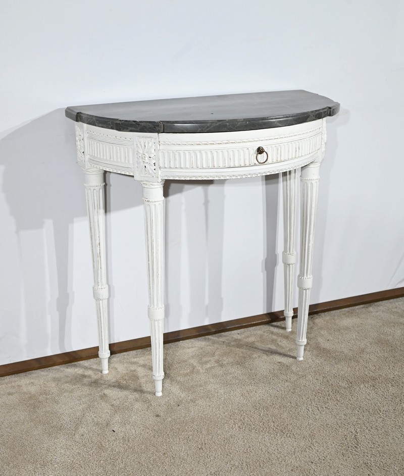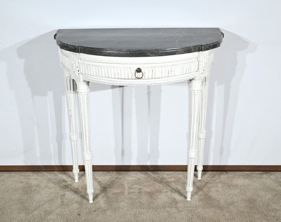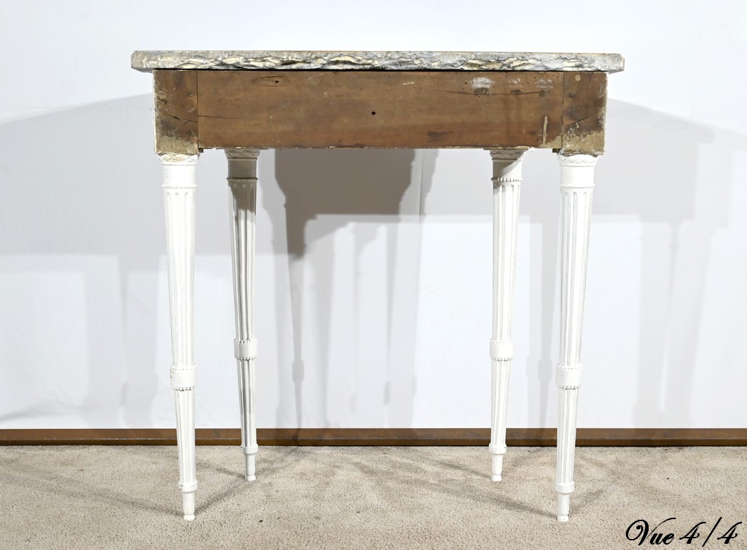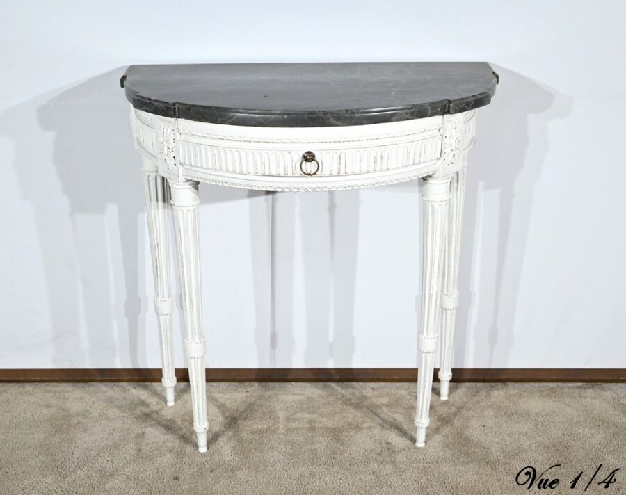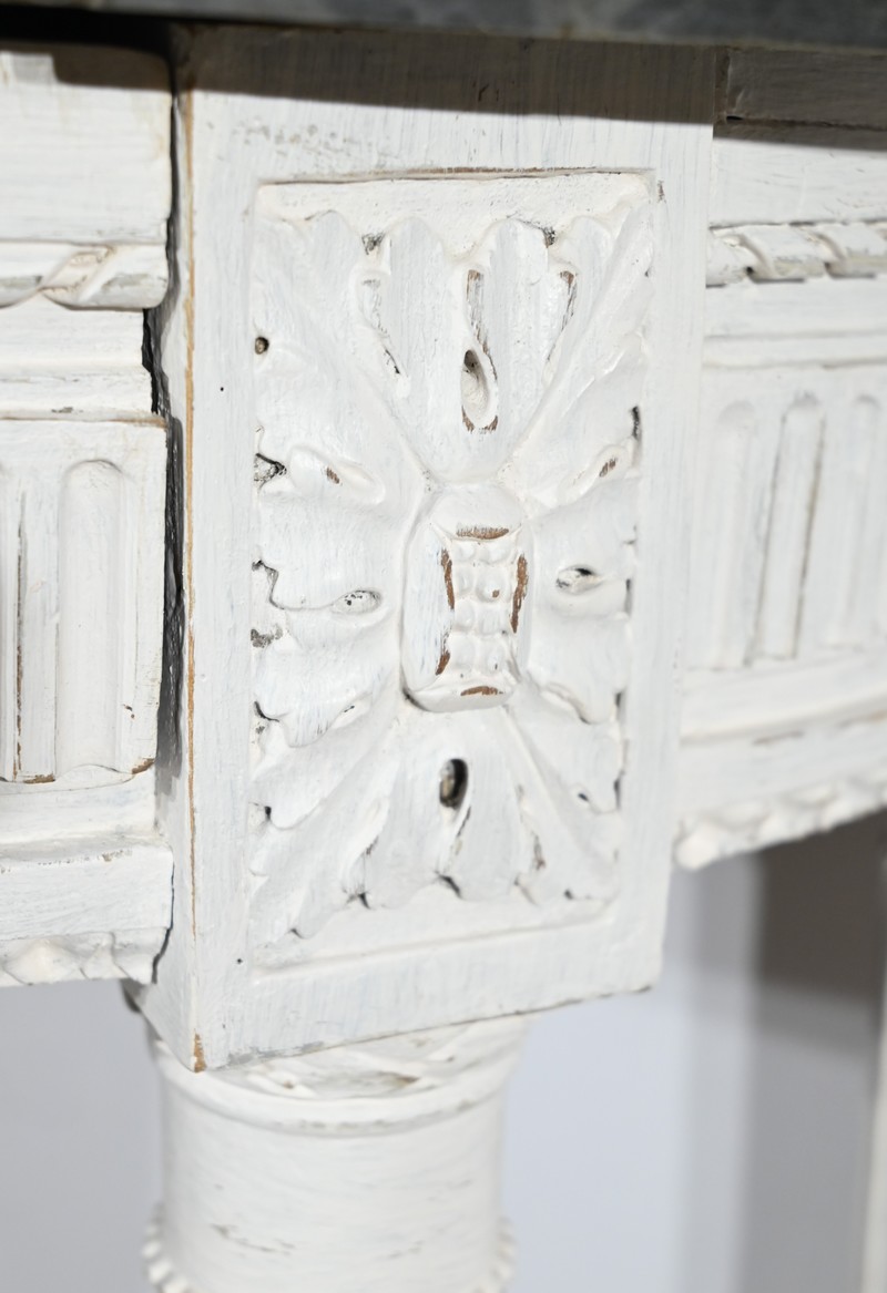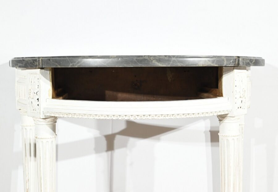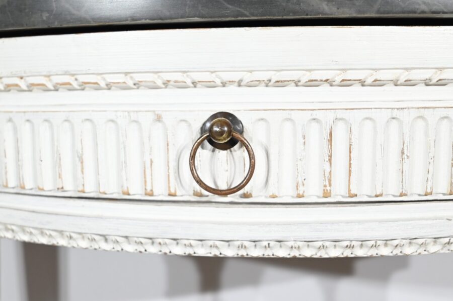 Cette console en bois réchampi de couleur gris clair ouvre en ceinture par un tiroir à poignée anneau tombant en fer.