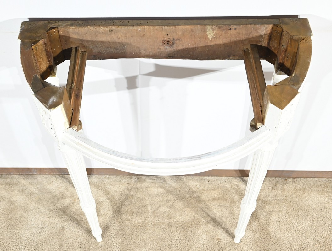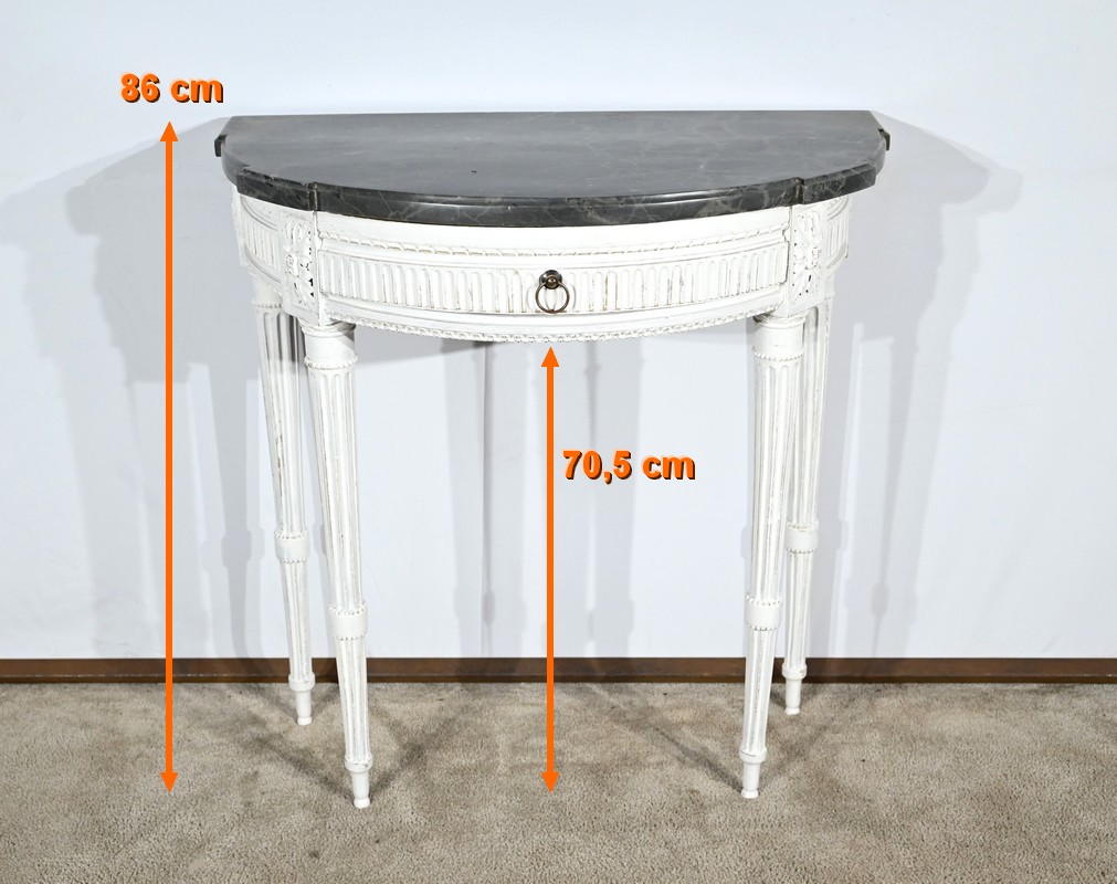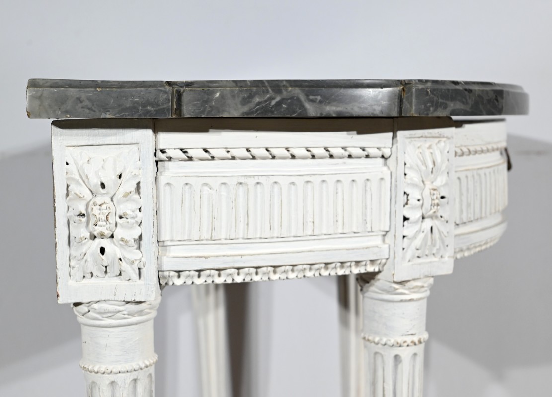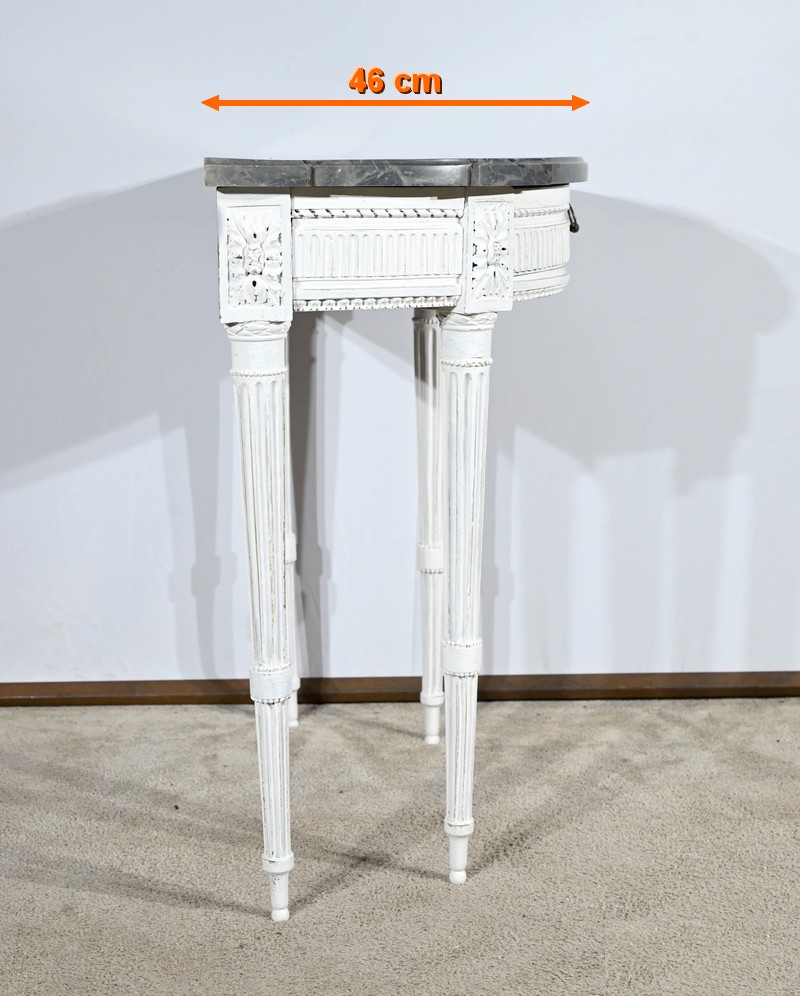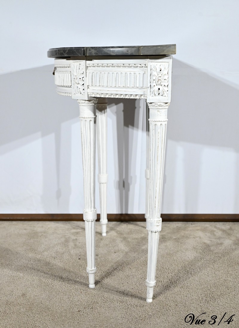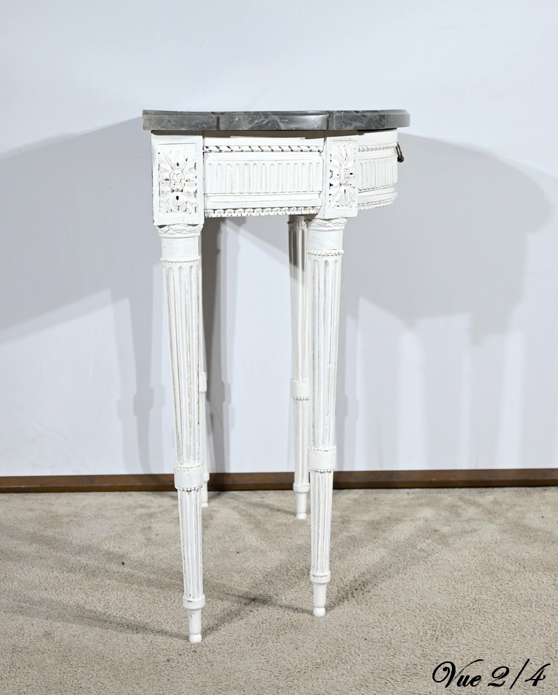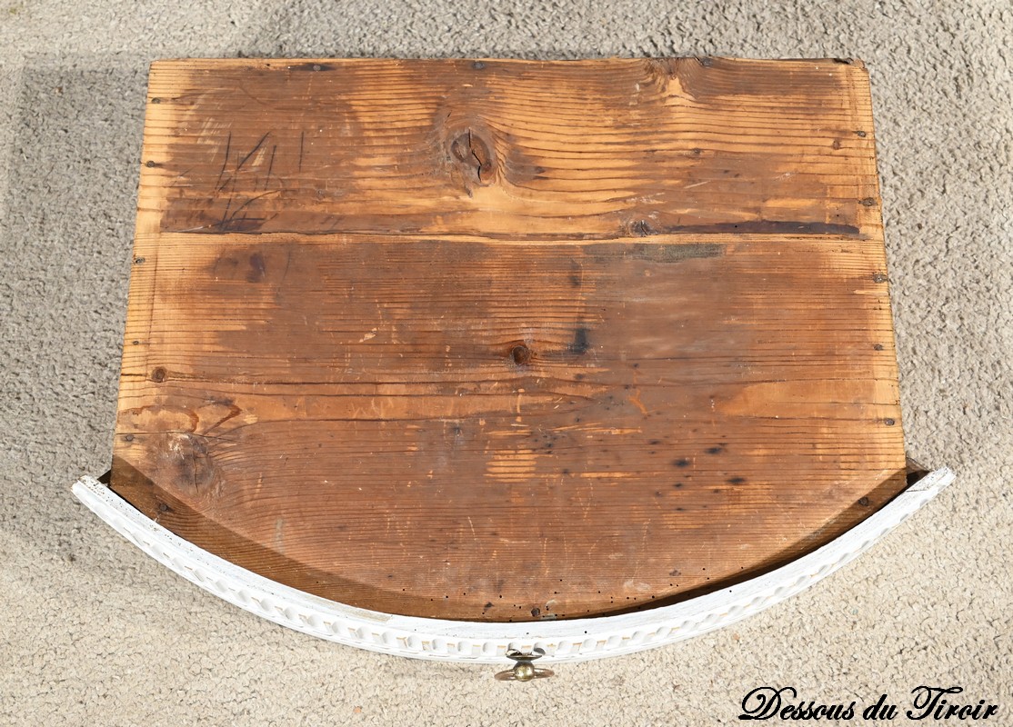 Cette console en bois réchampi de couleur gris clair ouvre en ceinture par un tiroir à poignée anneau tombant en fer.