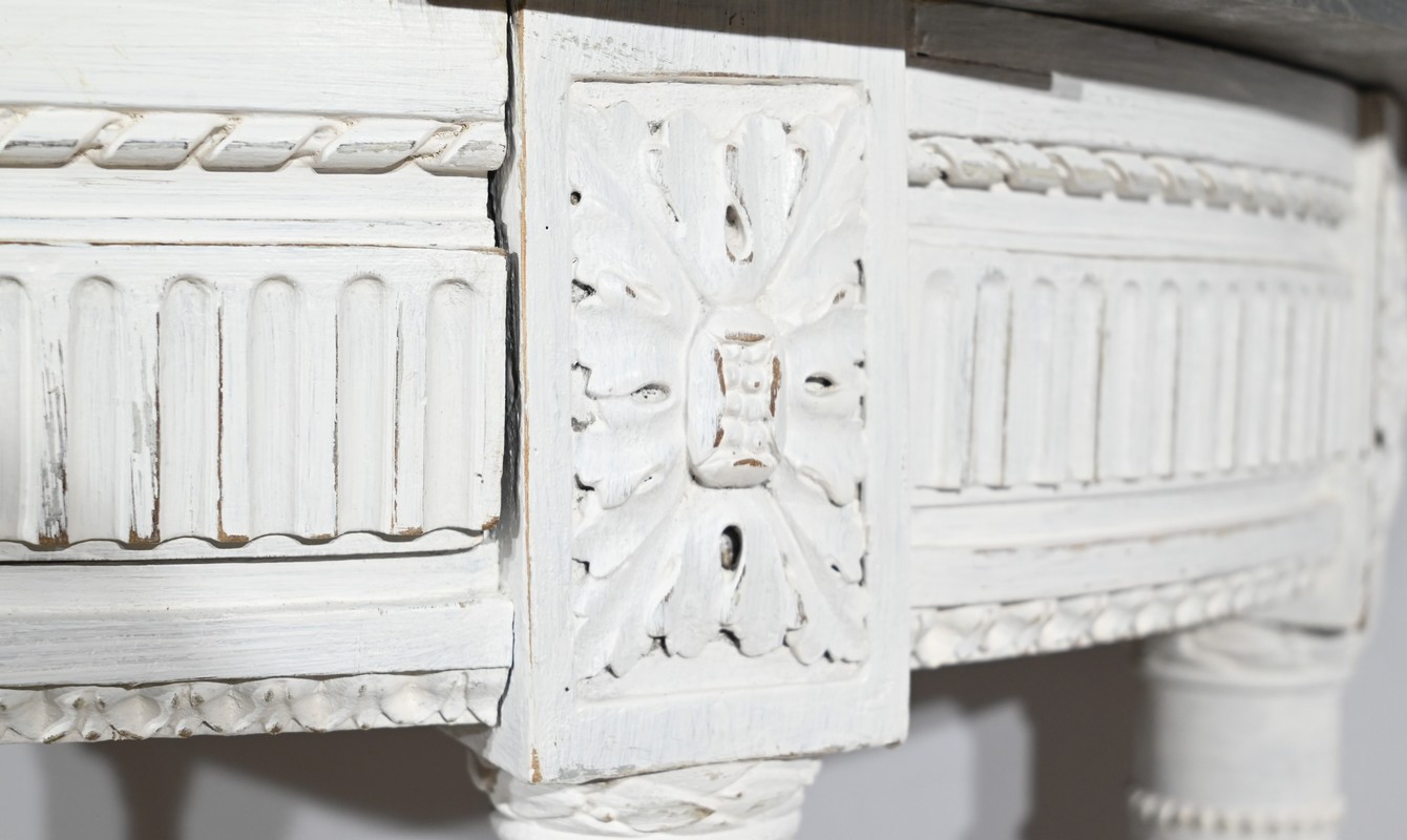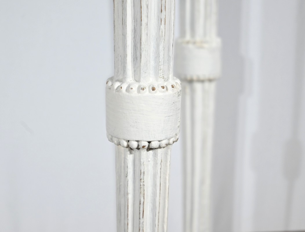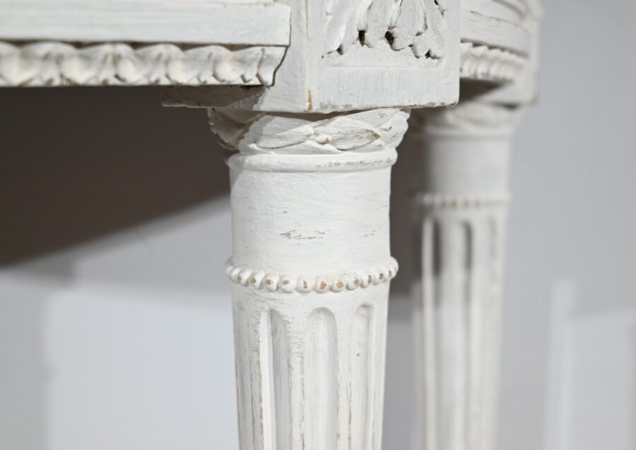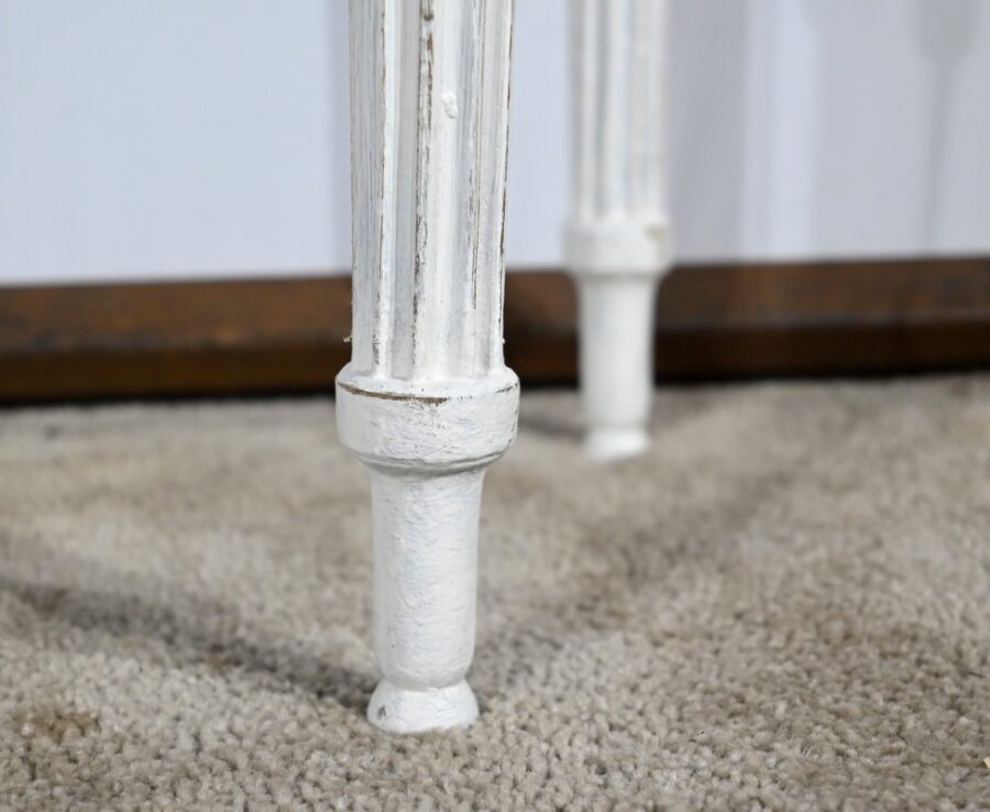 Les quatre pieds fuselés sont cannelés et agrémentés de bagues perlées.