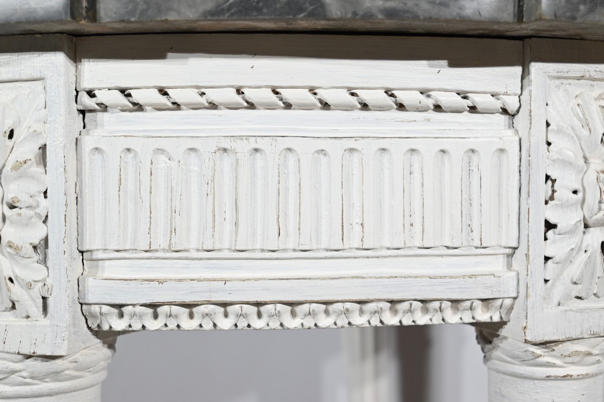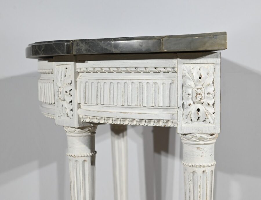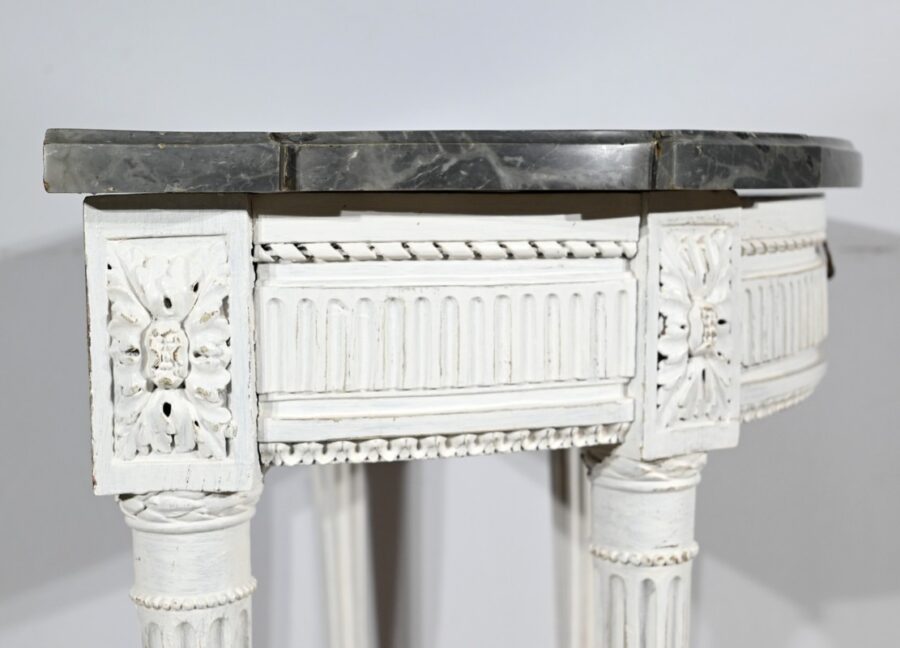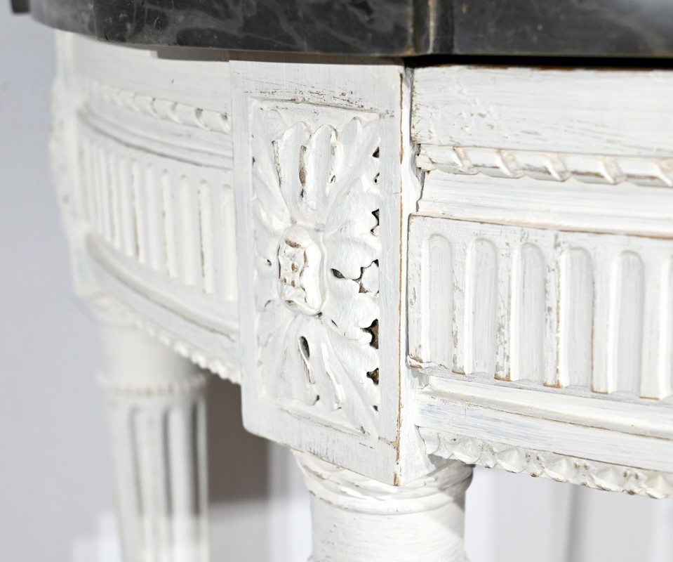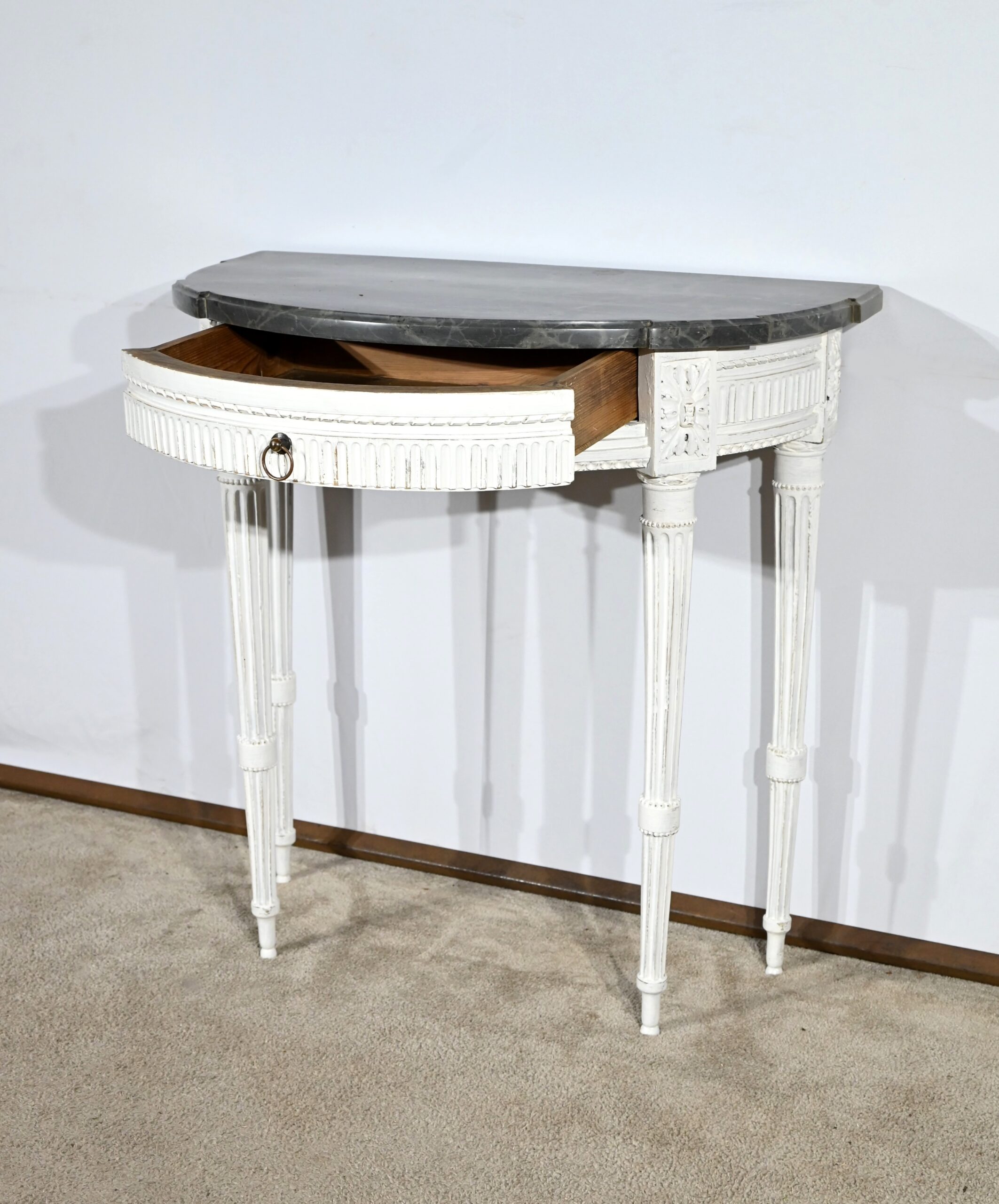 Les quatre pieds fuselés sont cannelés et agrémentés de bagues perlées.