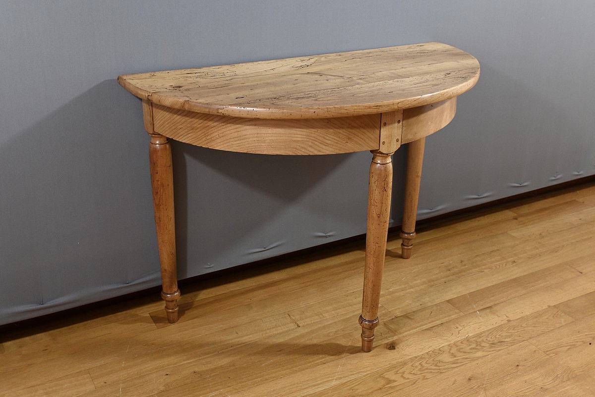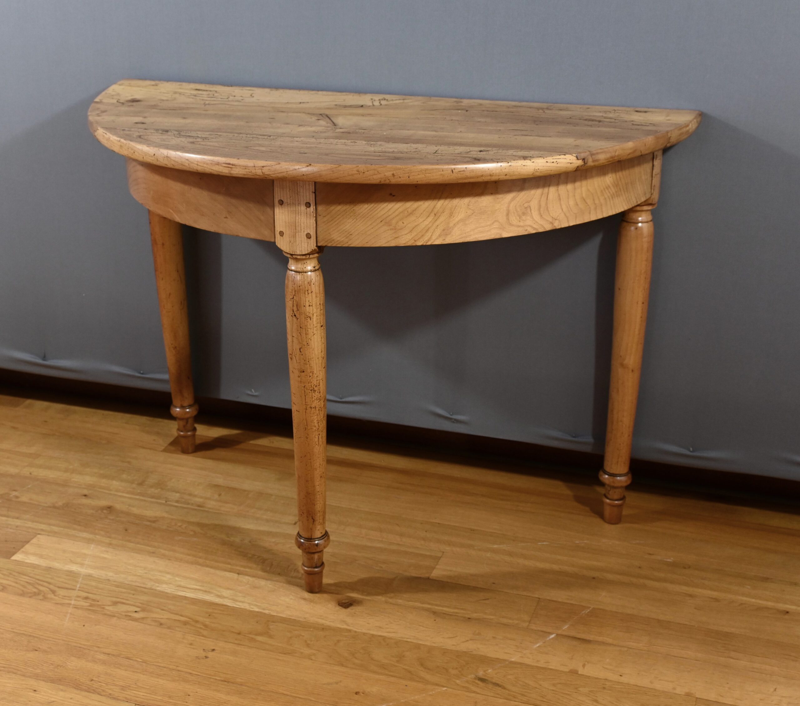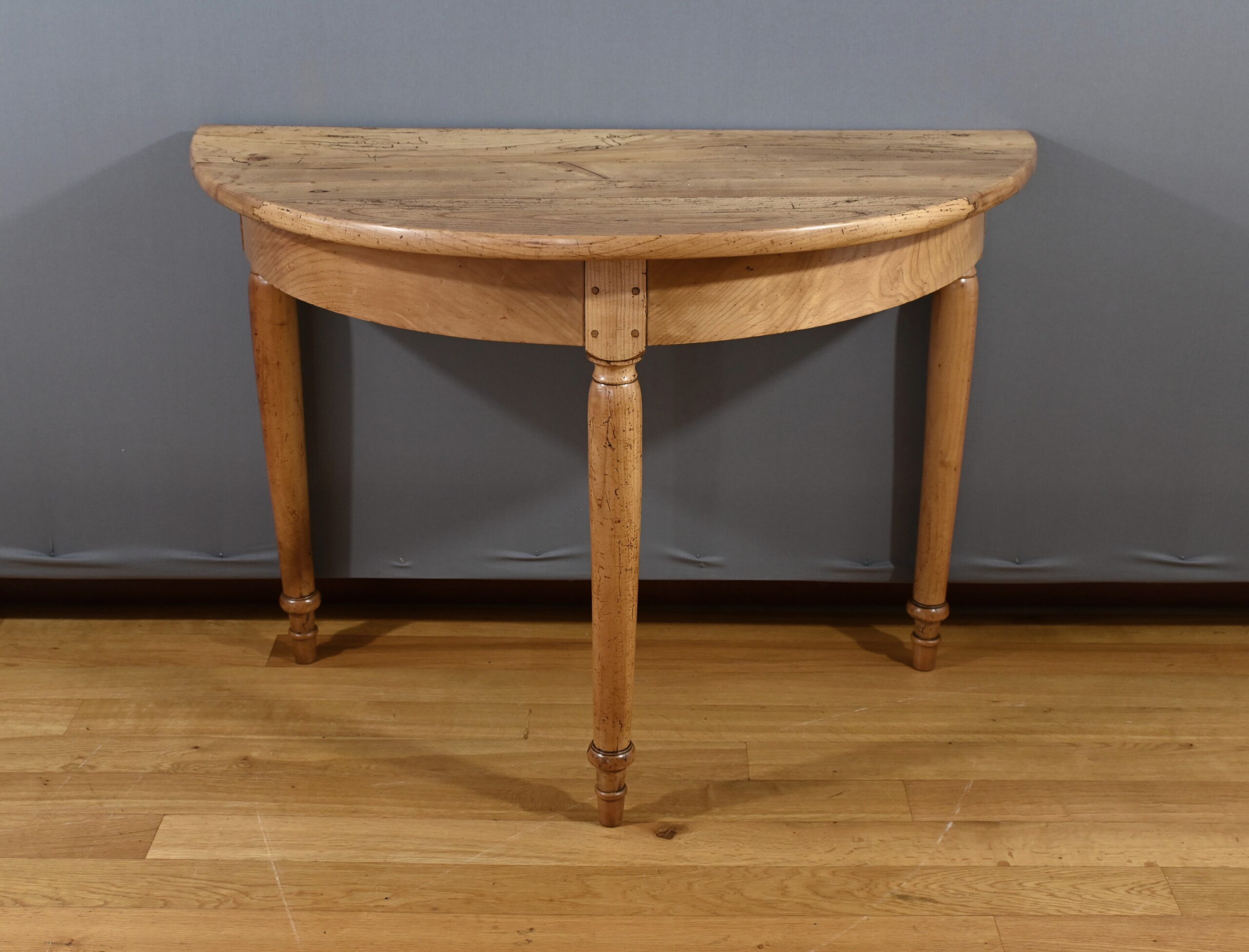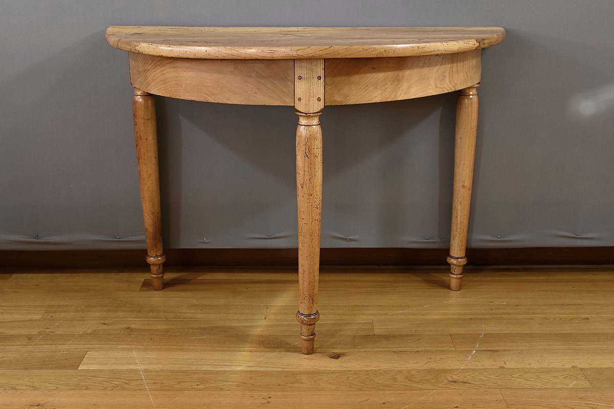 Cette console demi-lune de style Louis-Philippe est une pièce de mobilier de forme semi-circulaire dotée de trois pieds tournés qui lui confèrent une allure gracieuse et épurée. Le merisier blond, avec ses nuances chaleureuses et sa patine naturelle, ajoute du charme à l’ensemble. Son plateau épais et sa ceinture large au veinage apparent, sont marqués de signes du temps lui ajoutant une touche authentique.