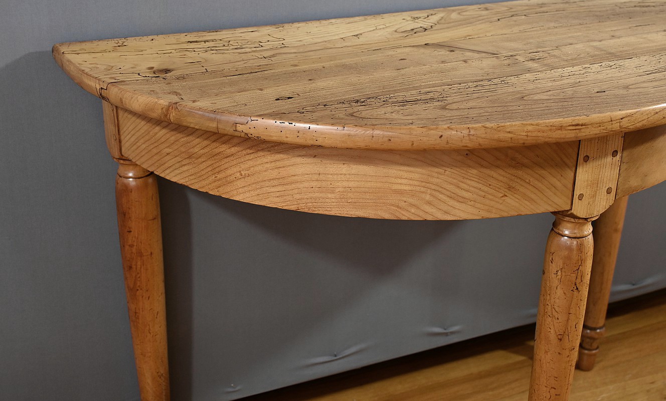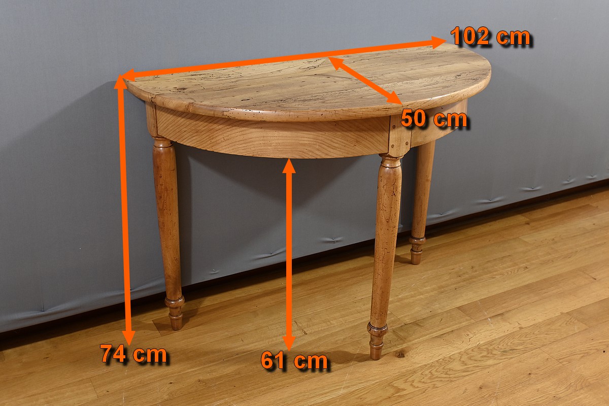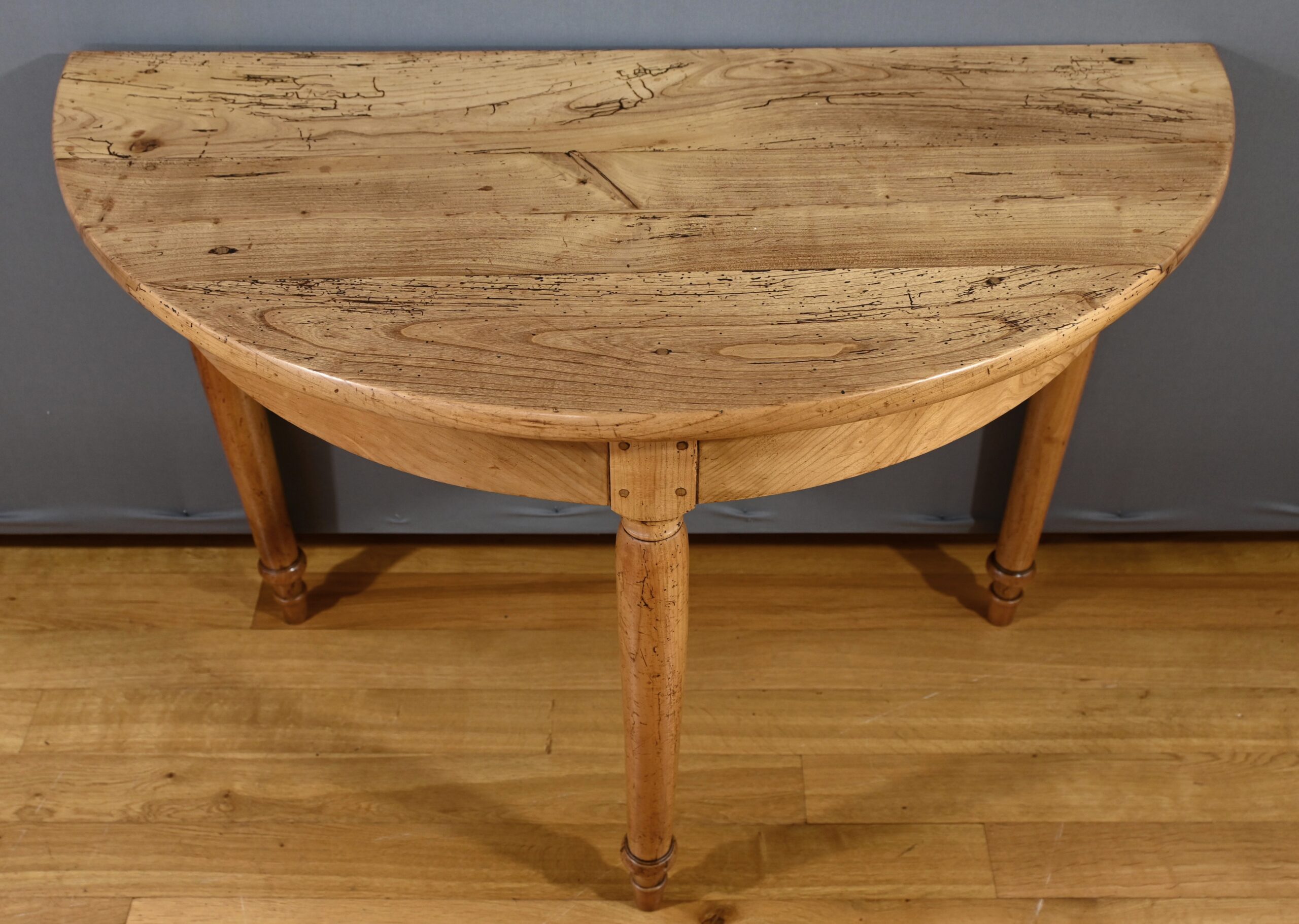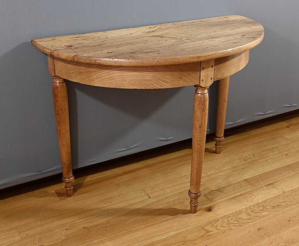 Cette console demi-lune de style Louis-Philippe est une pièce de mobilier de forme semi-circulaire dotée de trois pieds tournés qui lui confèrent une allure gracieuse et épurée. Le merisier blond, avec ses nuances chaleureuses et sa patine naturelle, ajoute du charme à l’ensemble. Son plateau épais et sa ceinture large au veinage apparent, sont marqués de signes du temps lui ajoutant une touche authentique.