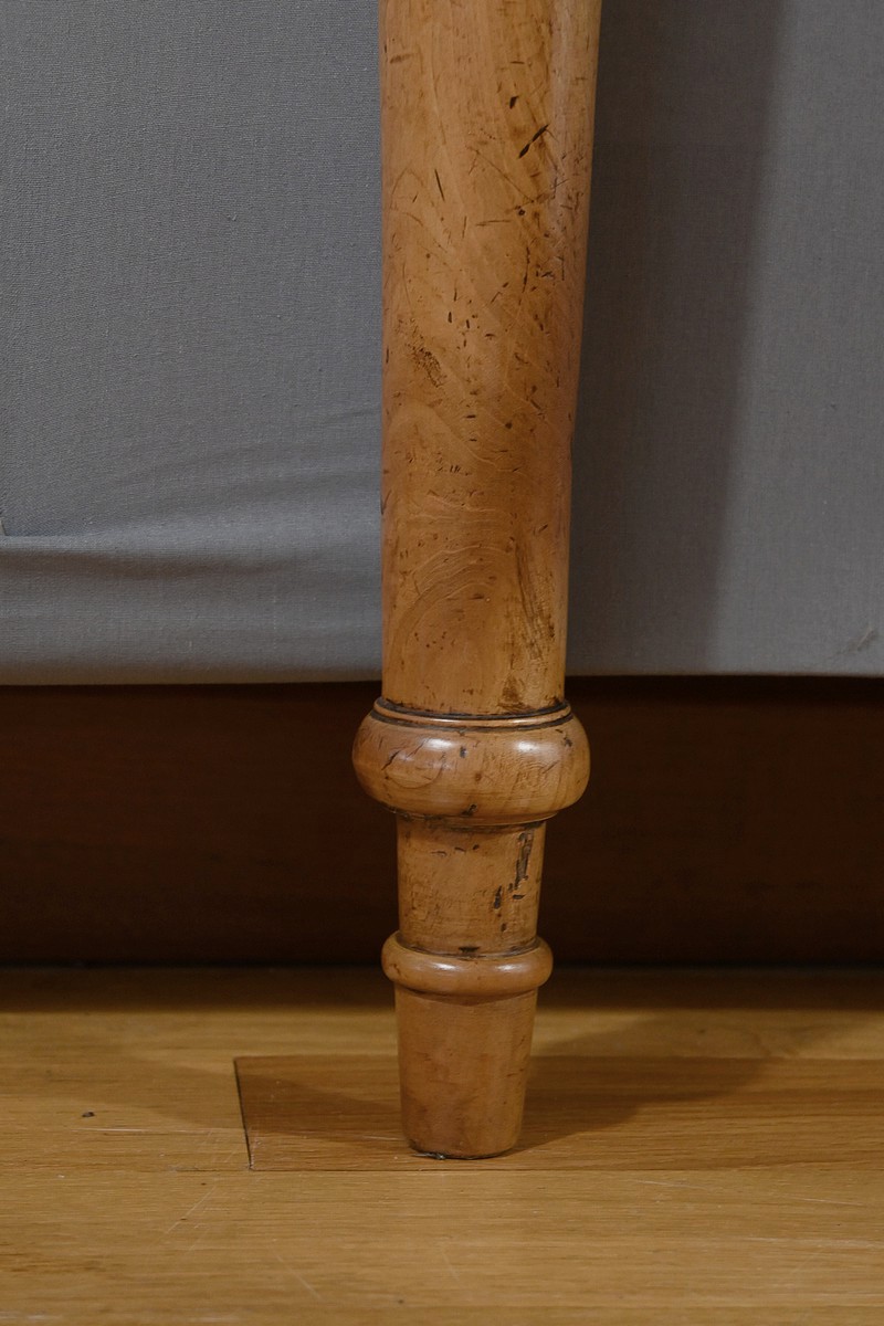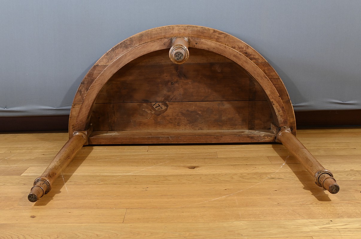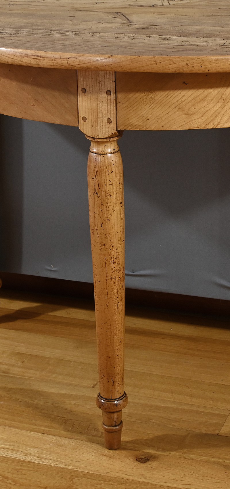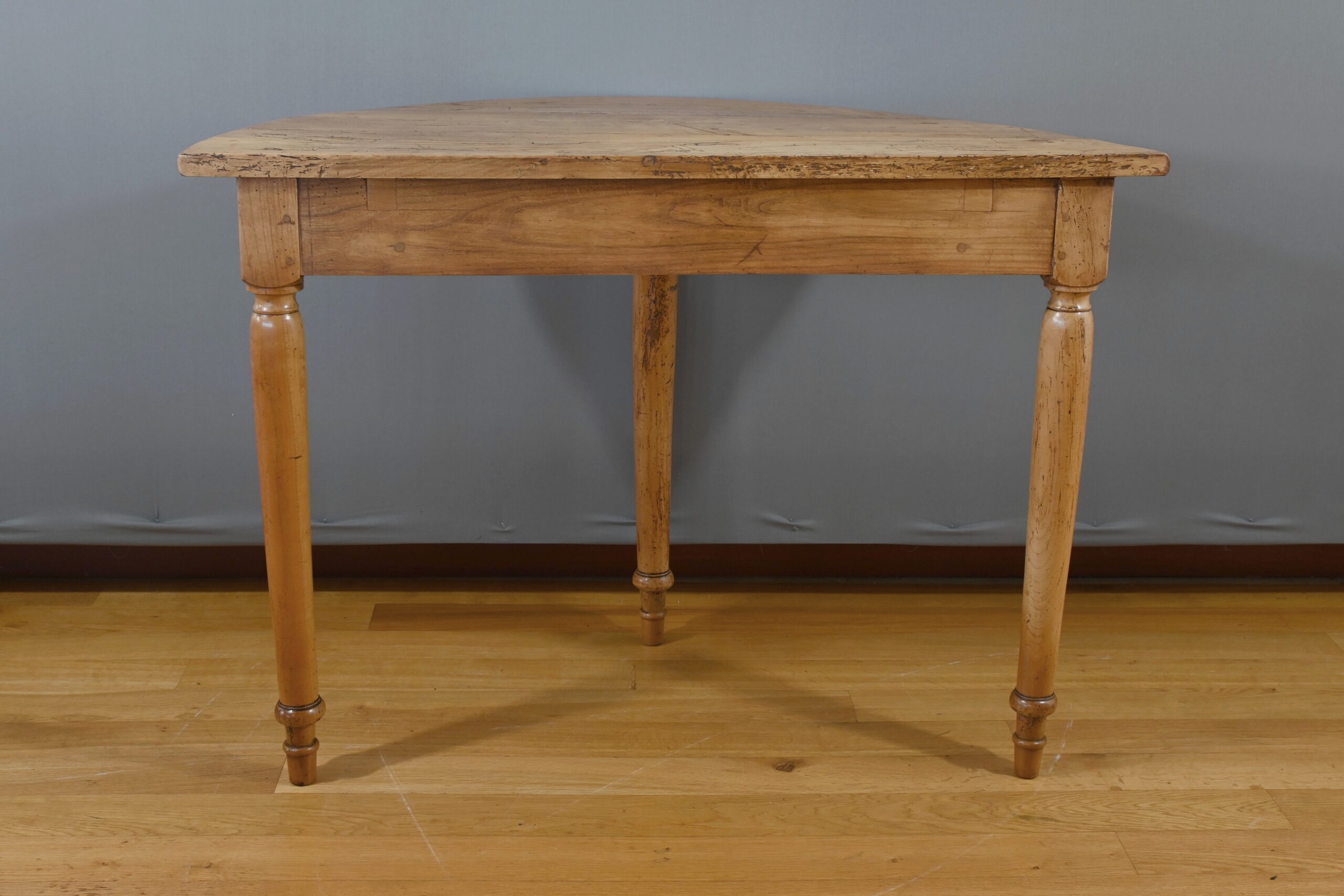 Cette console demi-lune de style Louis-Philippe est une pièce de mobilier de forme semi-circulaire dotée de trois pieds tournés qui lui confèrent une allure gracieuse et épurée. Le merisier blond, avec ses nuances chaleureuses et sa patine naturelle, ajoute du charme à l’ensemble. Son plateau épais et sa ceinture large au veinage apparent, sont marqués de signes du temps lui ajoutant une touche authentique.