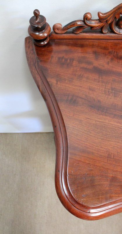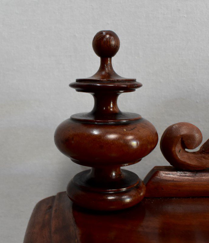 Son dessus consiste en un élégant plateau présentant une gorge et une moulure en bec-de-corbin sur son pourtour. Un fronton joliment sculpté de volutes vient l’enjoliver en partie arrière, accompagné à chaque extrémité d’une pièce tournée en toupie.