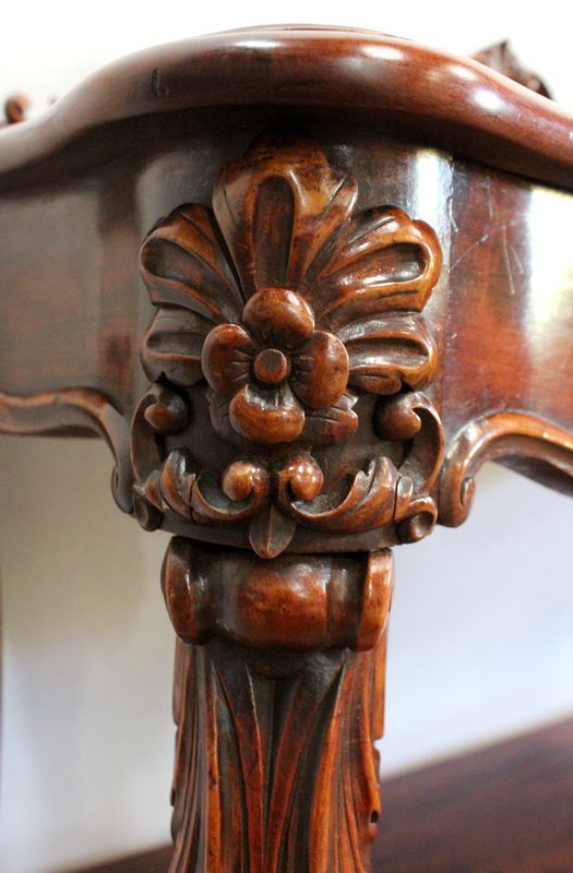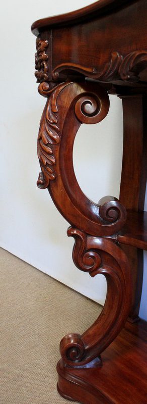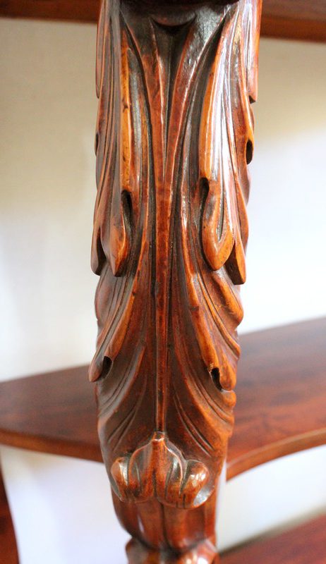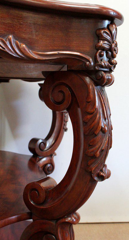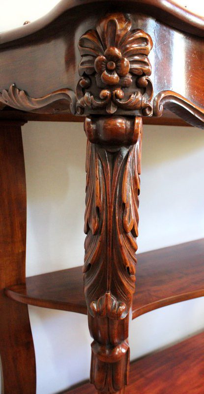 Elle repose en façade sur deux pieds consoles très cambrés en acajou massif, sculptés en partie haute d’une importante feuille d’acanthe : ils présentent une forme de double volute, inversée dans le milieu, sur laquelle vient prendre appui une tablette desserte en dégradé.