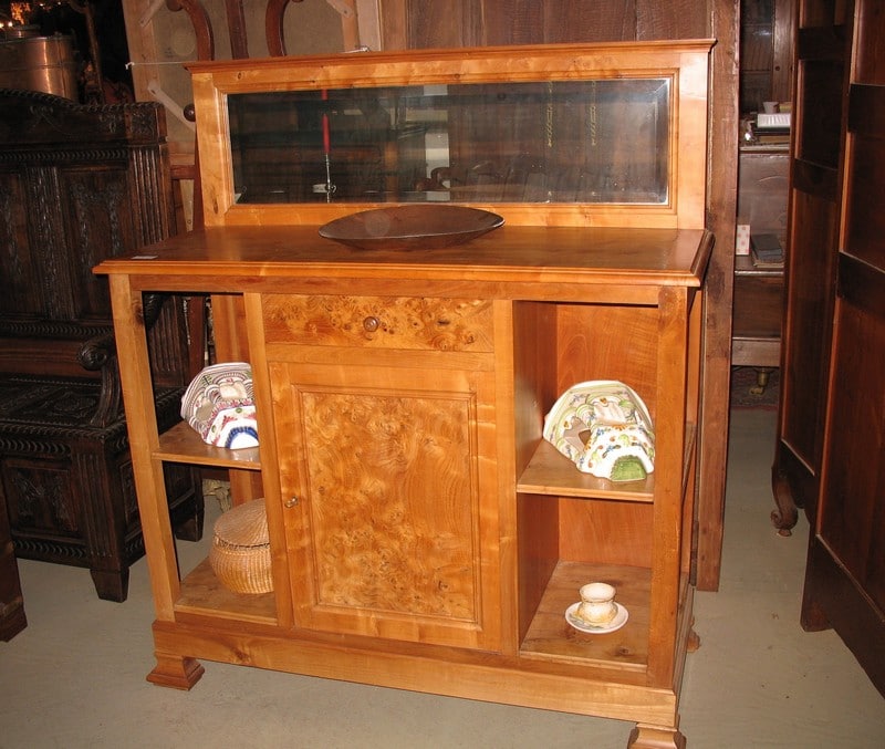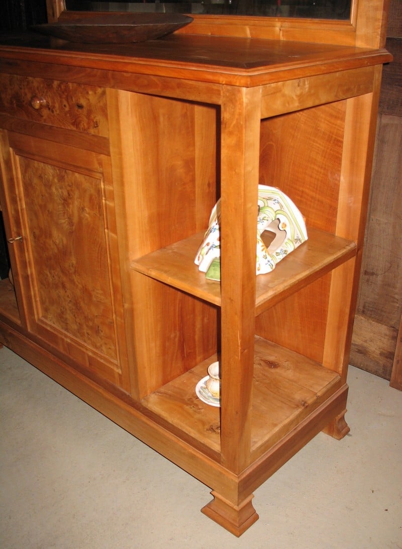 Console-Desserte en Frêne et merisier d’époque 1920. Miroir en partie haute, 1 tiroir 1 porte et 4 niches en partie basse.