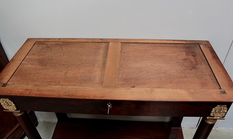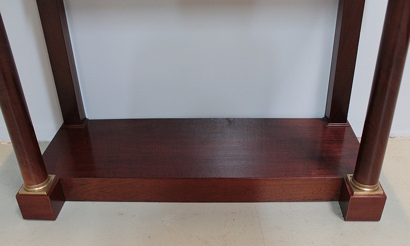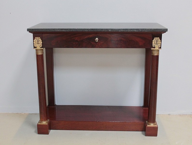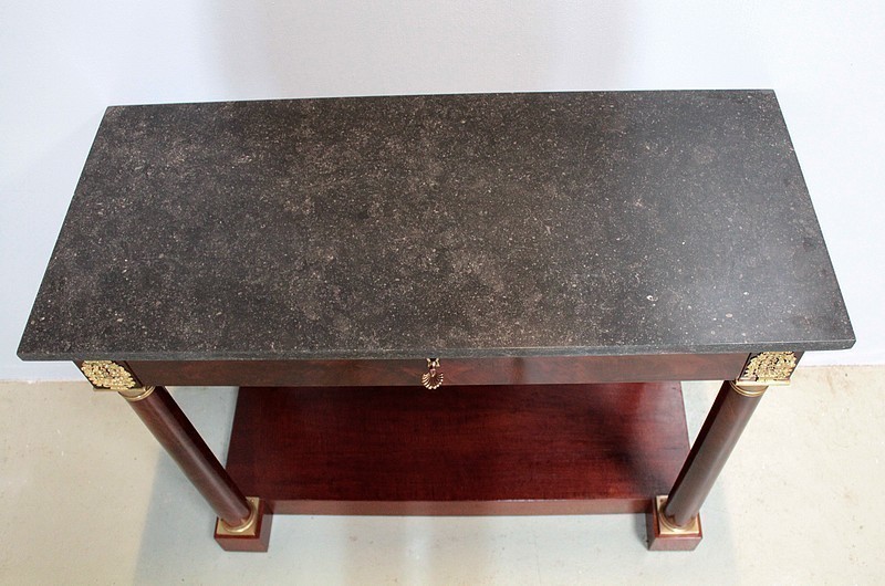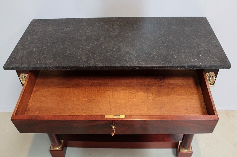 Console Empire en placage d’acajou avec dessus de marbre noir, ouvrant par un tiroir en ceinture.