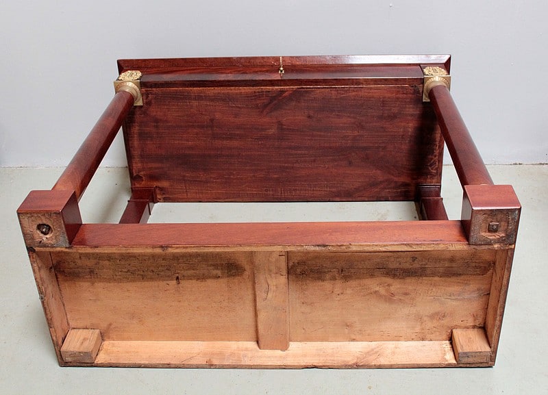 Deux colonnes baguées de bronze à l’avant et deux montants droits à l’arrière reposent sur une console.