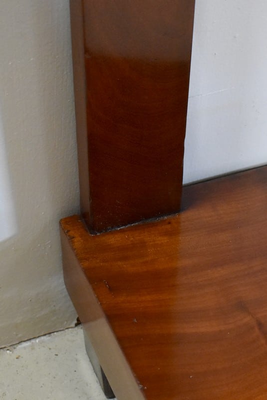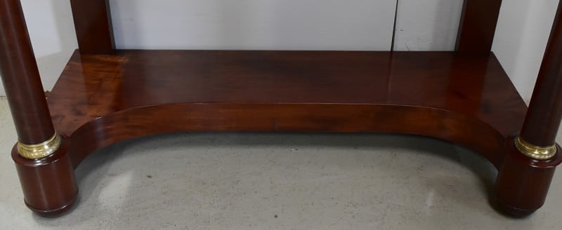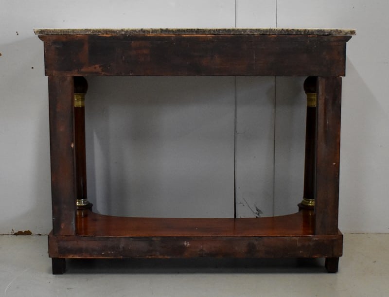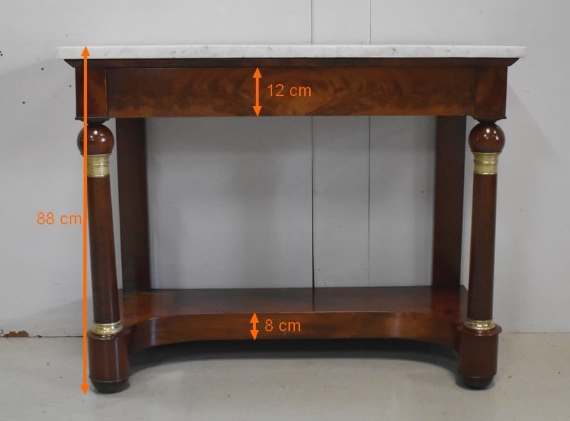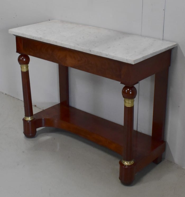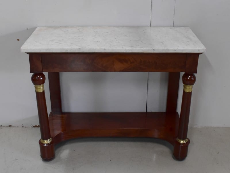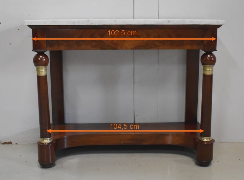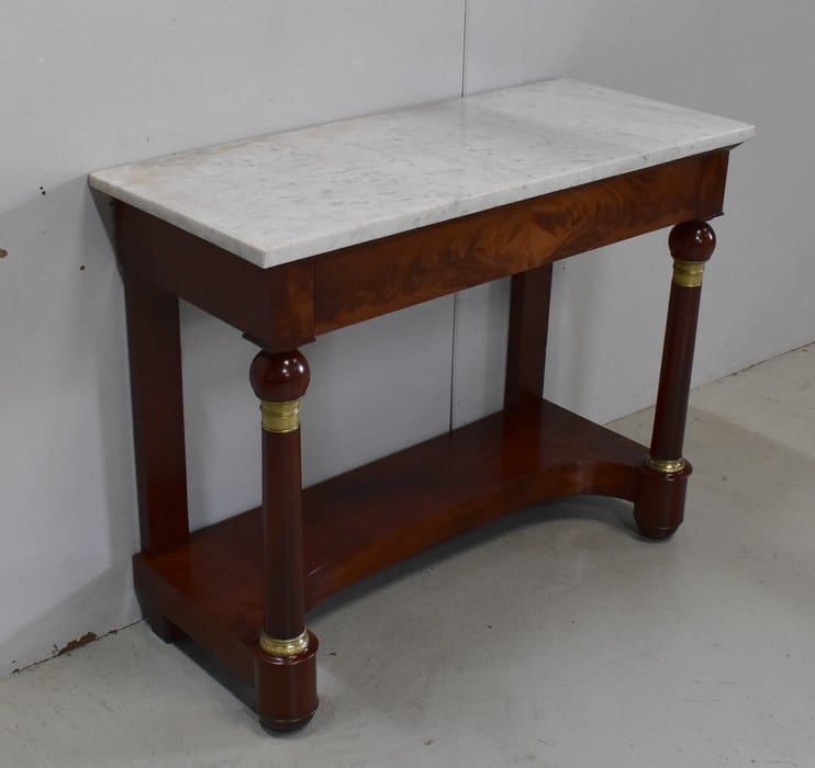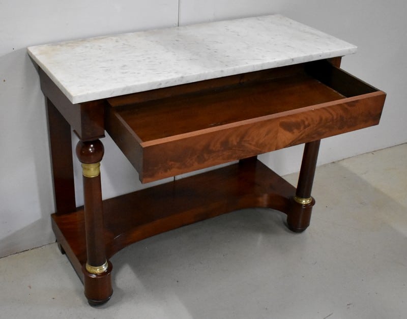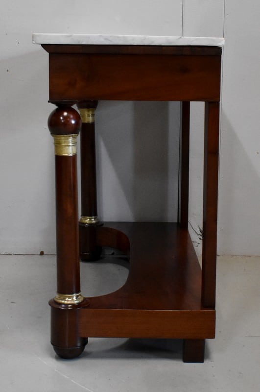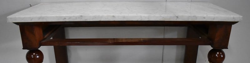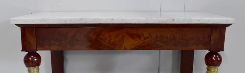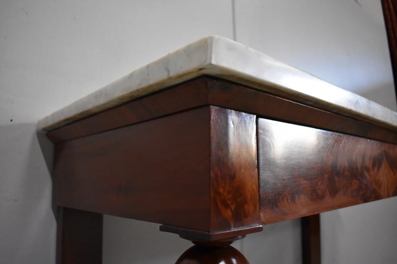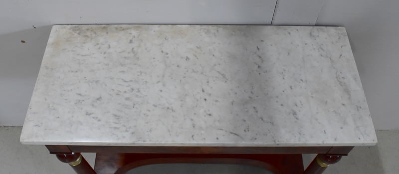 Console en Acajou Plaqué, avec dessus Rectangulaire en Marbre Blanc veiné de Gris, épais de 2,5 cm.