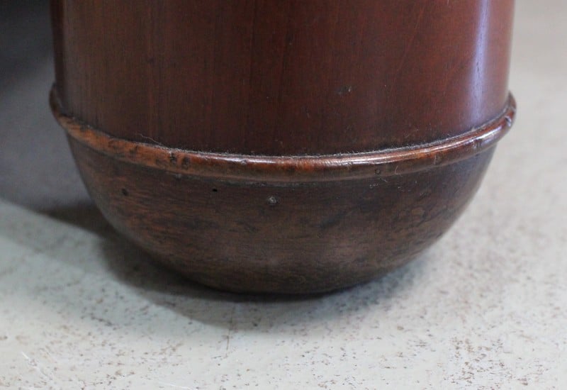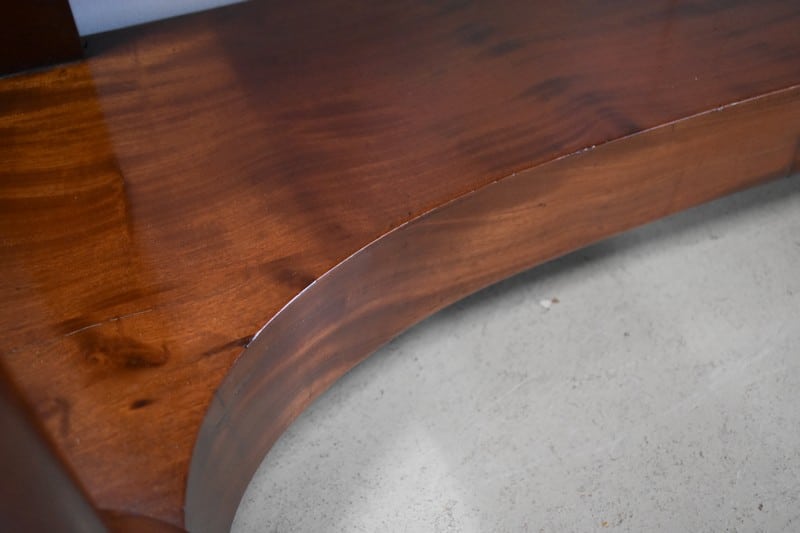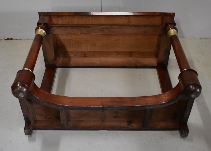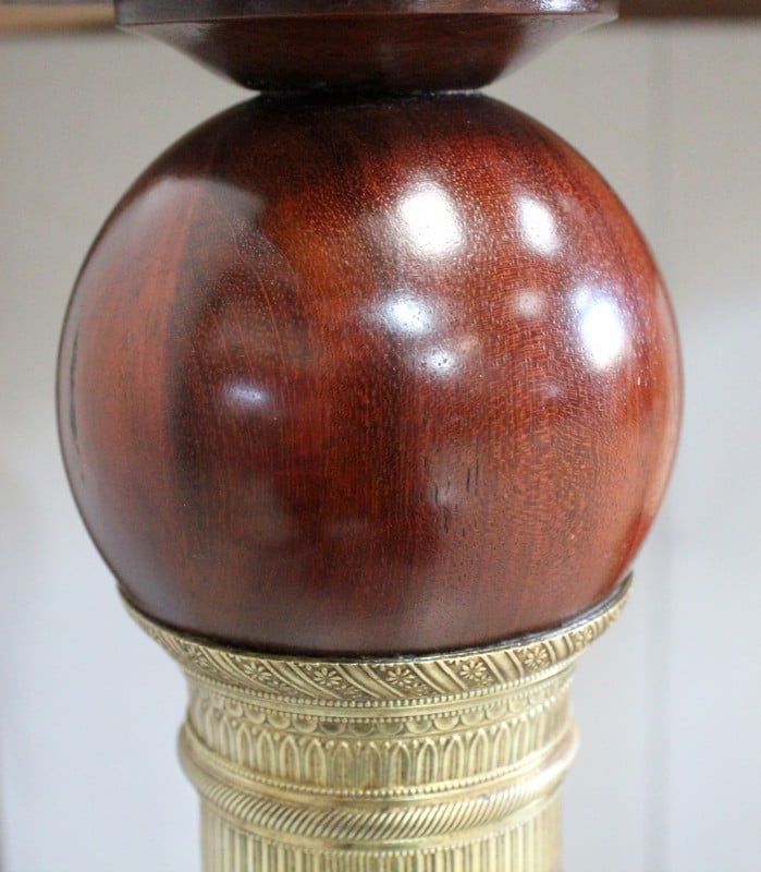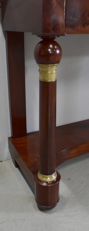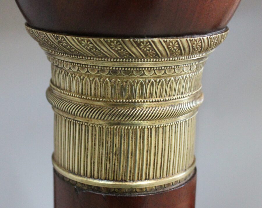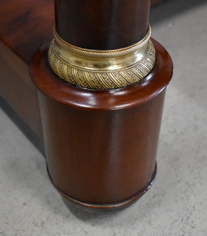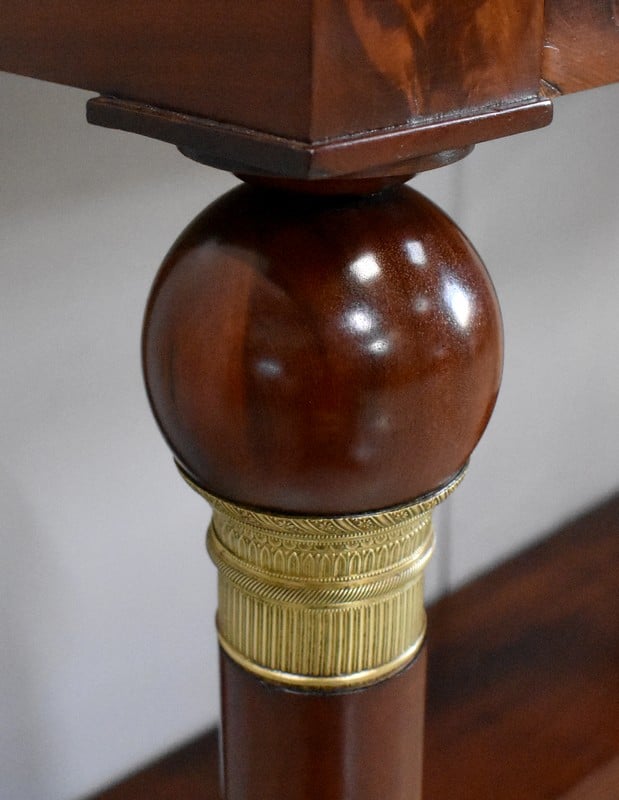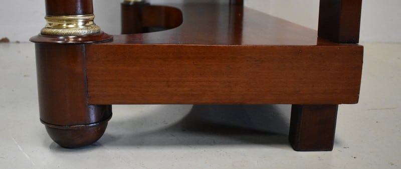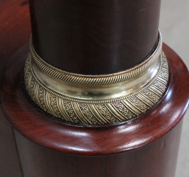 Ce Meuble se compose à l’avant de deux Colonnes en Acajou, avec Boules en parties hautes, et reposant sur deux pieds Cylindriques avec Collerettes. Chacun de ces piliers est agrémenté de deux Bagues en Bronze Finement ciselé.