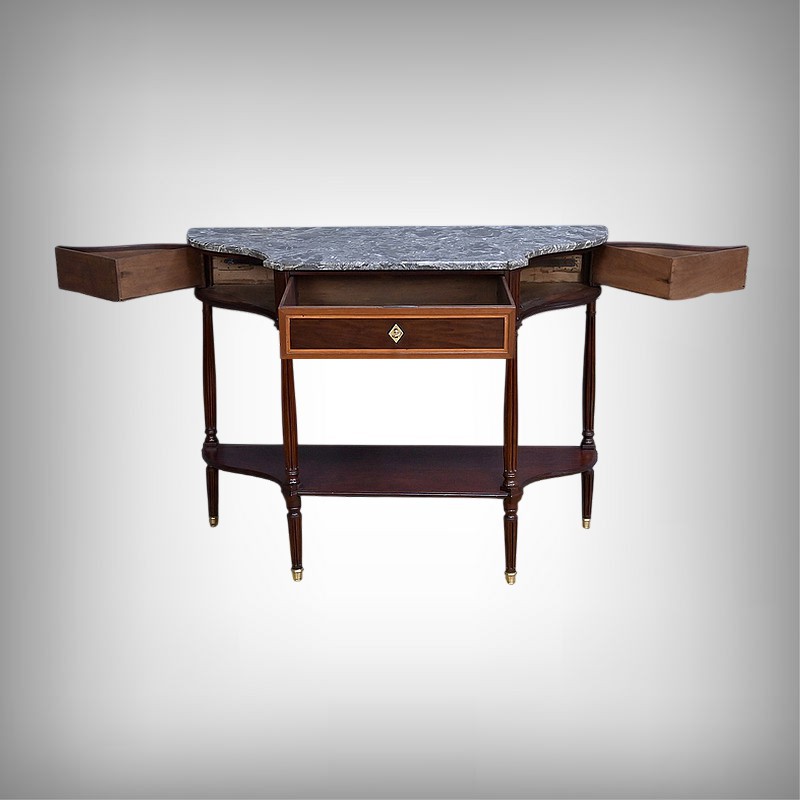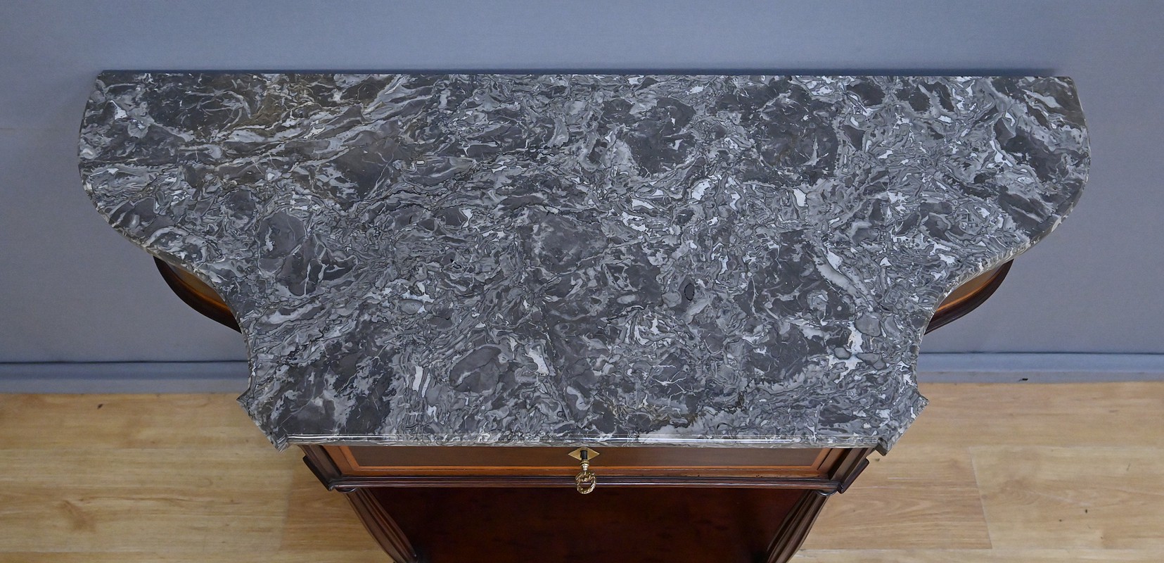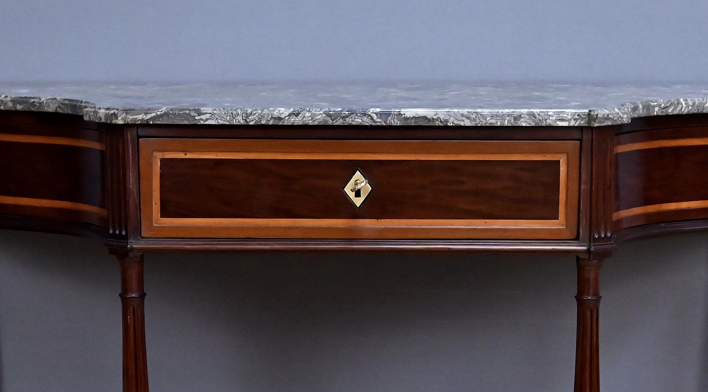 Le dessus est coiffé d’un marbre gris Sainte-Anne soigneusement découpé suivant les courbes du meuble, dont il épouse parfaitement la ligne. Ce marbre, à la fois sobre et noble, complète l’équilibre général de la console et renforce son caractère classique.