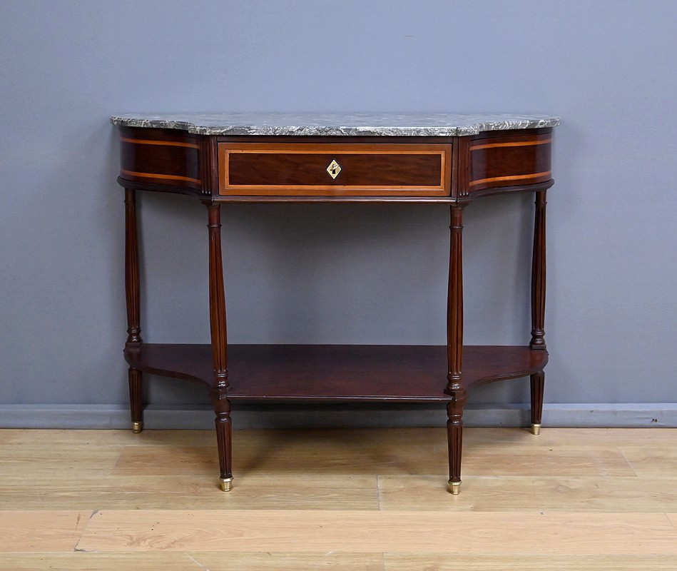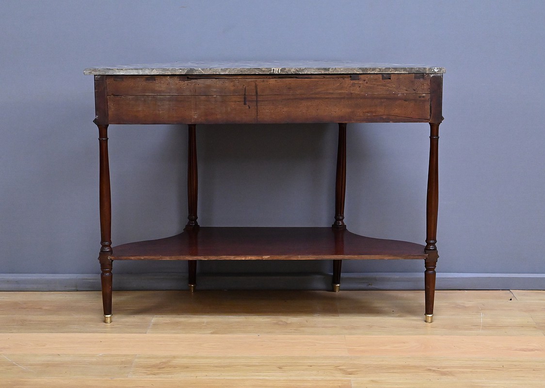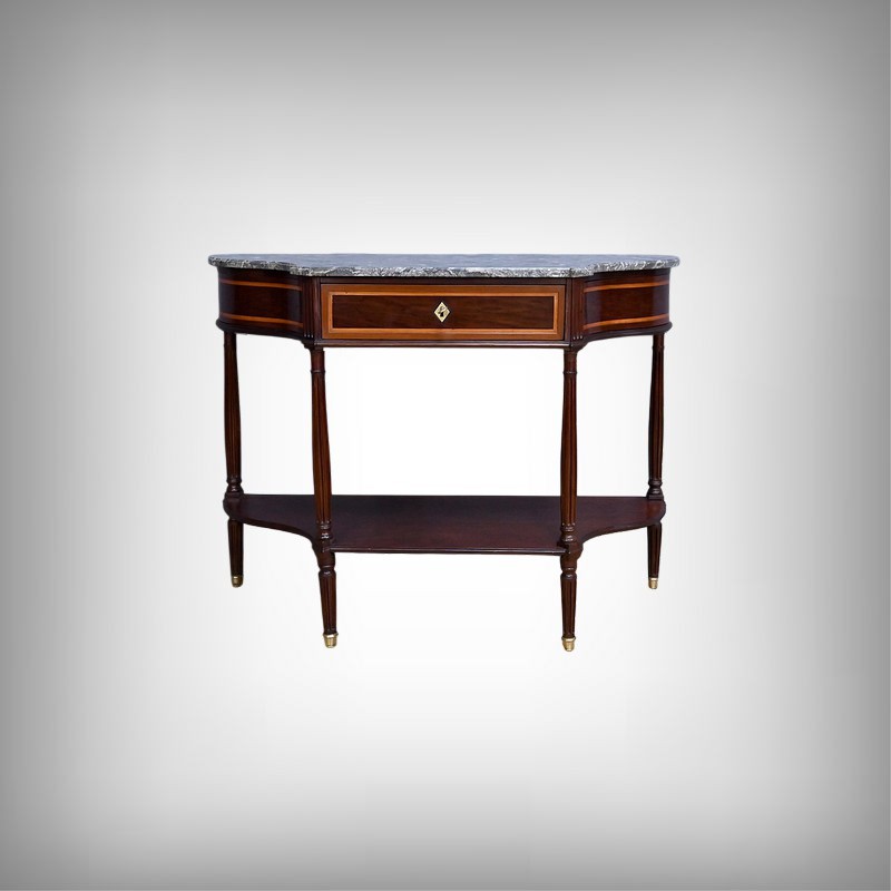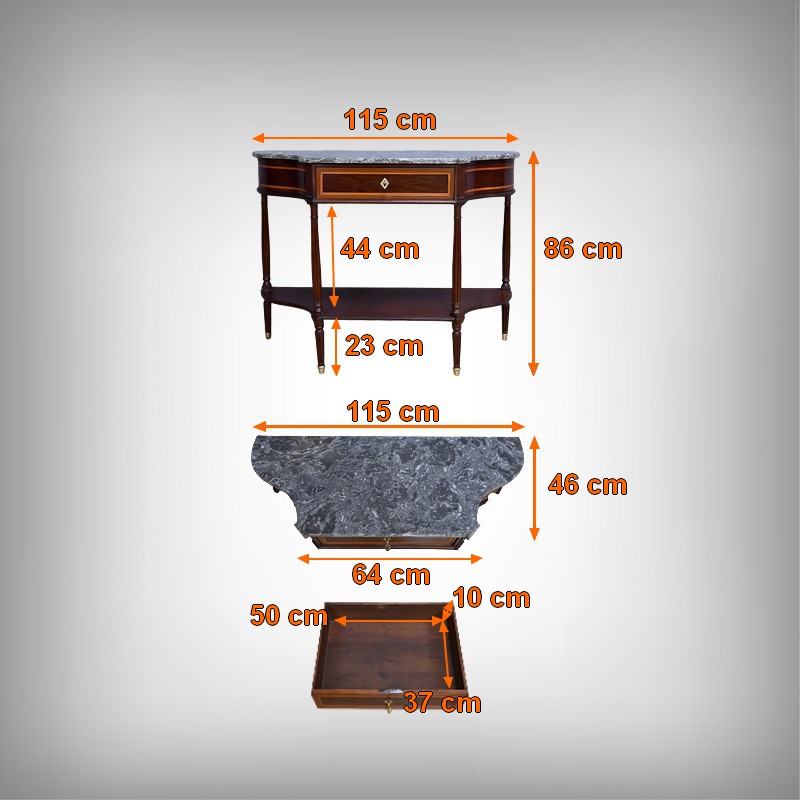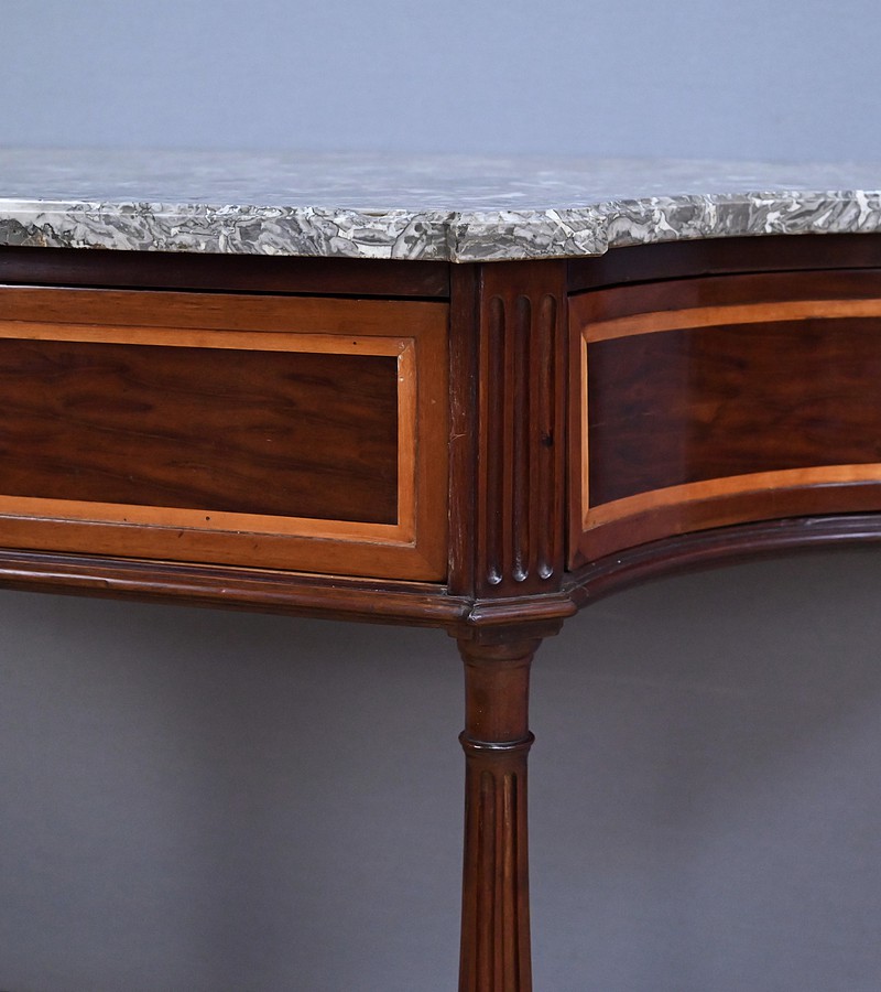Le dessus est coiffé d’un marbre gris Sainte-Anne soigneusement découpé suivant les courbes du meuble, dont il épouse parfaitement la ligne. Ce marbre, à la fois sobre et noble, complète l’équilibre général de la console et renforce son caractère classique.