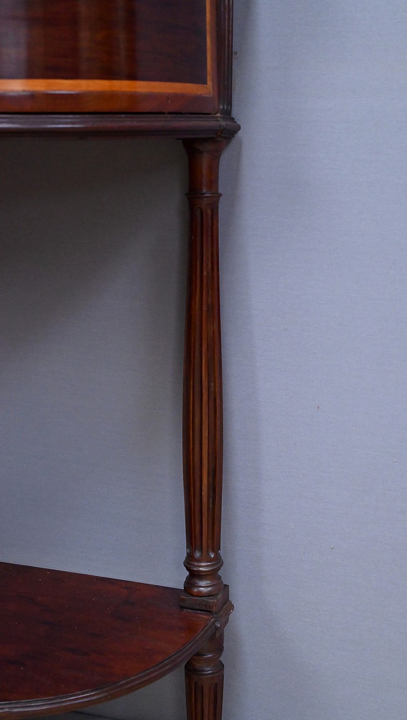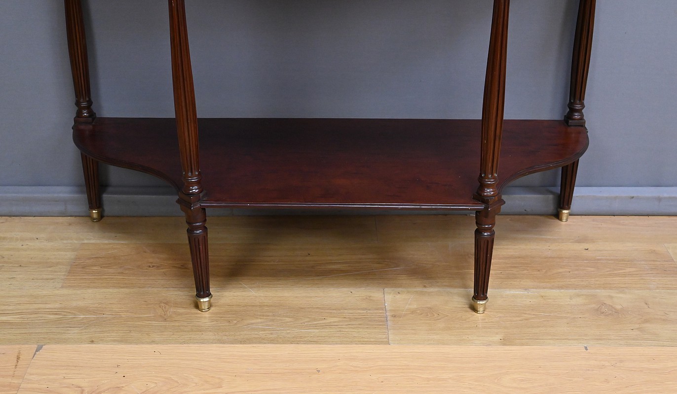 Les montants cannelés prolongent la verticalité du meuble et reposent sur des pieds également cannelés, terminés par de sobres sabots en laiton qui protègent et ornent à la fois. Une tablette d’entretoise moulurée relie harmonieusement les quatre pieds, apportant stabilité et élégance tout en offrant une surface supplémentaire.