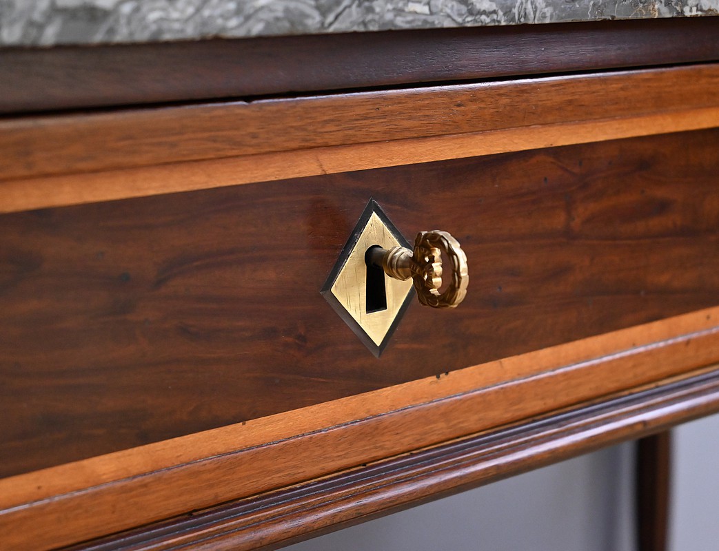 Au centre, un tiroir en ceinture s’intègre avec discrétion dans l’ensemble, tandis que deux tiroirs secrets, parfaitement dissimulés, s’ouvrent grâce à un ingénieux système de bouton-poussoir placé sous la console. Ce mécanisme invisible, typique des meubles de qualité, témoigne d’un savoir-faire recherché et d’un goût pour les raffinements techniques. Le tiroir central est doté d’une clé ouvragée, d’une entrée losange et d’une serrure fonctionnelle.
