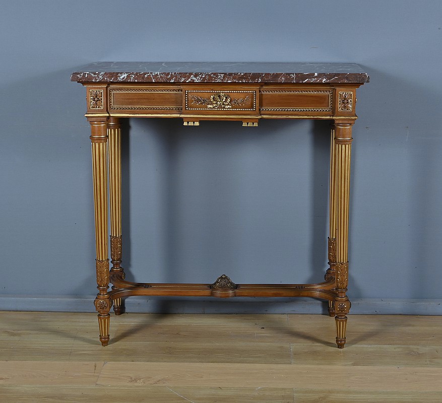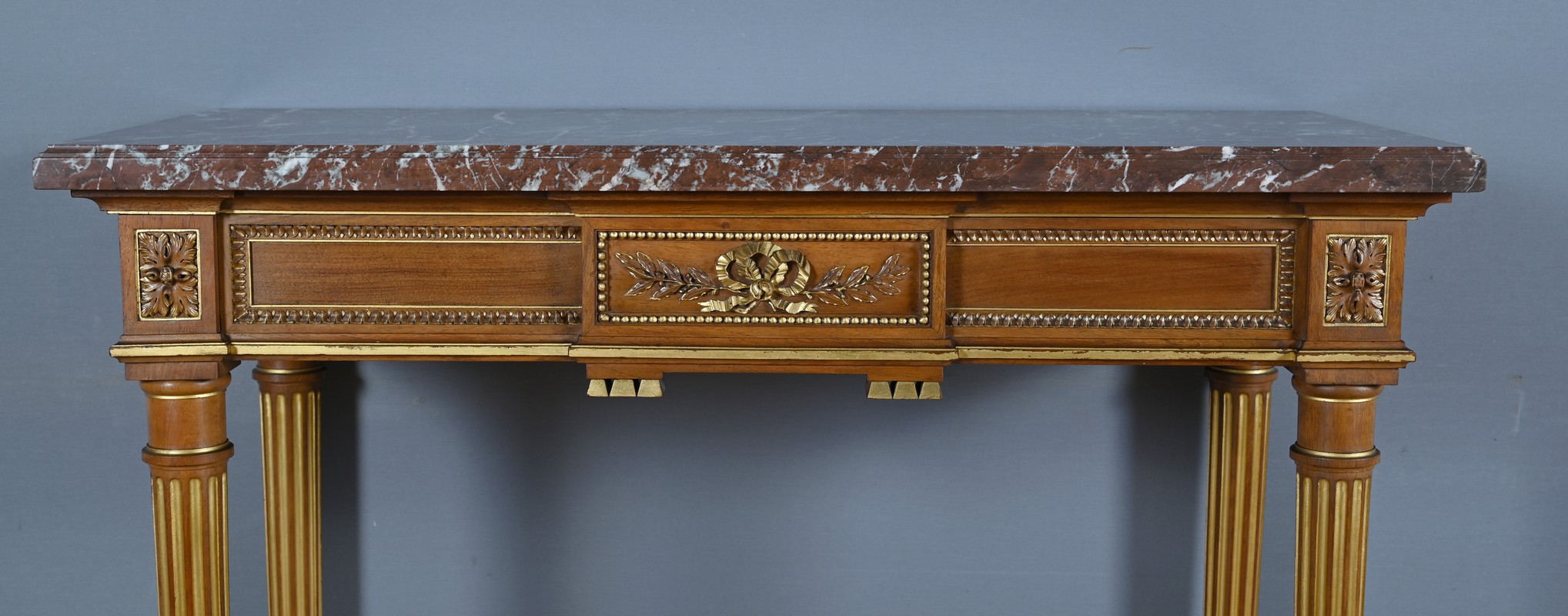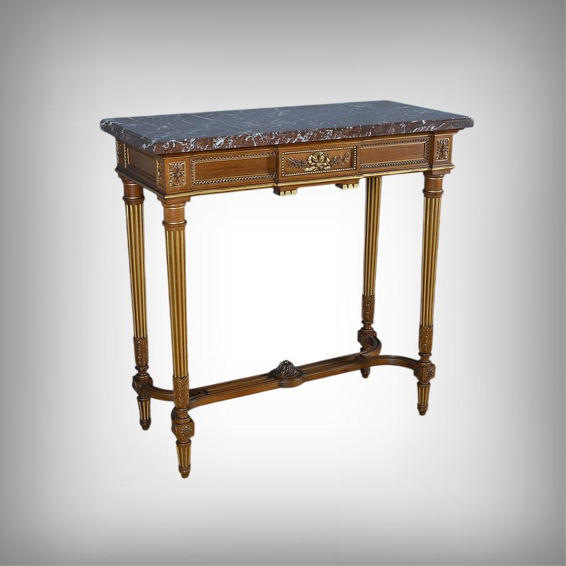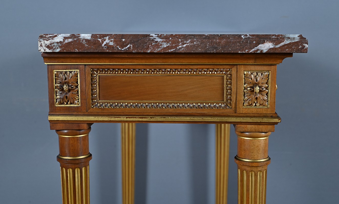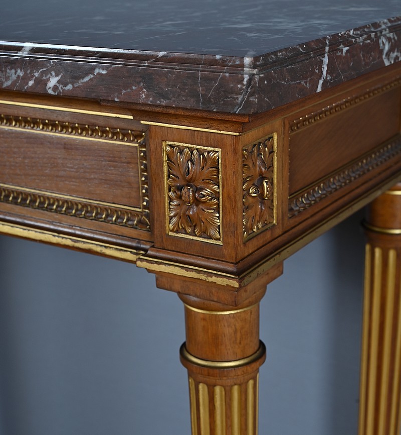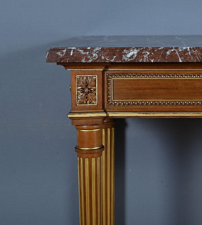 Élégante console en acajou mouluré et sculpté, partiellement rehaussée de dorure, illustrant avec raffinement l’esthétique néoclassique chère au style Louis XVI. La ceinture présente une riche ornementation composée de frises d’oves, de lauriers enrubannés, encadrés d’une frise de perles, témoignant d’un travail de sculpture minutieux et d’un goût affirmé pour les motifs antiques. Les quatre pieds fuselés, à cannelures dorées et finement sculptés, sont reliés par une entretoise galbée centrée d’une sculpture décorative, renforçant la stabilité tout en soulignant la symétrie de l’ensemble. Le dessus en marbre griotte, à bord sculpté en cavet renversé, parachève l’harmonie du meuble par son contraste noble et sa sobriété minérale. Une pièce décorative et structurée, idéale pour rehausser un intérieur classique ou dialoguer avec une mise en scène contemporaine.