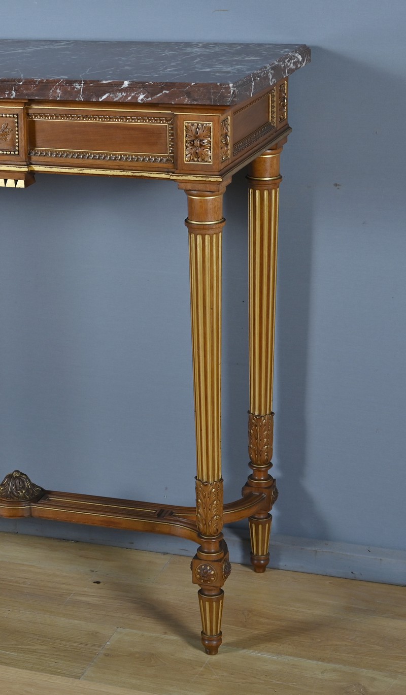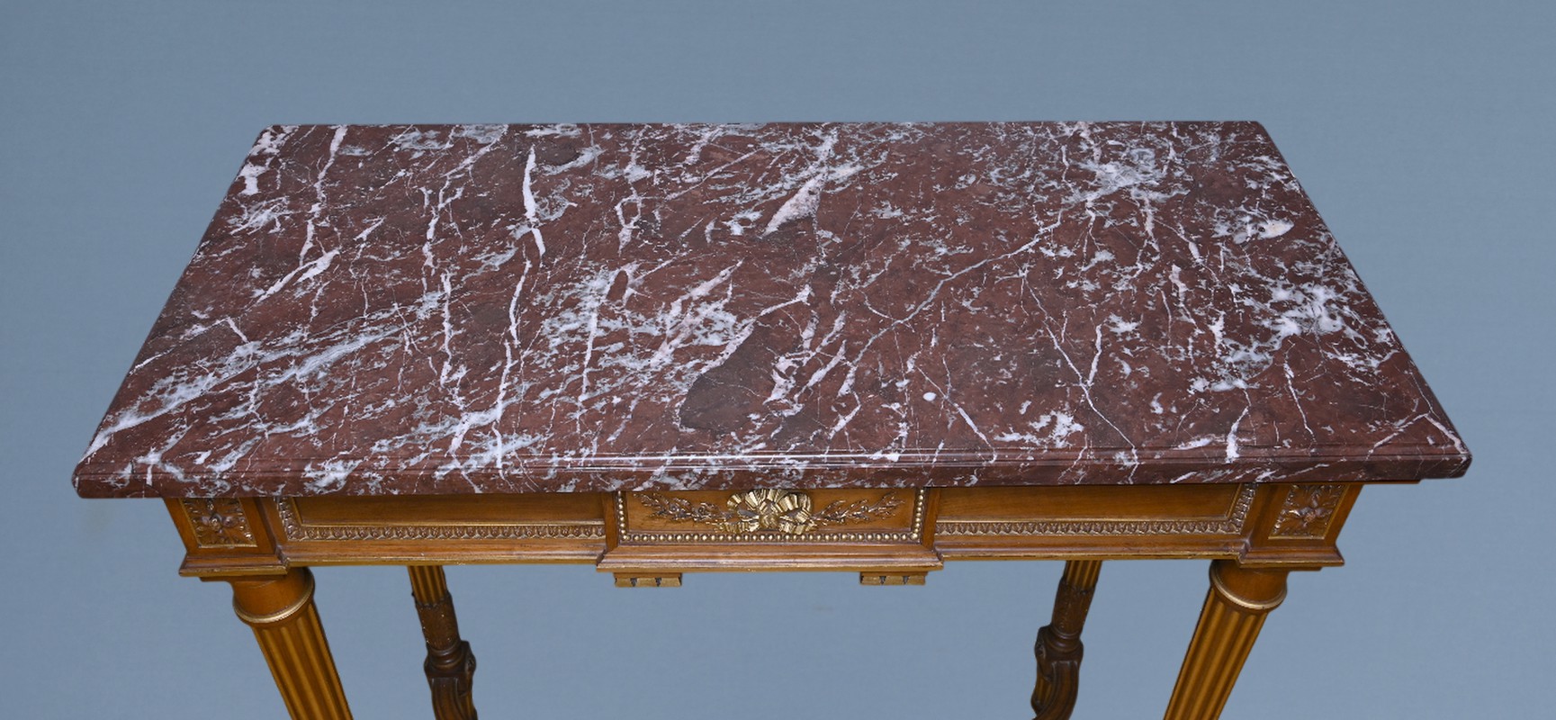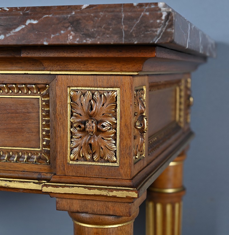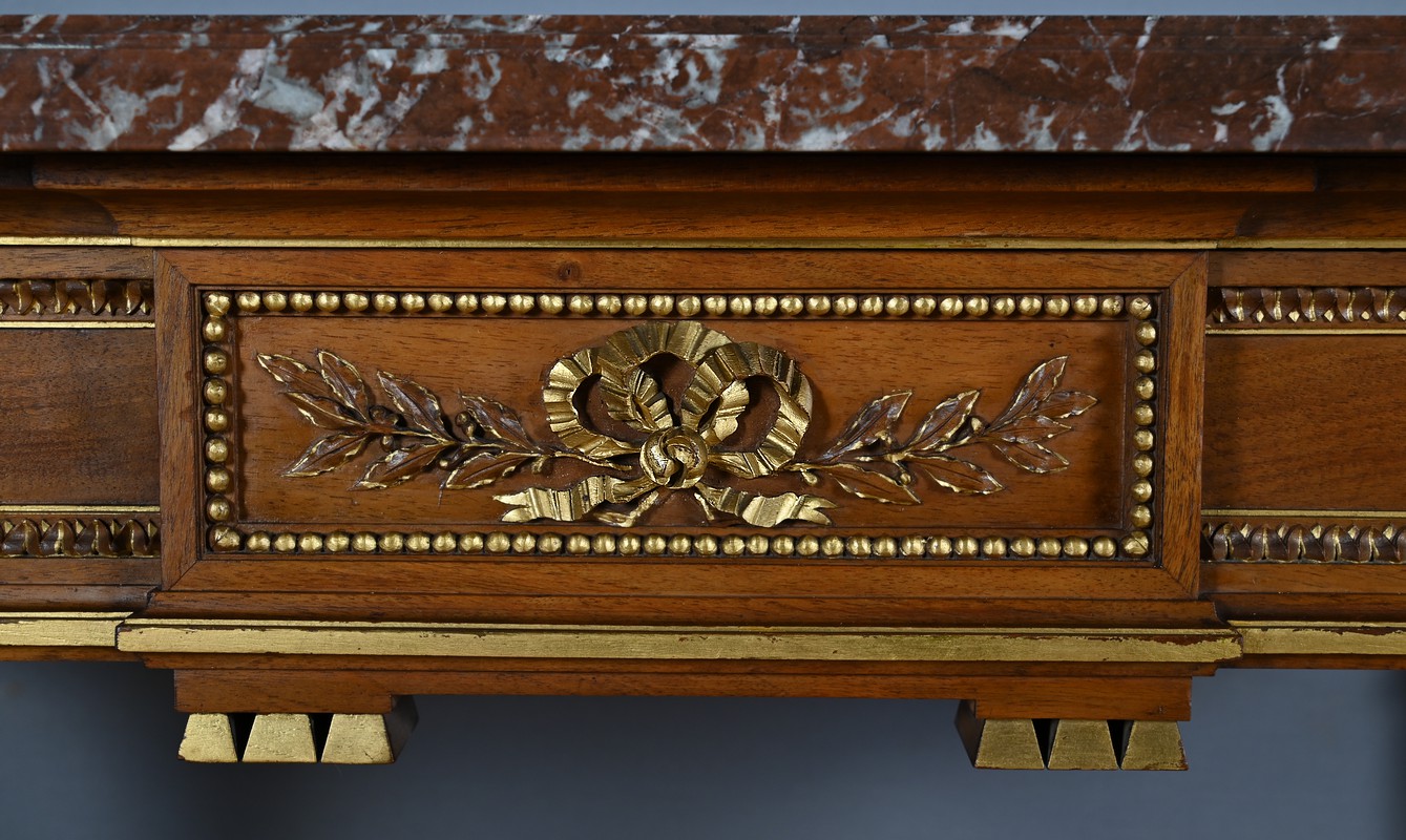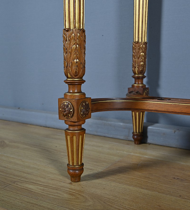 Élégante console en acajou mouluré et sculpté, partiellement rehaussée de dorure, illustrant avec raffinement l’esthétique néoclassique chère au style Louis XVI. La ceinture présente une riche ornementation composée de frises d’oves, de lauriers enrubannés, encadrés d’une frise de perles, témoignant d’un travail de sculpture minutieux et d’un goût affirmé pour les motifs antiques. Les quatre pieds fuselés, à cannelures dorées et finement sculptés, sont reliés par une entretoise galbée centrée d’une sculpture décorative, renforçant la stabilité tout en soulignant la symétrie de l’ensemble. Le dessus en marbre griotte, à bord sculpté en cavet renversé, parachève l’harmonie du meuble par son contraste noble et sa sobriété minérale. Une pièce décorative et structurée, idéale pour rehausser un intérieur classique ou dialoguer avec une mise en scène contemporaine.