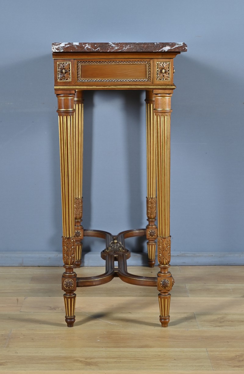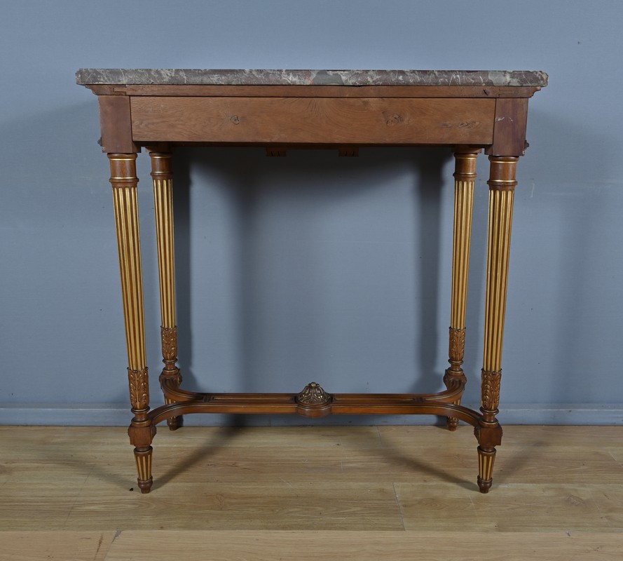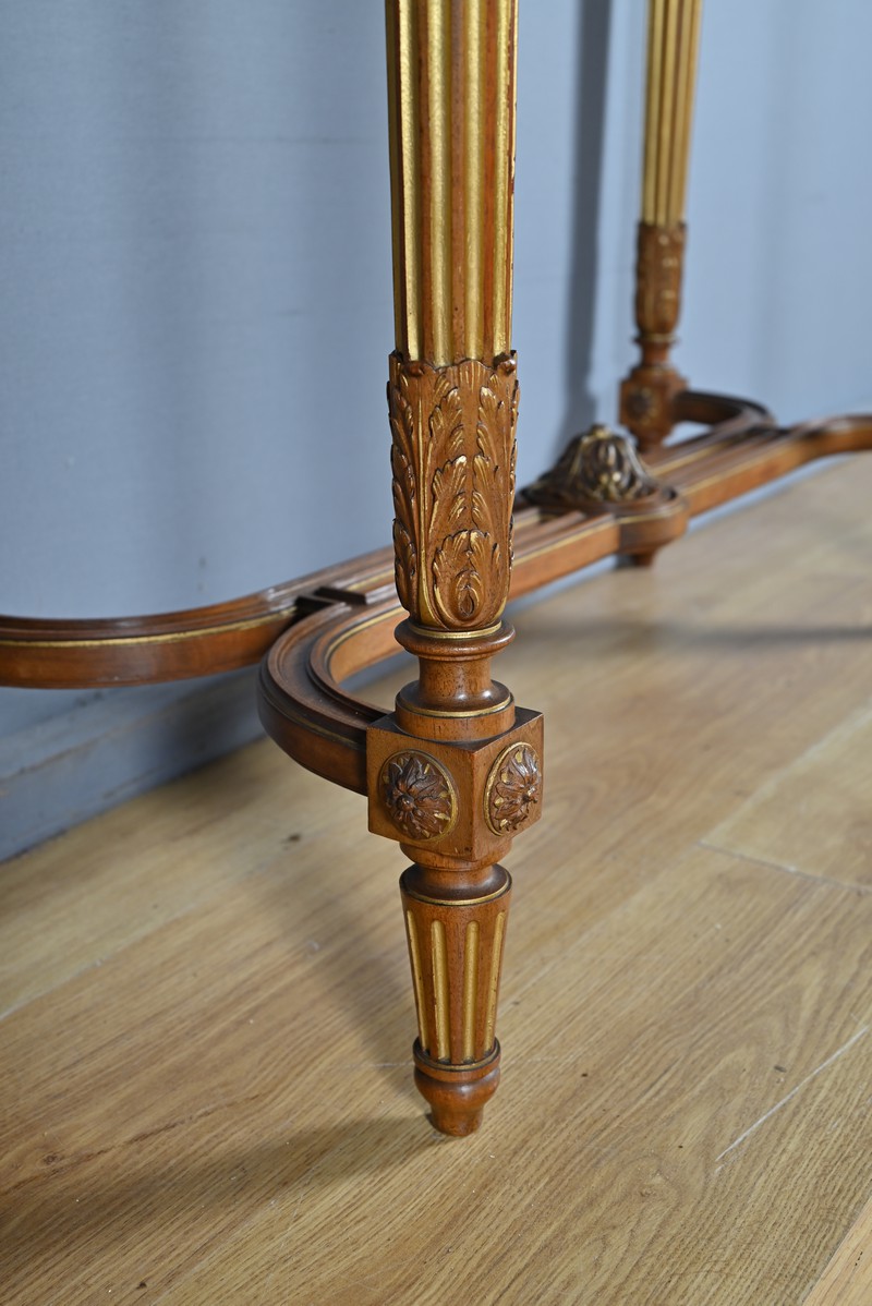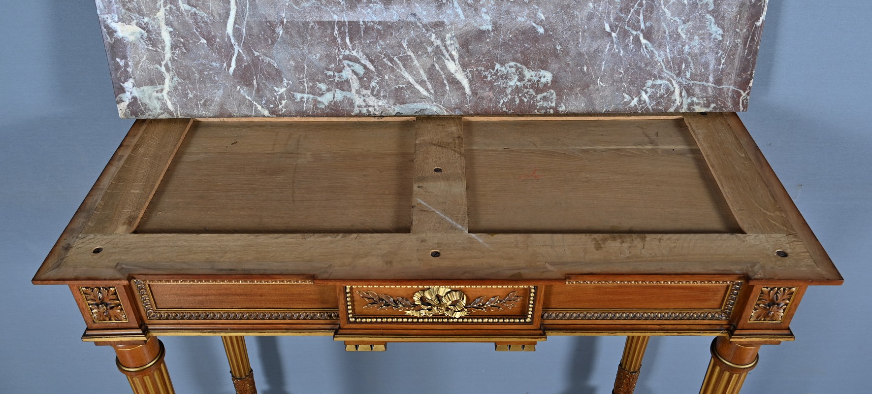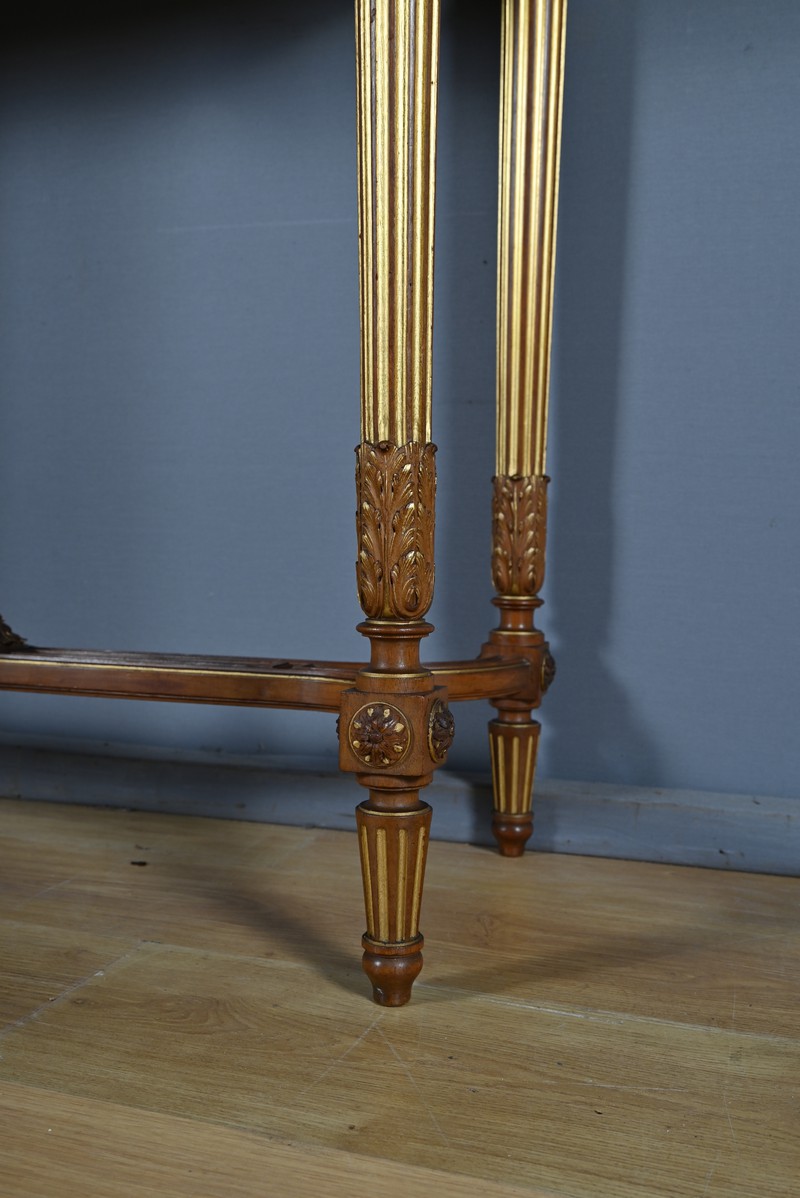 Élégante console en acajou mouluré et sculpté, partiellement rehaussée de dorure, illustrant avec raffinement l’esthétique néoclassique chère au style Louis XVI. La ceinture présente une riche ornementation composée de frises d’oves, de lauriers enrubannés, encadrés d’une frise de perles, témoignant d’un travail de sculpture minutieux et d’un goût affirmé pour les motifs antiques. Les quatre pieds fuselés, à cannelures dorées et finement sculptés, sont reliés par une entretoise galbée centrée d’une sculpture décorative, renforçant la stabilité tout en soulignant la symétrie de l’ensemble. Le dessus en marbre griotte, à bord sculpté en cavet renversé, parachève l’harmonie du meuble par son contraste noble et sa sobriété minérale. Une pièce décorative et structurée, idéale pour rehausser un intérieur classique ou dialoguer avec une mise en scène contemporaine.