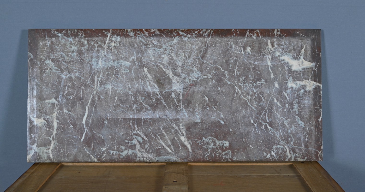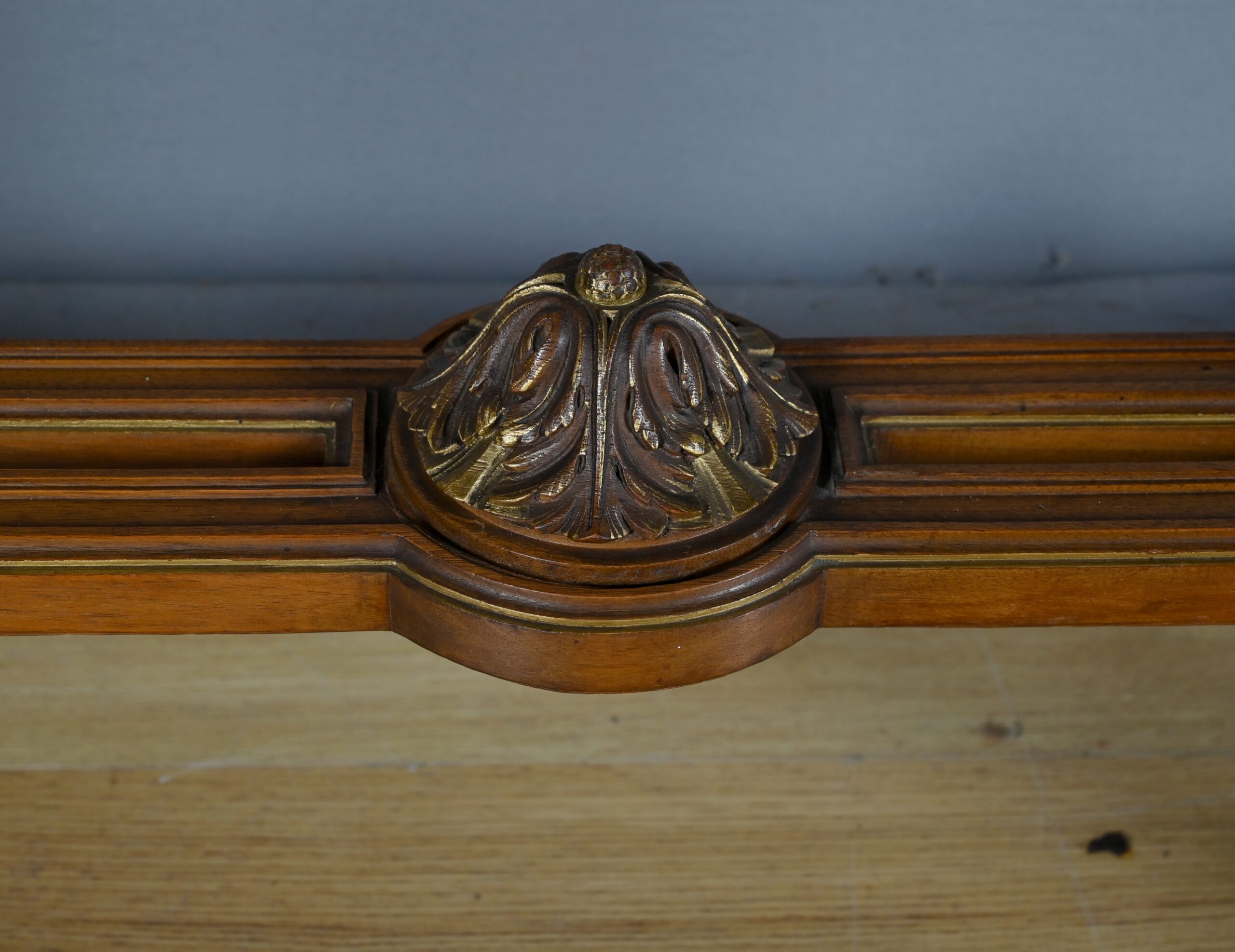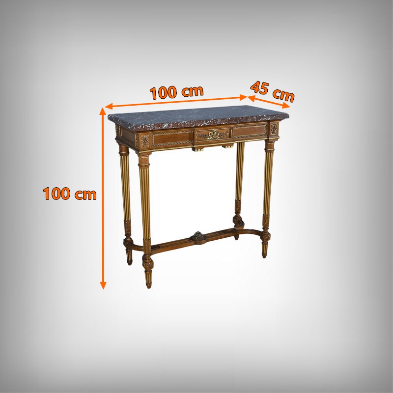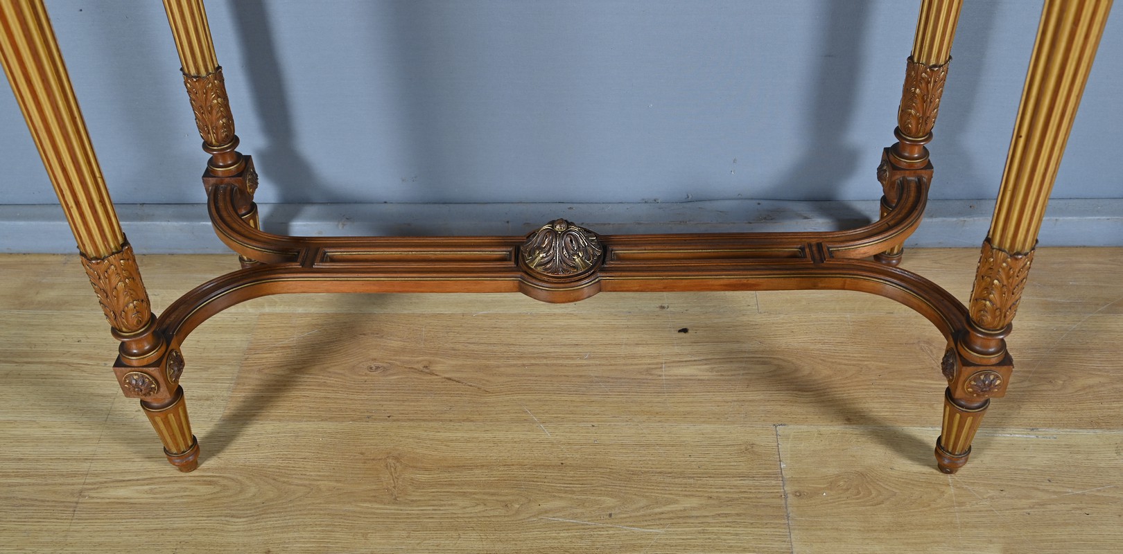 Élégante console en acajou mouluré et sculpté, partiellement rehaussée de dorure, illustrant avec raffinement l’esthétique néoclassique chère au style Louis XVI. La ceinture présente une riche ornementation composée de frises d’oves, de lauriers enrubannés, encadrés d’une frise de perles, témoignant d’un travail de sculpture minutieux et d’un goût affirmé pour les motifs antiques. Les quatre pieds fuselés, à cannelures dorées et finement sculptés, sont reliés par une entretoise galbée centrée d’une sculpture décorative, renforçant la stabilité tout en soulignant la symétrie de l’ensemble. Le dessus en marbre griotte, à bord sculpté en cavet renversé, parachève l’harmonie du meuble par son contraste noble et sa sobriété minérale. Une pièce décorative et structurée, idéale pour rehausser un intérieur classique ou dialoguer avec une mise en scène contemporaine.