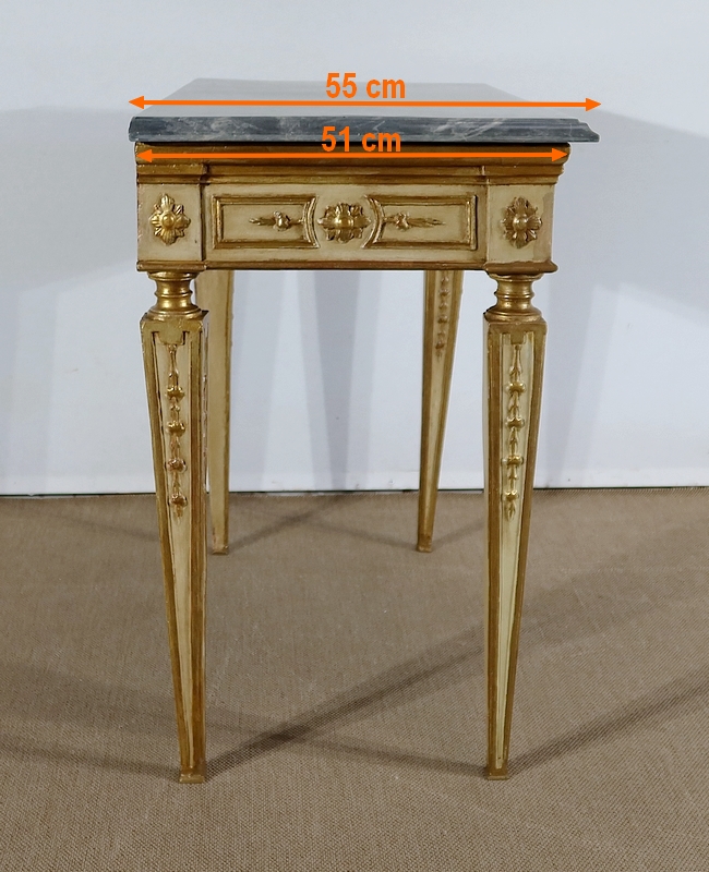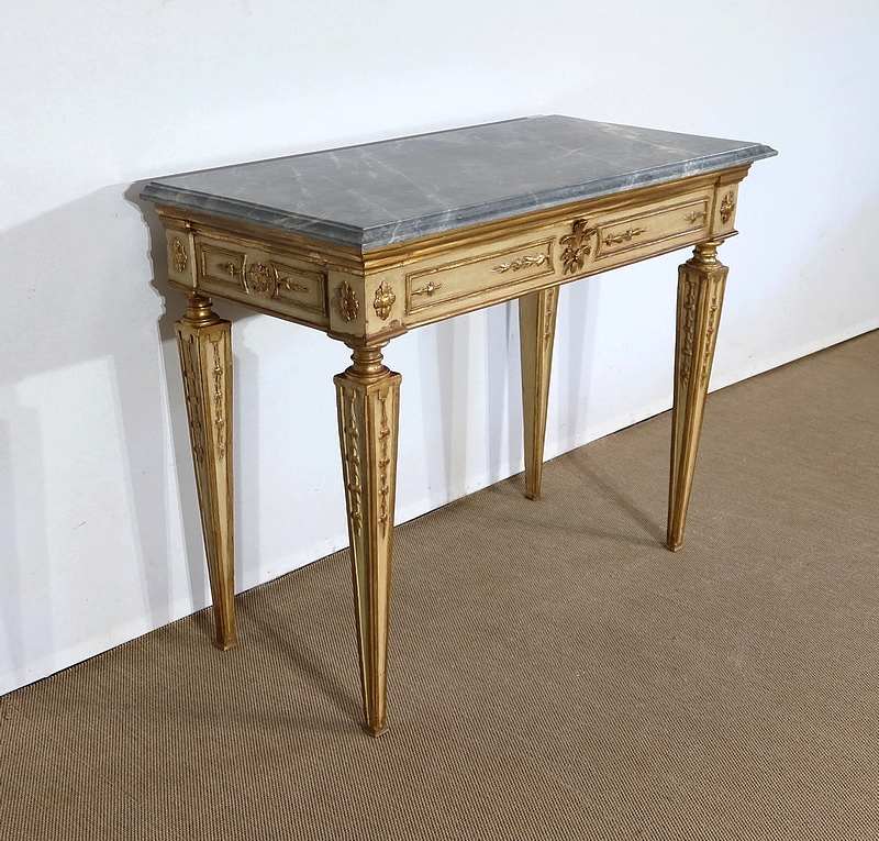 Belle et élégante console Louis XVI en bois sculpté, peint et doré, coiffée d’un marbre gris.