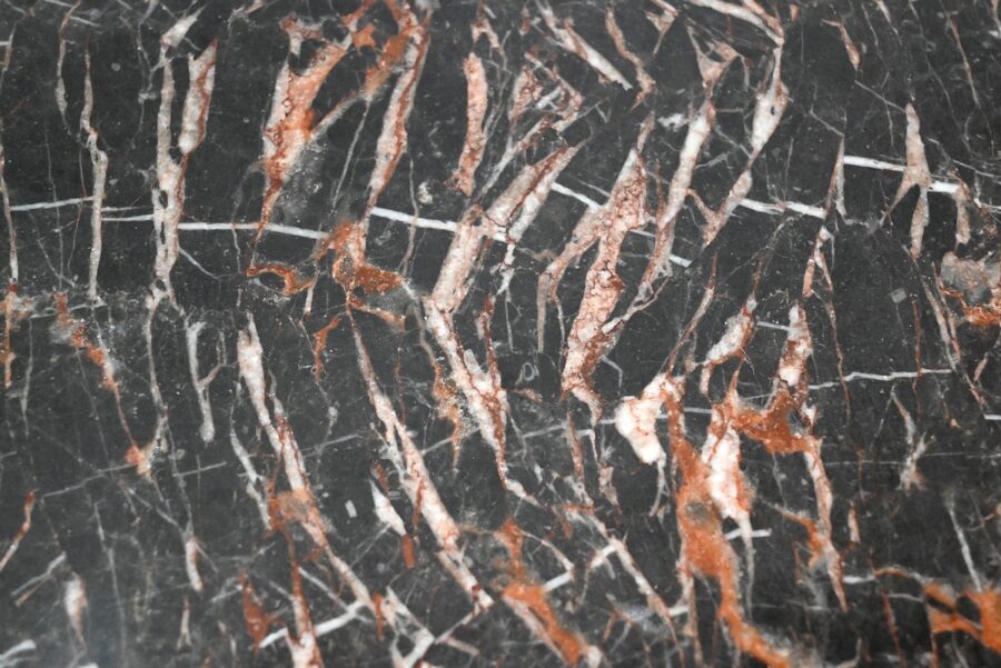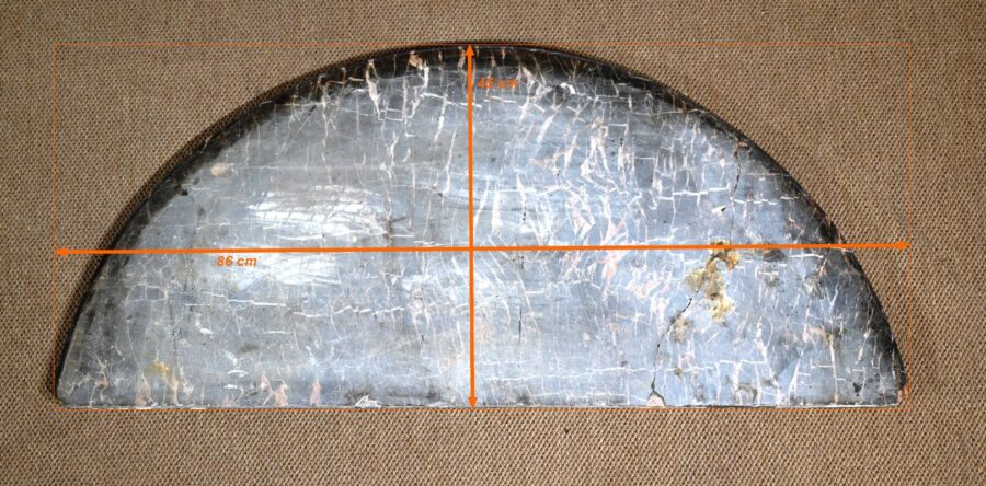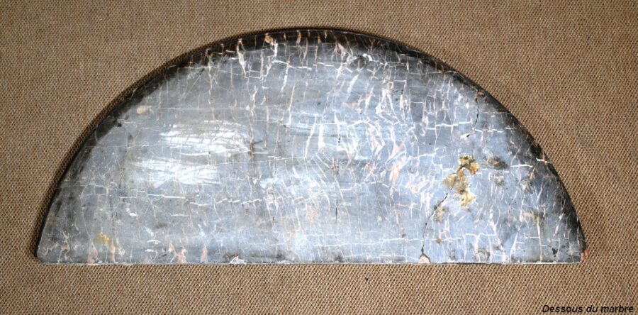 Console demi-lune composée d’un marbre anthracite à fibres blanches, beiges et terre de Sienne, dont le chant est mouluré en demi rond.