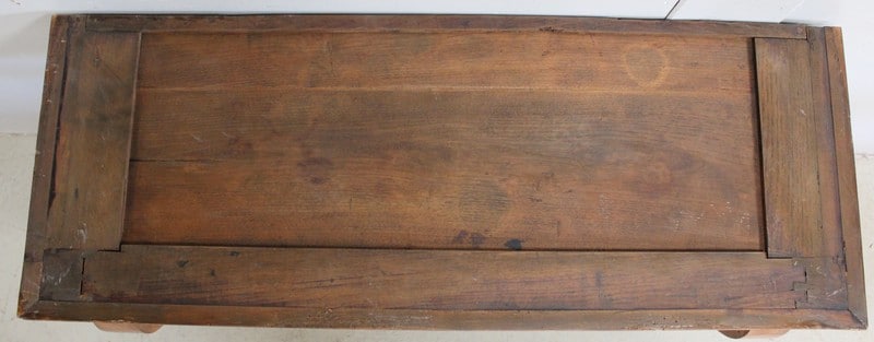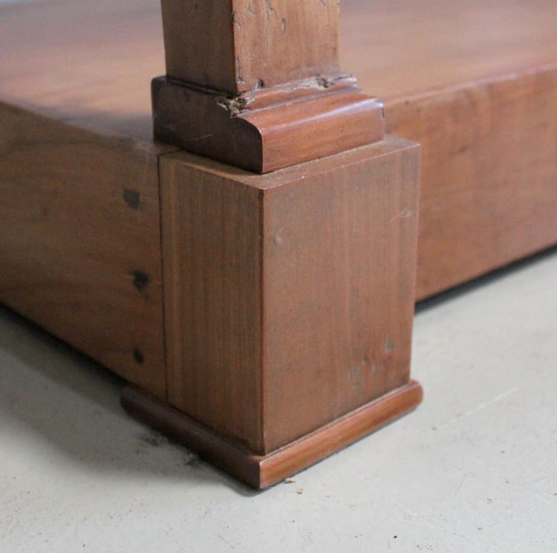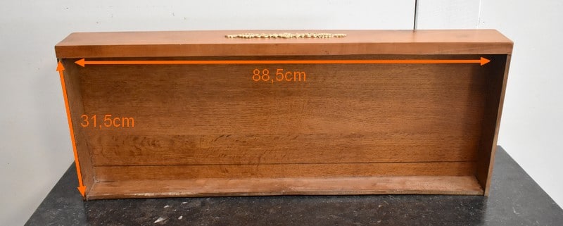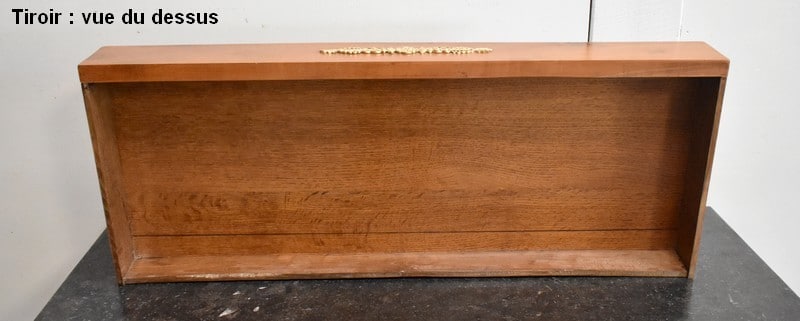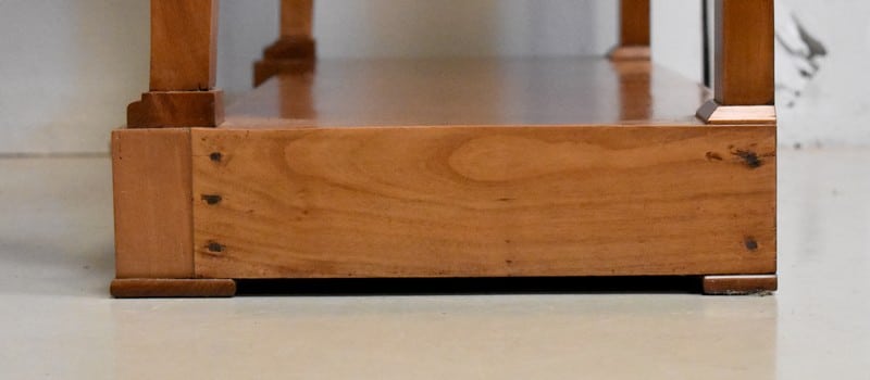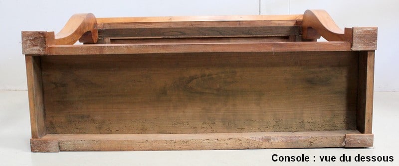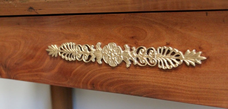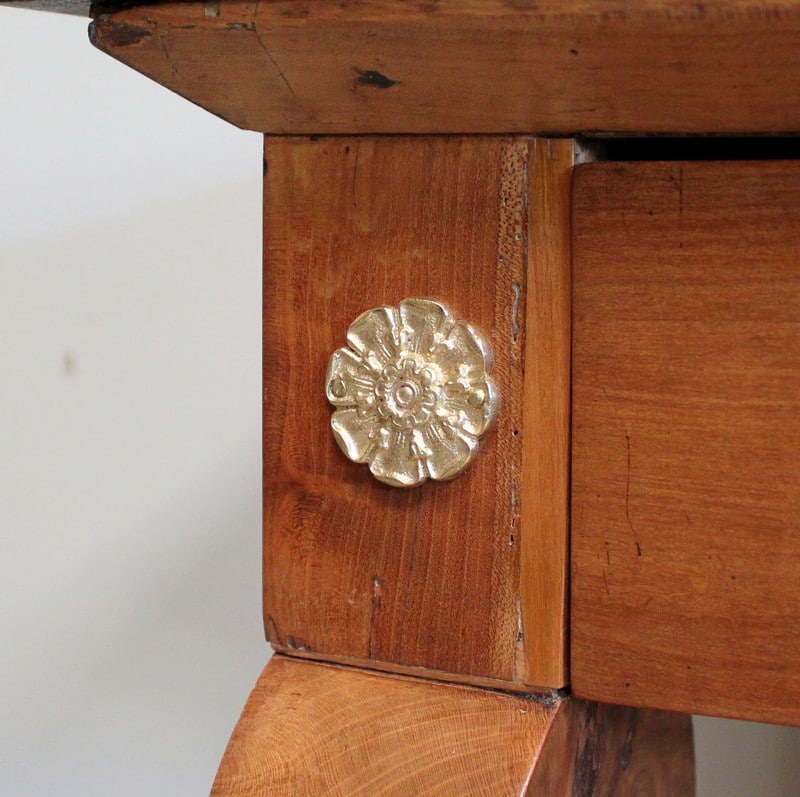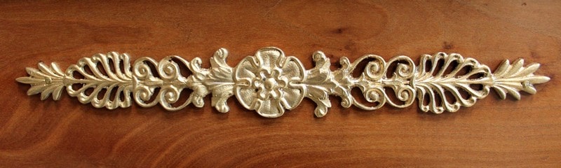 Elle ouvre en ceinture par un tiroir offrant un espace de rangement sur 10.5 cm de profondeur. Il est orné en son centre d’une Palmette Restauration en Bronze.