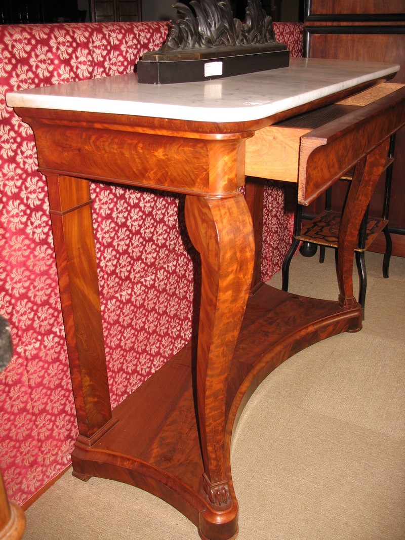 Console Restauration en acajou et placage d’acajou ayant beaucoup de finesse et de sobriété. Dessus marbre blanc. 1 tiroir. Première partie du XIXe (1830)