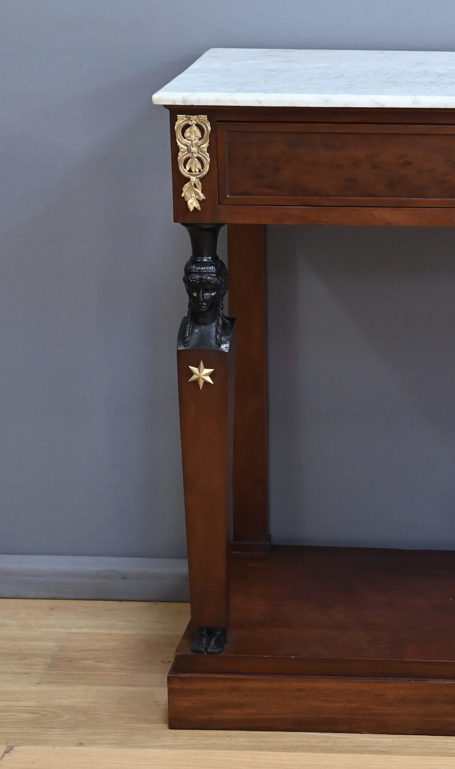 Cette somptueuse console en acajou et placage d’acajou, datant du début du XIXe siècle, incarne toute la grandeur du style Empire et l’influence du goût pour l’Égypte antique qui marqua cette époque. Elle constitue une pièce rare, à la fois décorative et historique.