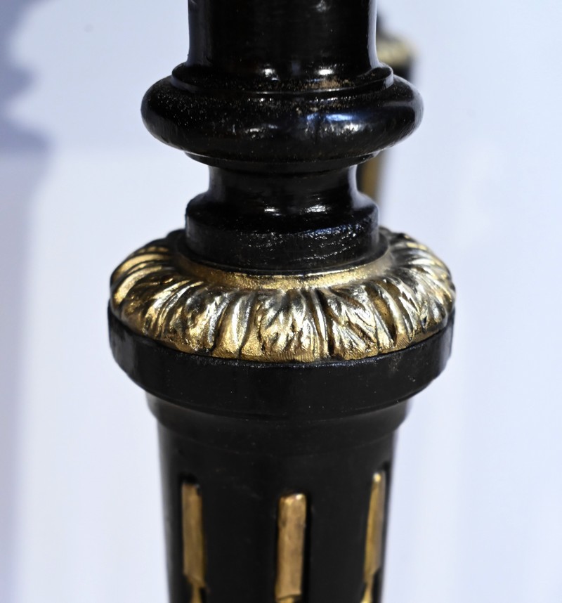 L’ensemble repose sur quatre pieds en fuseau, à collerettes et à cannelures arrêtées garnies d’asperges, se terminant par des toupies.