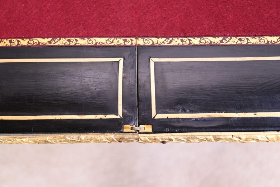 Ce double plateau, bordé d’une moulure en bronze à décors d’asperges enrubannées, pivote sur un axe et se déploie afin d’offrir une table de jeux tendue d’une feutrine couleur sang de bœuf avec galon en cuir à motifs dorés et filets laiton sur le pourtour de cet espace.