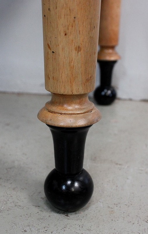 L’ensemble repose sur quatre pieds, dont la partie supérieure est tournée, façonnée ‘en Bobines’, tandis que celle du bas est plus Sobre. Ils sont reliés à mi hauteur par un plateau d’entretoise pouvant faire office de tablette de réception. Chacun de ces montants est terminé par un pied noirci, en Boule, rappelant l’époque Napoléon III et donnant une subtile particularité à ce meuble relativement atypique.