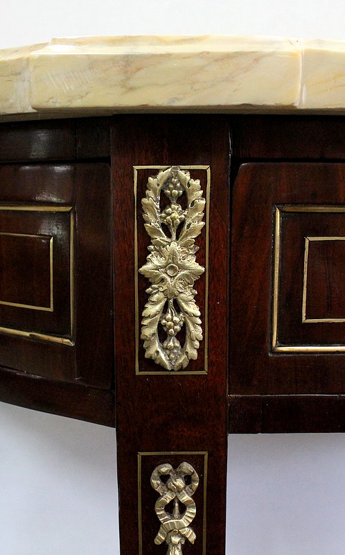 En partie inférieure, les Pieds sont entourés d’une Bague en Bronze, puis se profilent en Gaine sur les quatre faces ornées d’incrustation de Filet, et se terminent par des Sabots en Laiton.