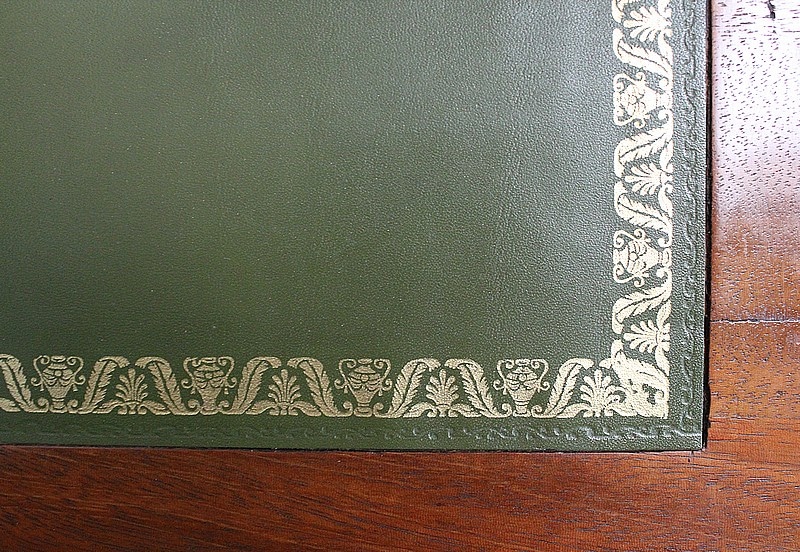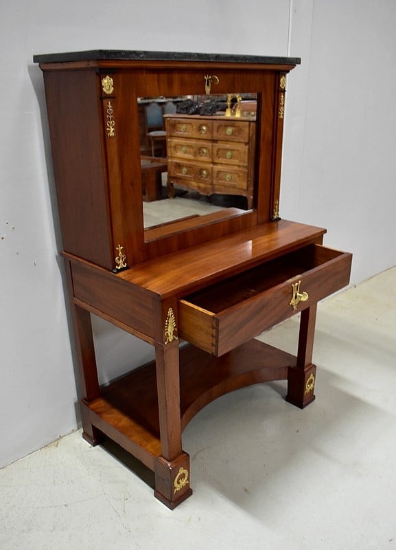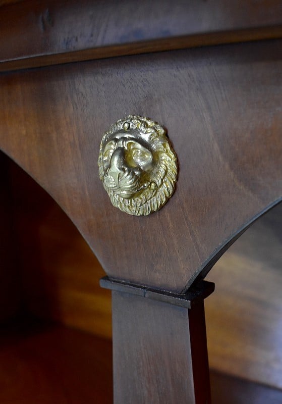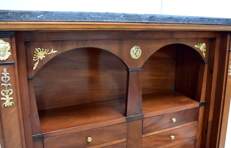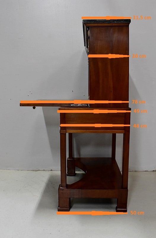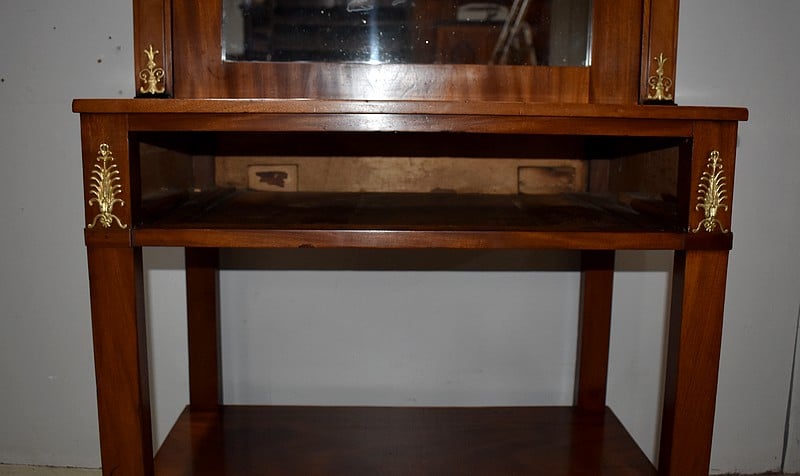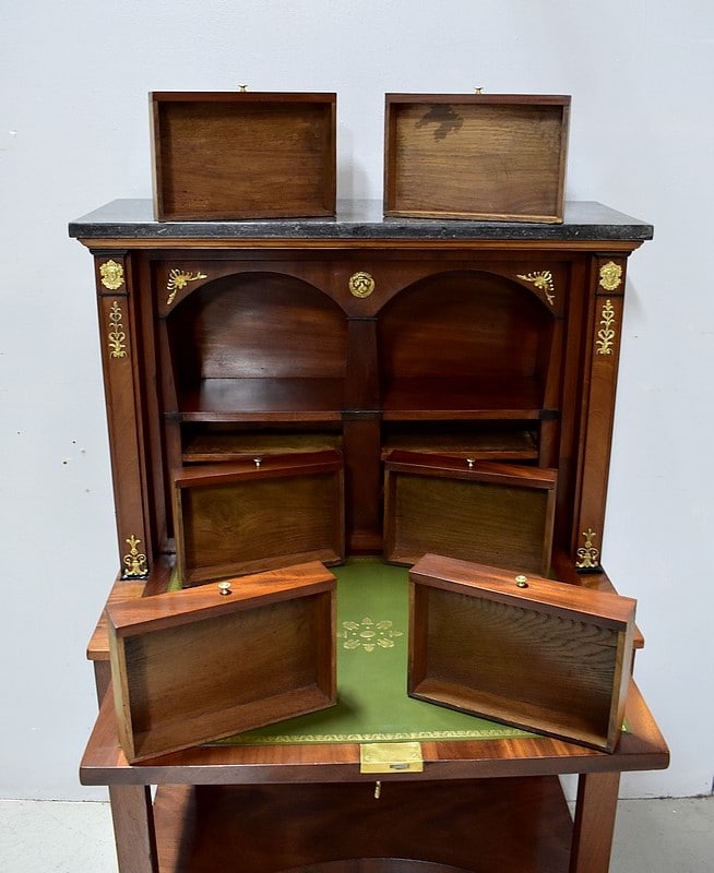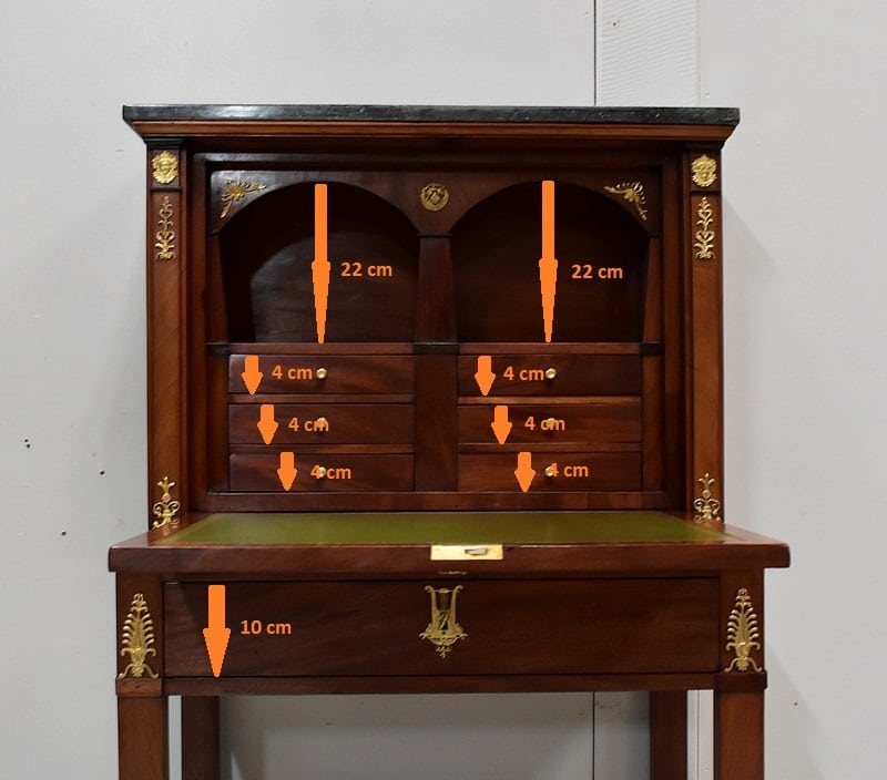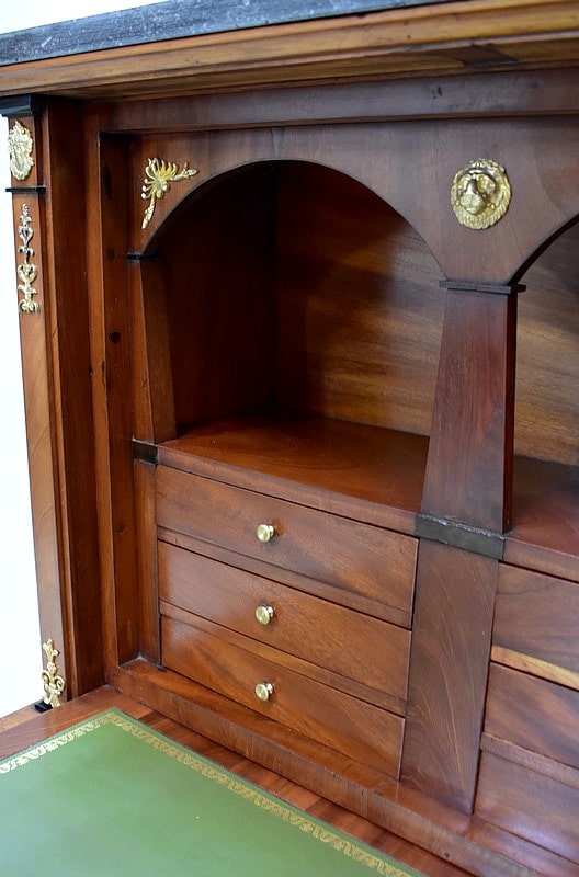 La partie haute formant Secrétaire ouvre par un abattant garni en façade d’un miroir rectangulaire. Il découvre six petits tiroirs à boutons de tirage ciselés. Cet espace se compose également d’une niche, enjolivée sur le devant par un panneau découpé en arches soutenues par des colonnes. Ce Décor est orné de Bronzes : écoinçons en ses angles, tête de Lion en son milieu. La zone de travail est recouverte d’un cuir Vert actuel, agrémenté d’une Vignette centrale et, en bordure, de deux frises, l’une Dorée, l’autre, plus discrète, sur fond dur.