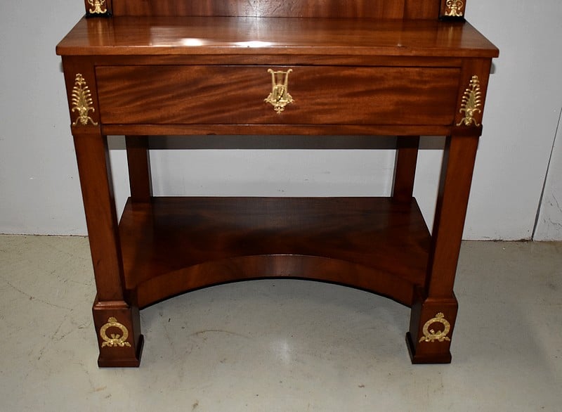 La partie basse, plus large que la première, s’apparente à une Console, ouvrant en ceinture par un tiroir monté en Queues d’Aronde. Elle repose sur quatre montants droits, terminés par quatre pieds de dimensions plus importantes, et reliés entre eux par une entretoise à la façade concave.