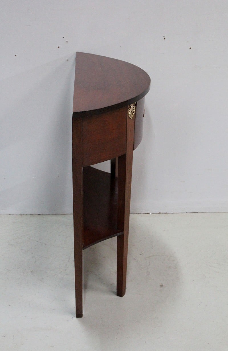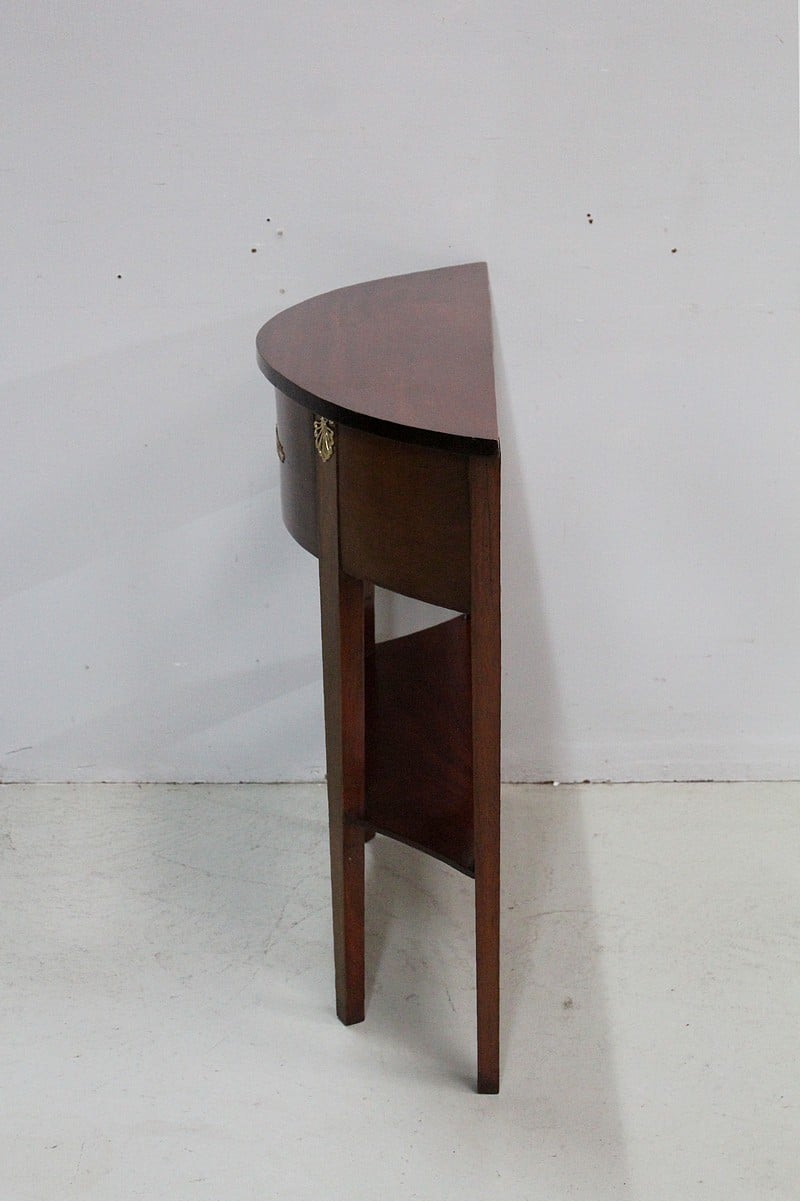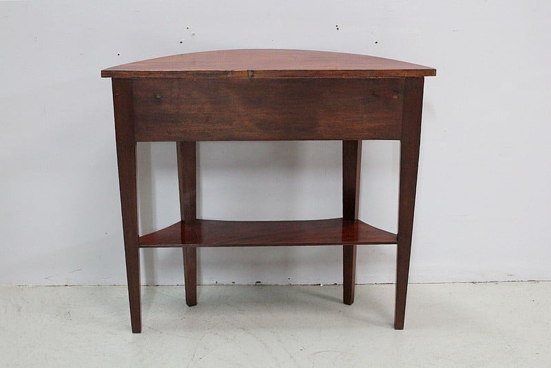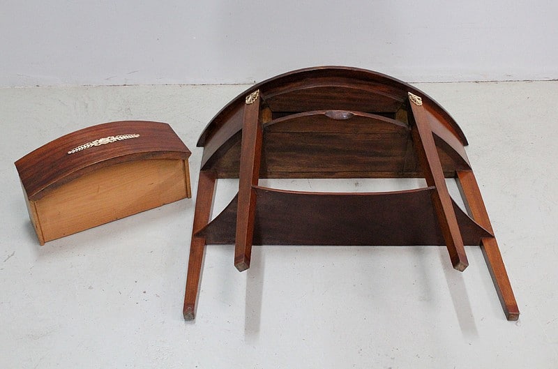En partie basse, ses 4 pieds droits gainés sont entretoisés d’une tablette trapézoïdale aux bordures concaves.