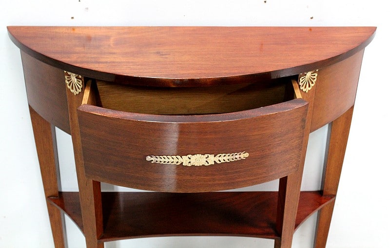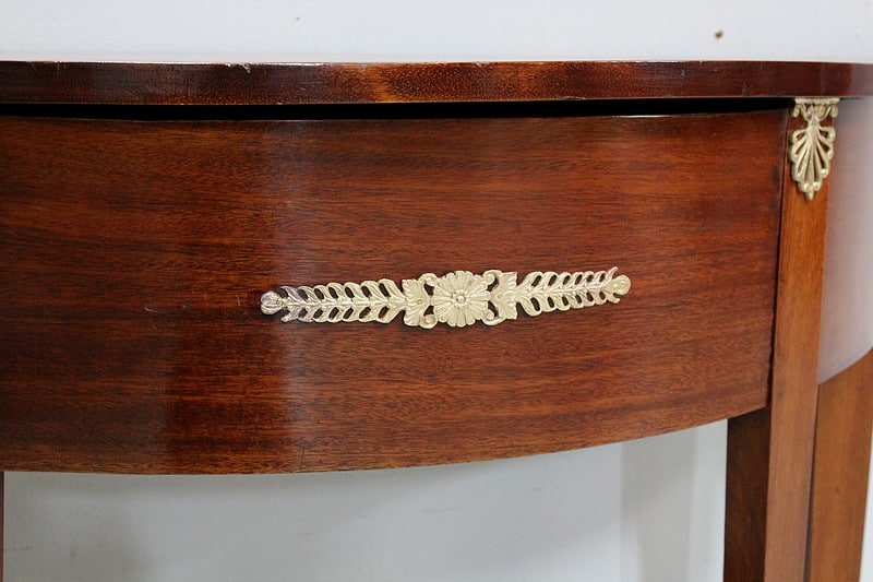 Elle ouvre par un tiroir en ceinture orné d’un motif central en bronze de palmettes en miroir.