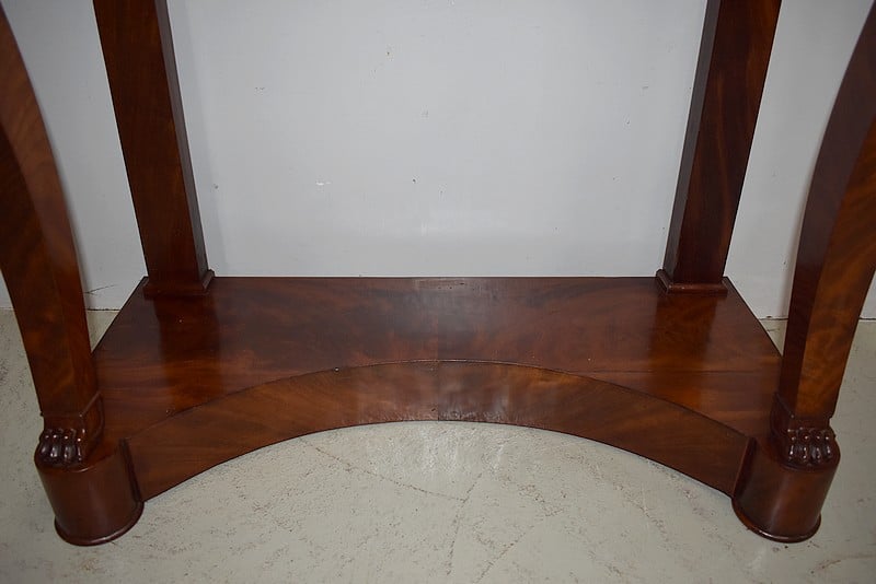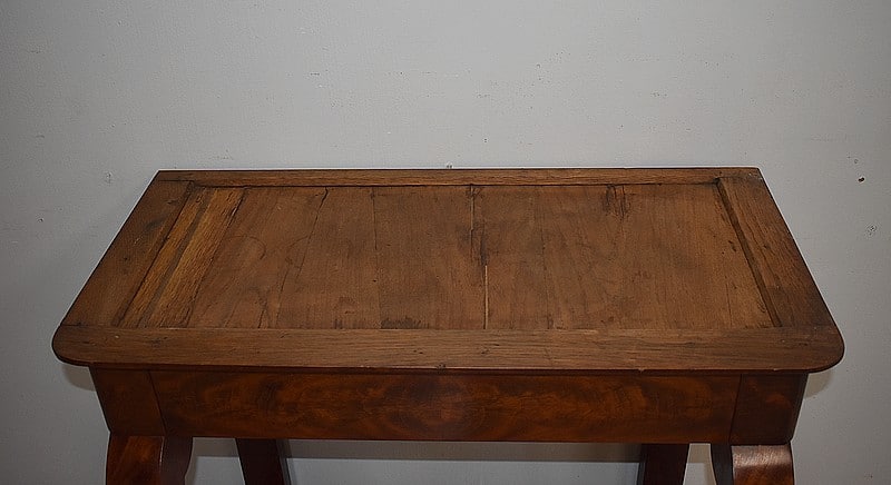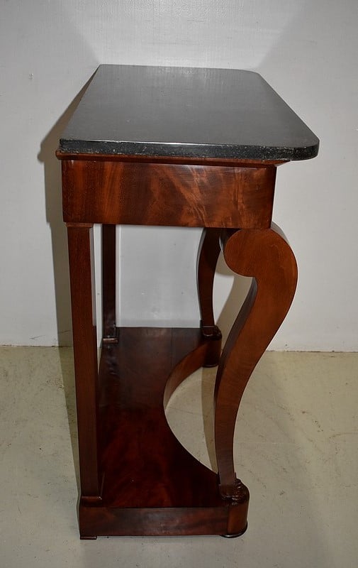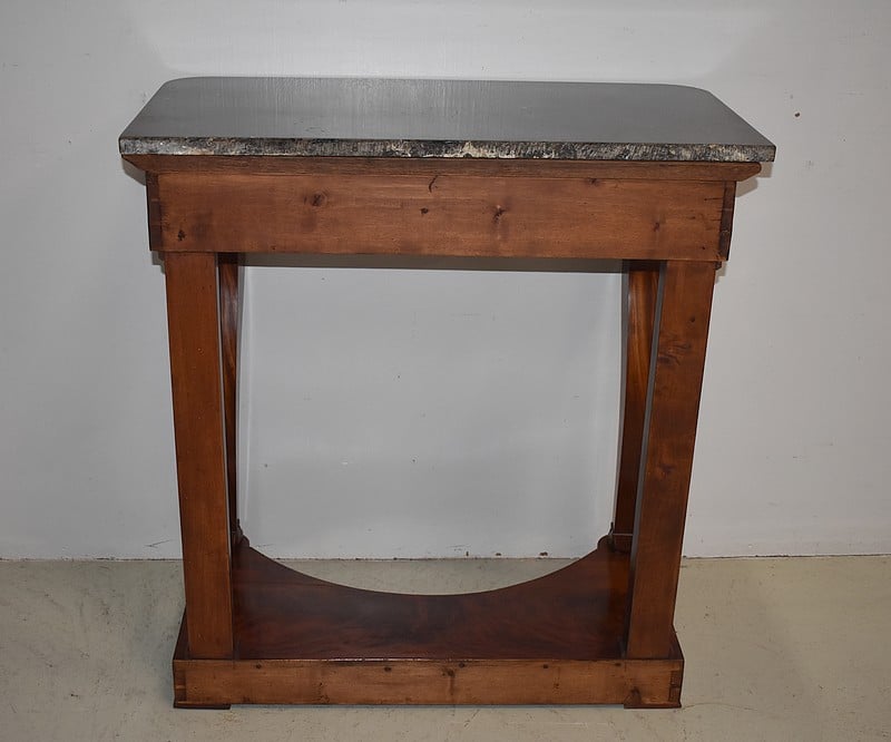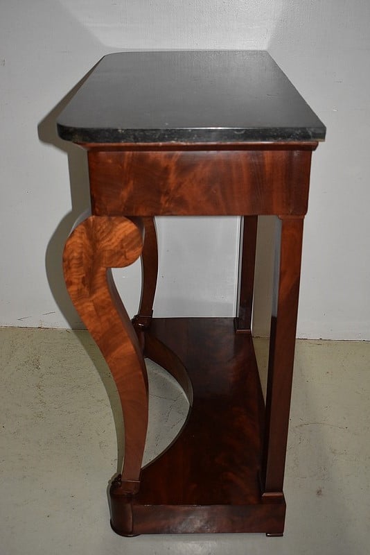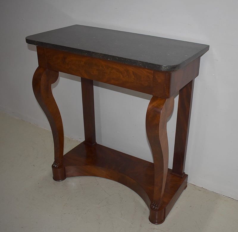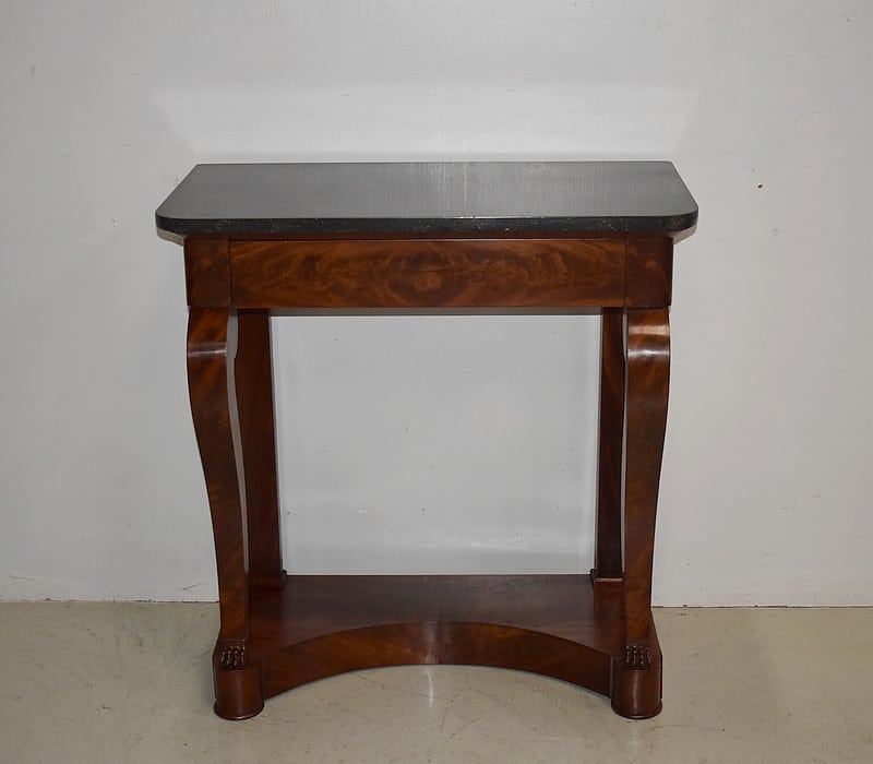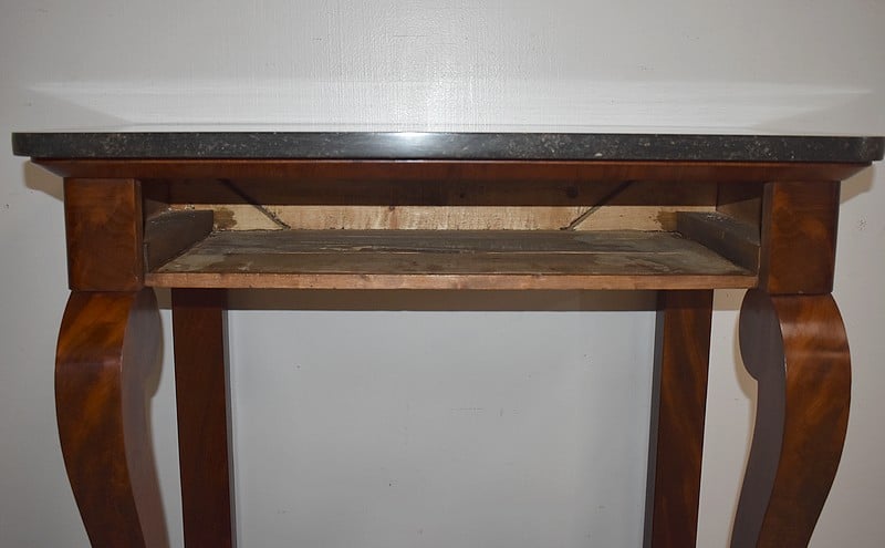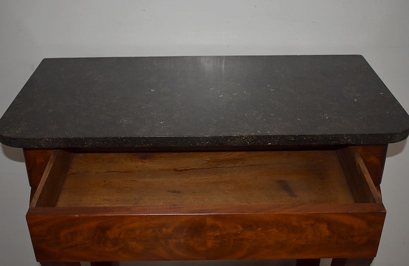 Petite console Restauration en placage de ronce d’acajou avec dessus de marbre granité noir (anthracite) d’origine.