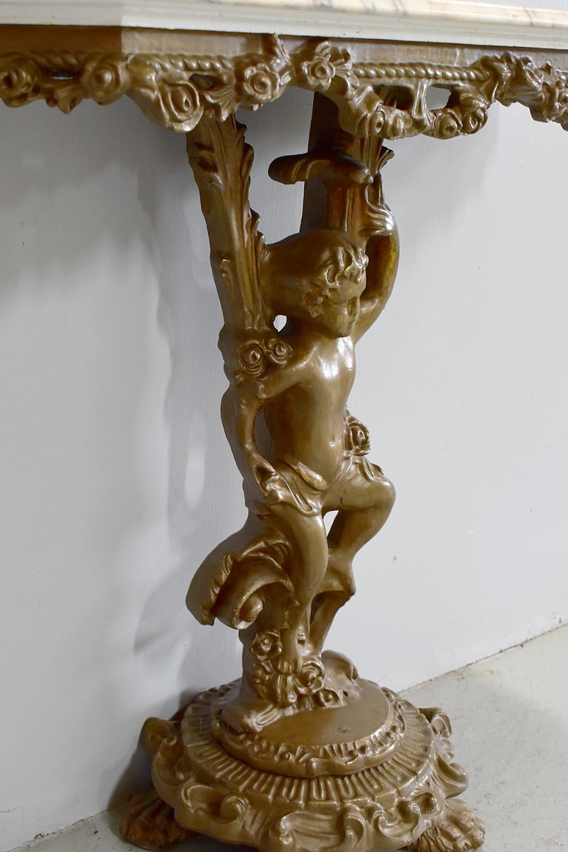 Petite console en bois sculpté et patiné vieux bronze avec son dessus en marbre couleur crème veiné de gris et rose.